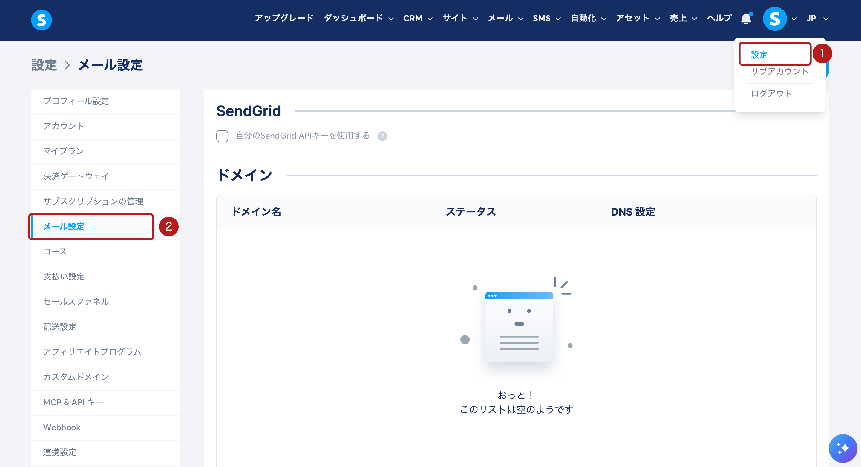 プロフィール画像にカーソルを合わせ、設定(1)をクリックします。設定メニューで、メール設定(2)をクリックします。
