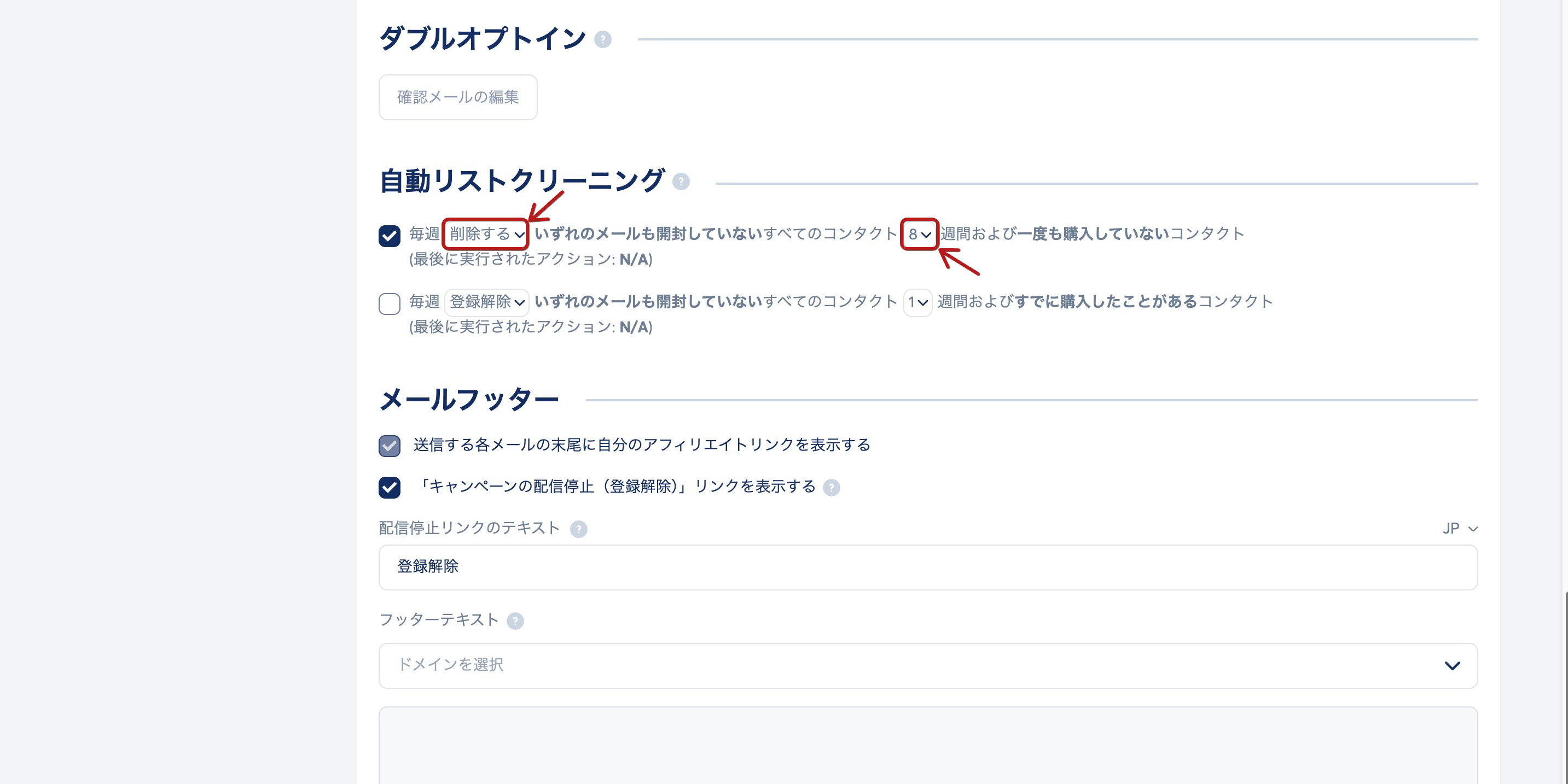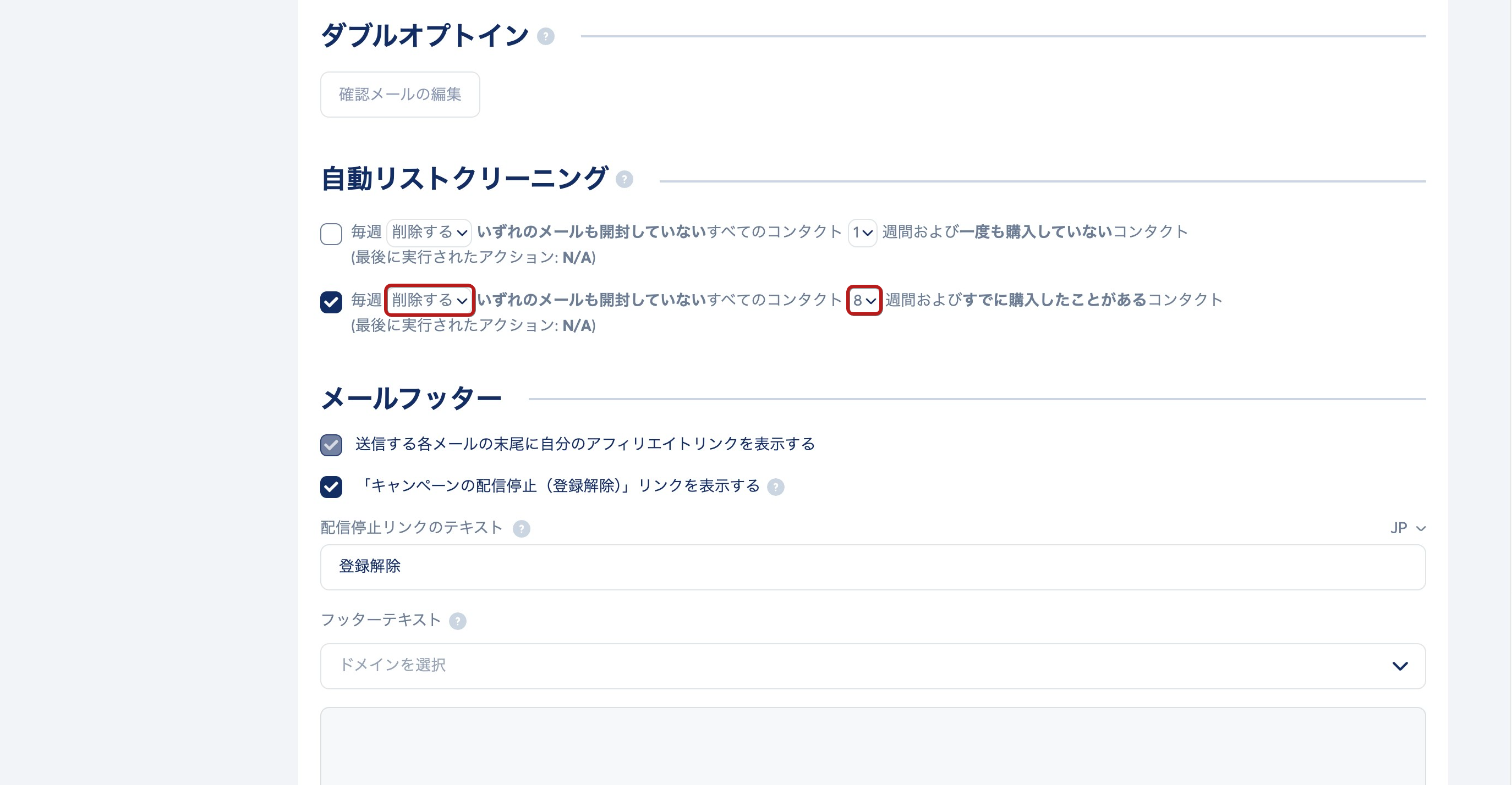 「毎週 削除する いずれのメールも開封していないすべてのコンタクト 8 週間および すでに購入したことがあるコンタクト」にチェックを入れます。