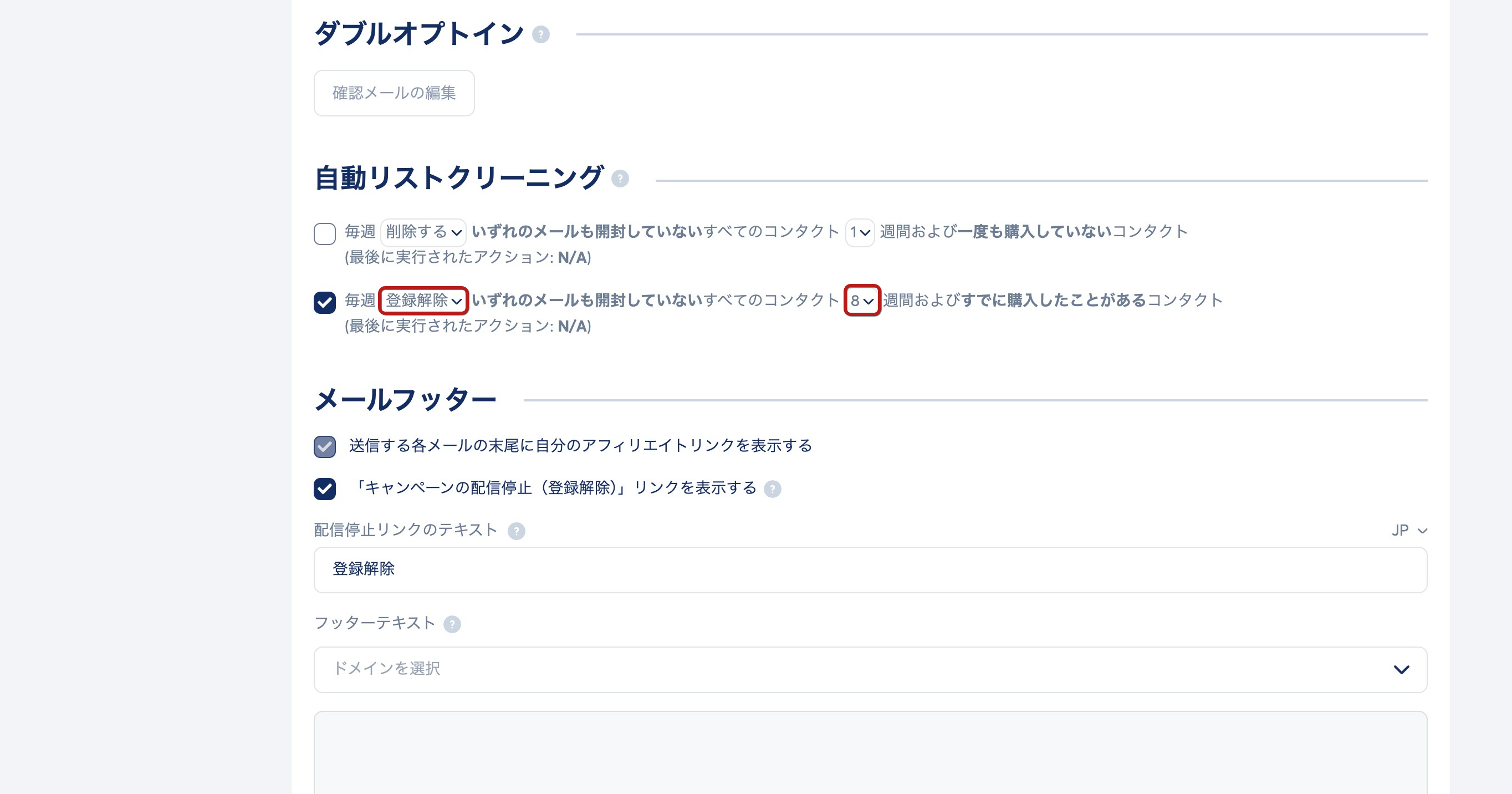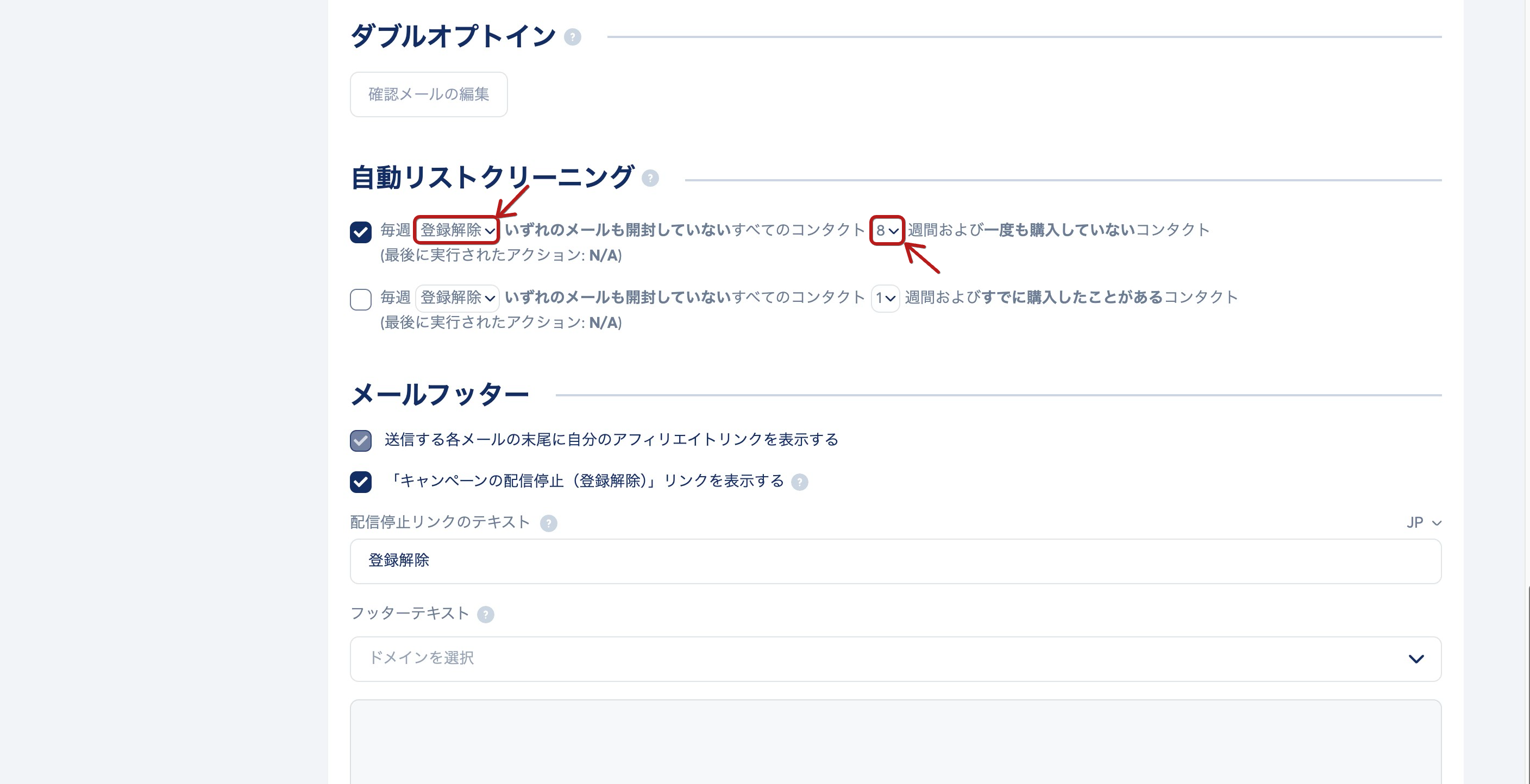 「毎週 登録解除 いずれのメールも開封していないすべてのコンタクト 8 週間および 一度も購入していないコンタクト」にチェックを入れます。