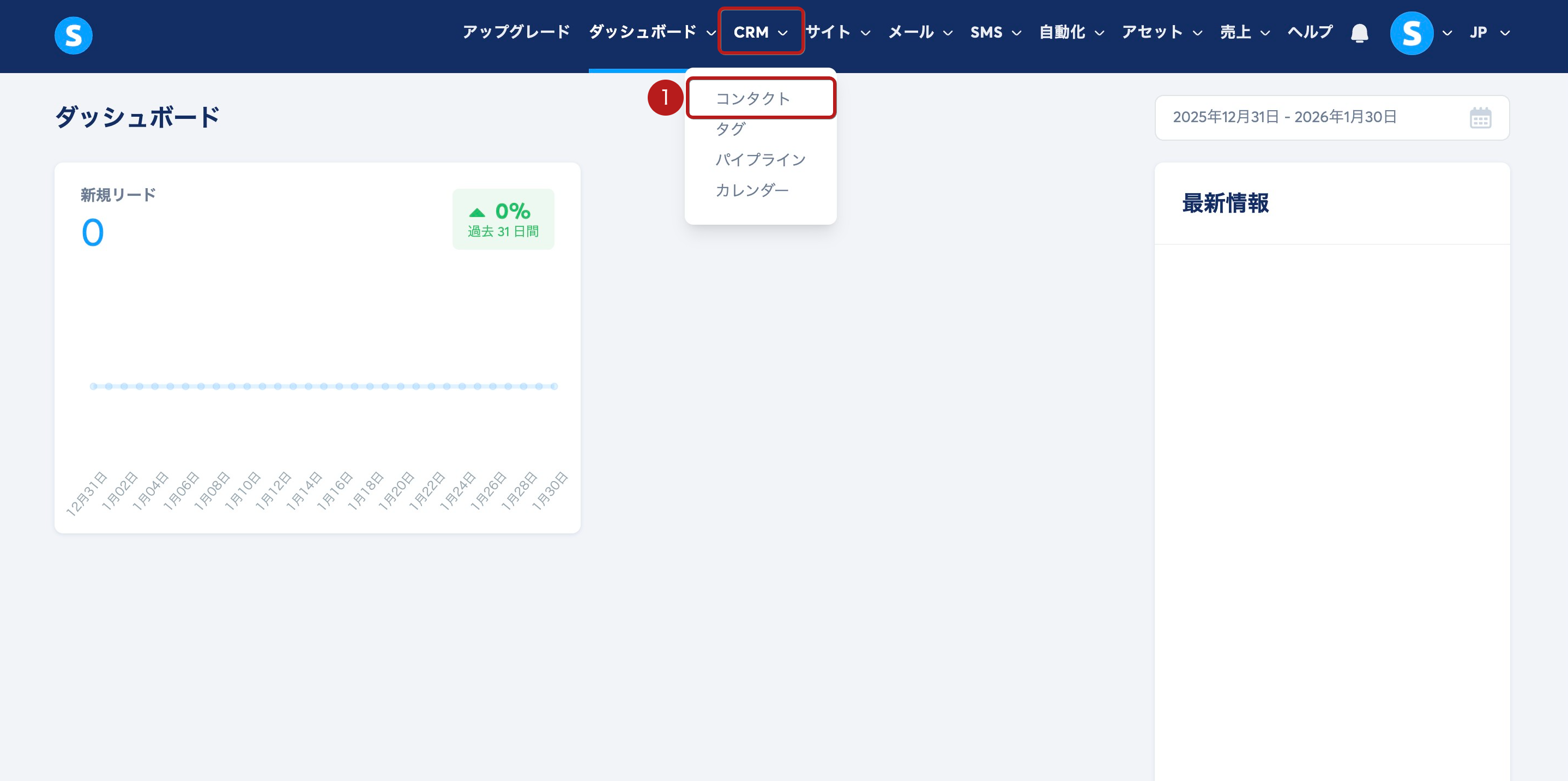 CRM メニューの コンタクト (1) をクリックします。