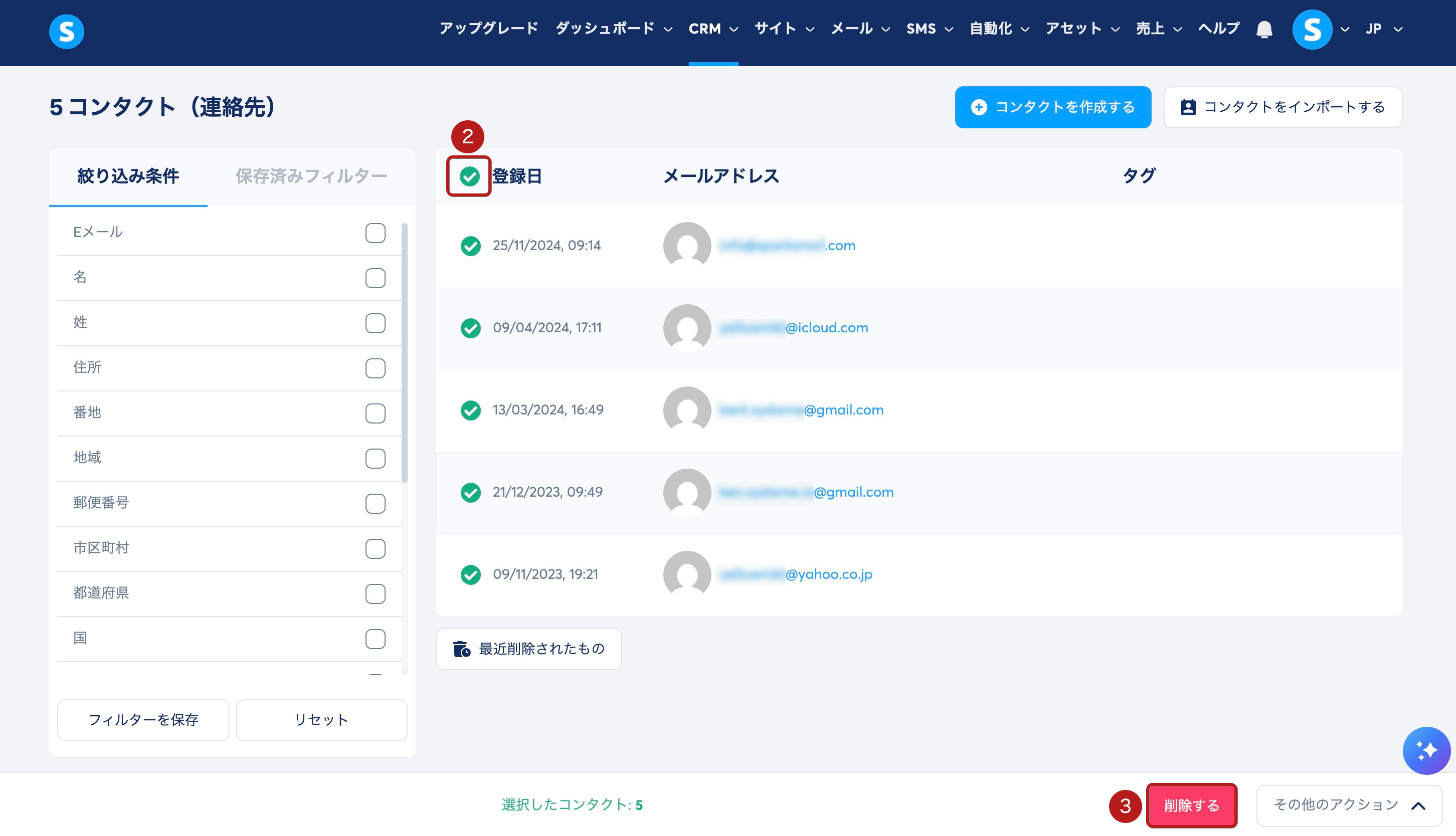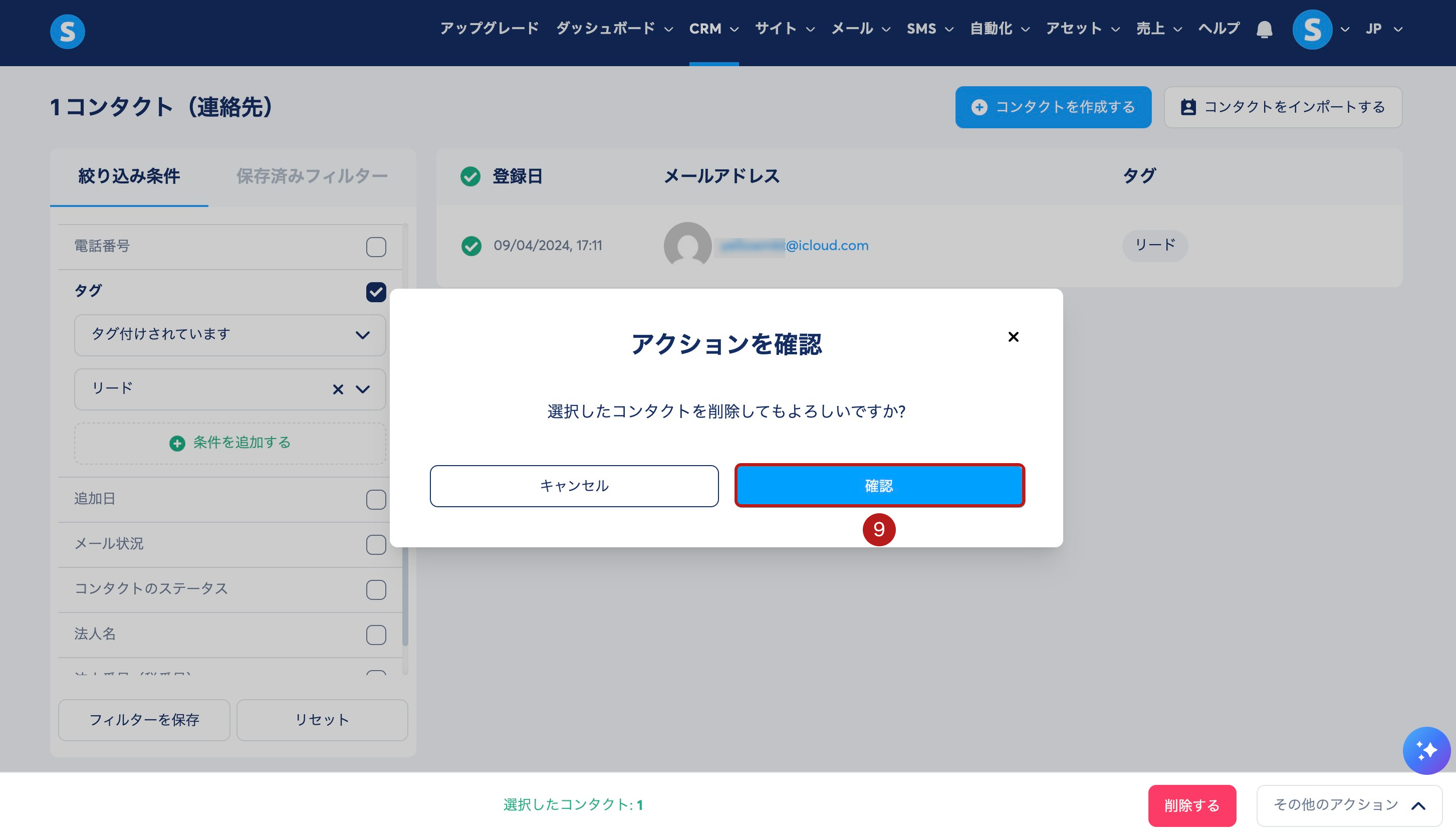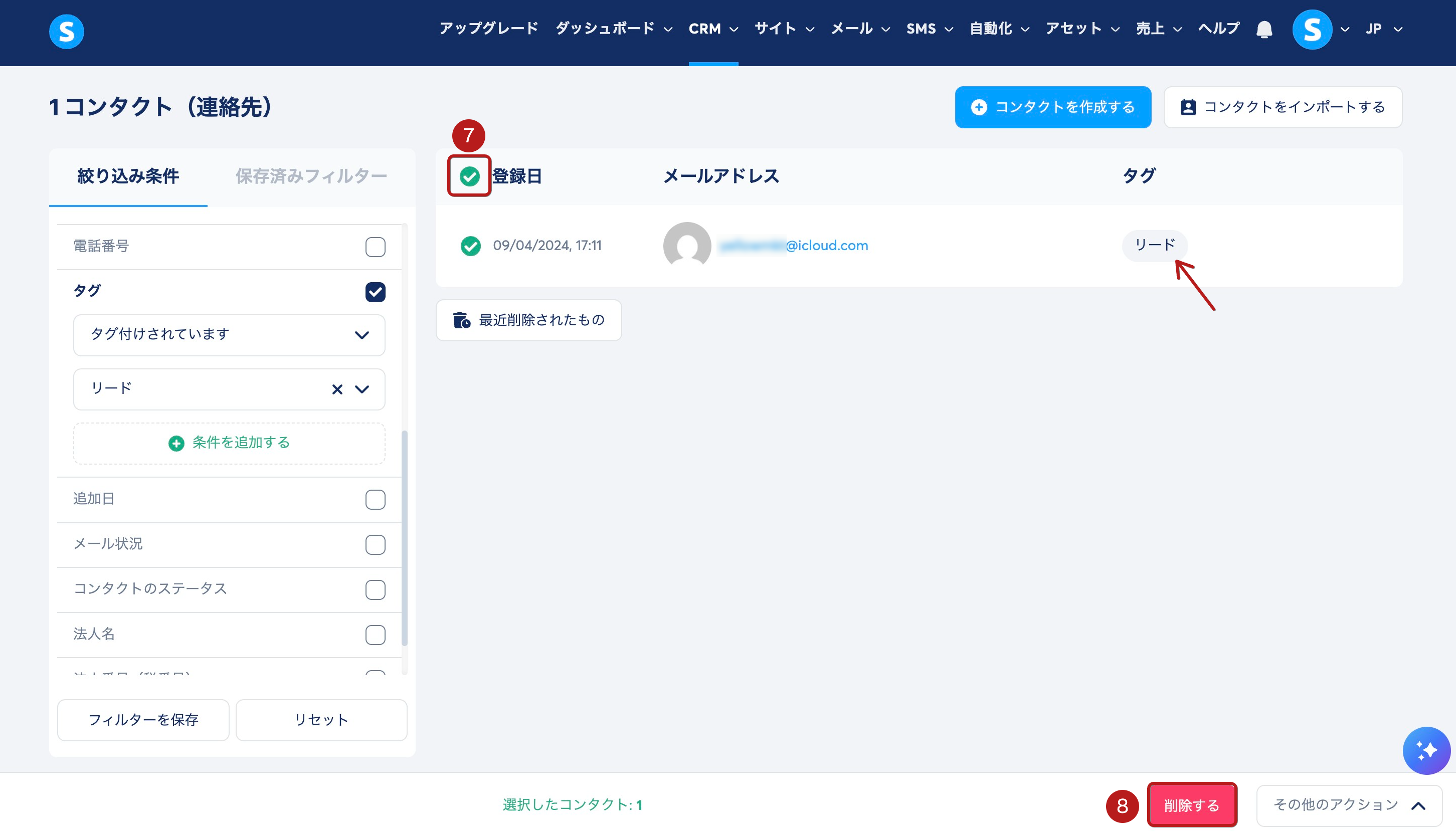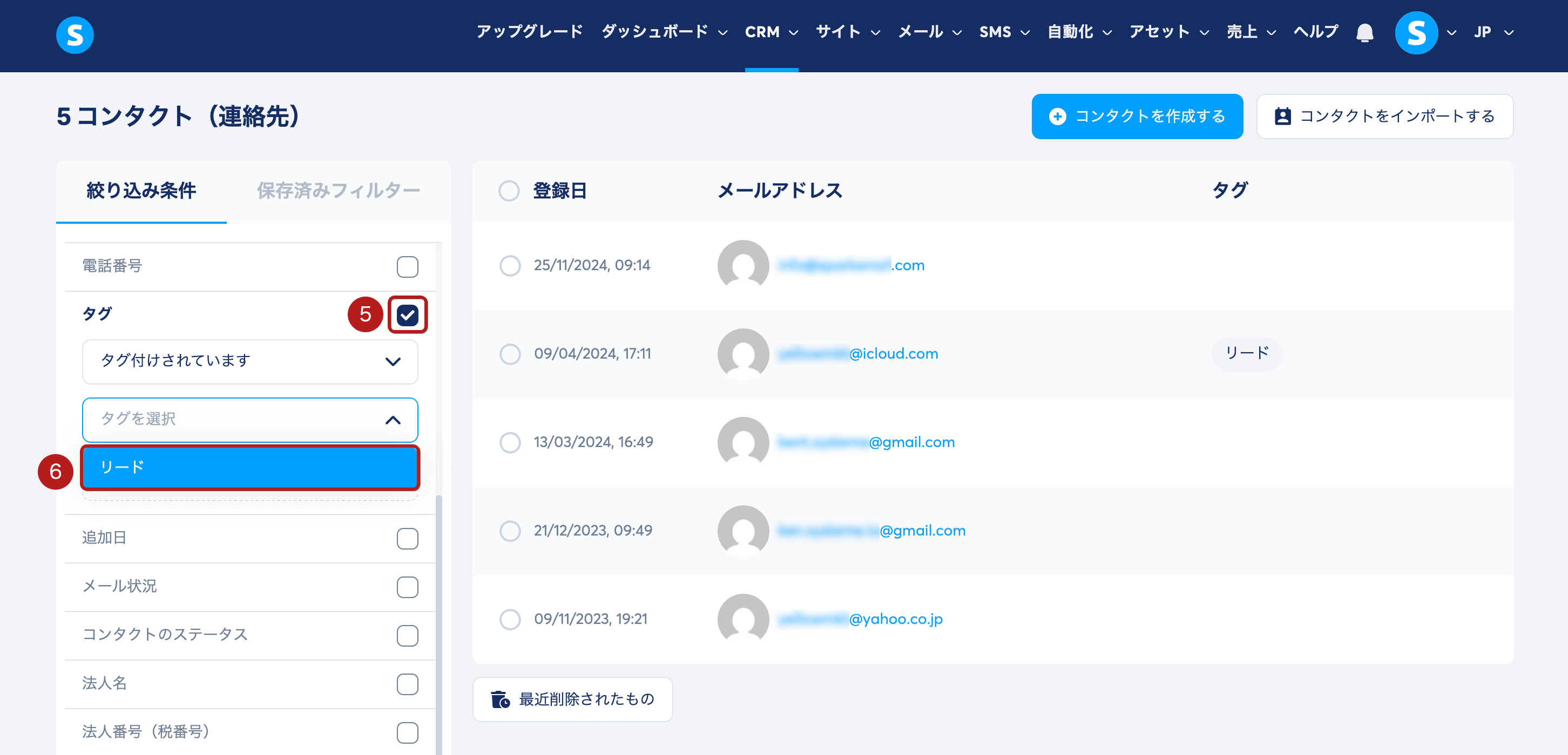 例えば、リードというタグが付いたすべてのコンタクトを削除したい場合は、タグ フィルター (5) を選択し、タグ一覧から リード(6) を選択します。