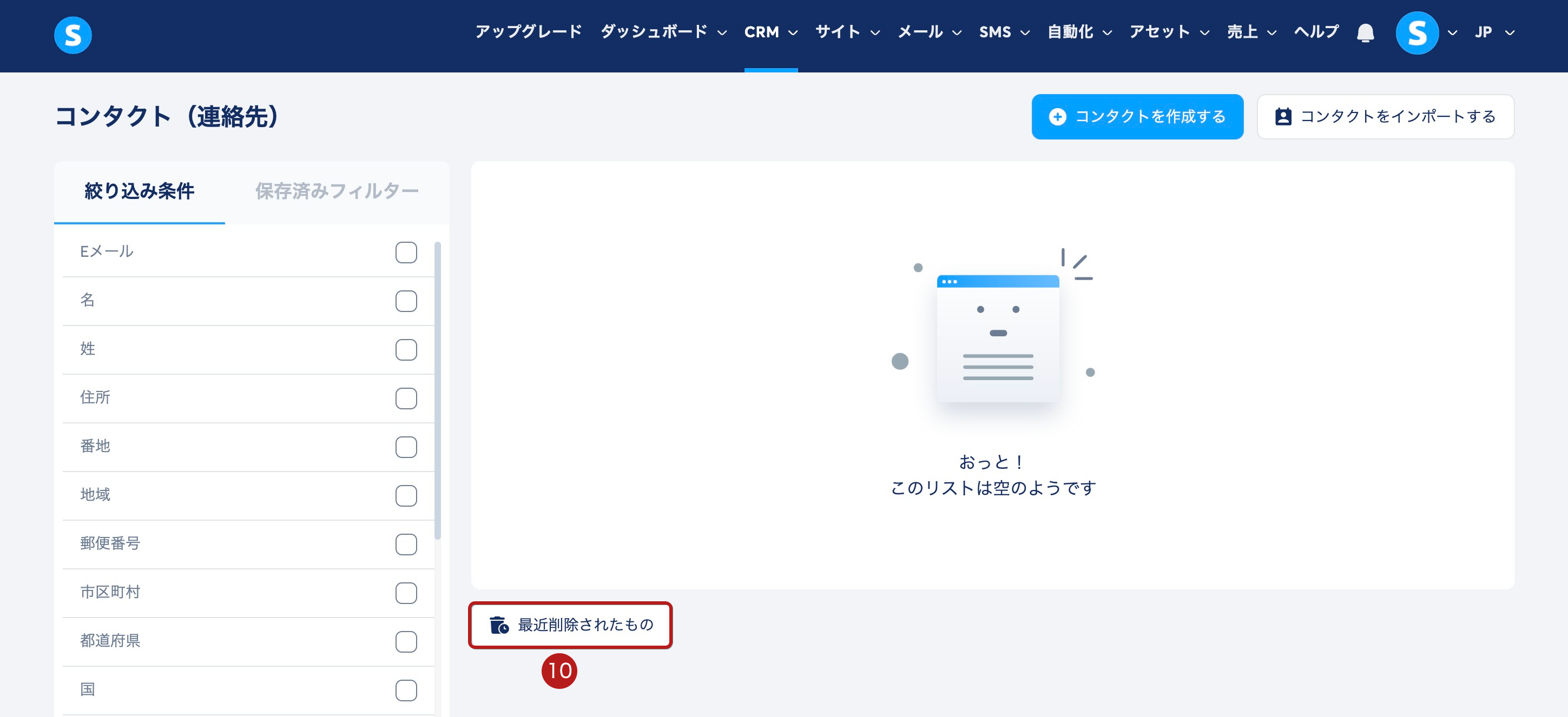削除したコンタクトを復元するには、コンタクトページで 最近削除されたもの (10) をクリックします。