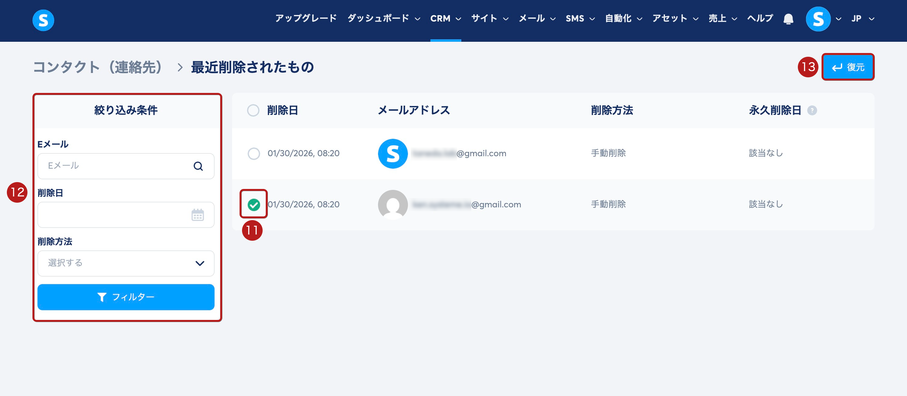 復元したいコンタクトを手動で選択 (11) することも、左側のフィルターを使用して簡単に見つけることもできます (12)。その後、復元 (13) をクリックします。