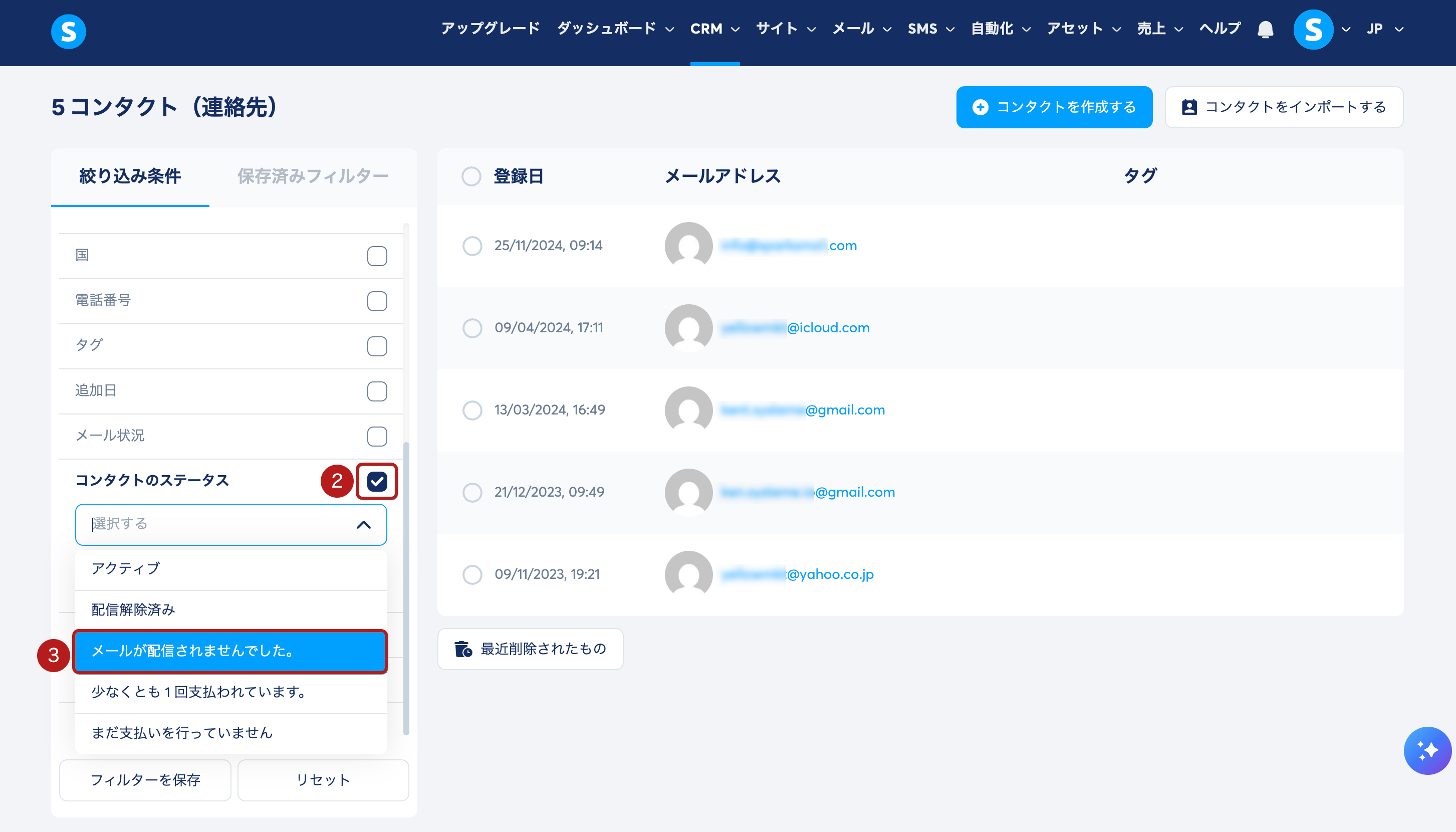 コンタクトのステータス フィルター (2) をクリックし、バウンス(メールが配信されませんでした) (3) を選択します。これにより、バウンスしたコンタクトのみが一覧に表示されます。