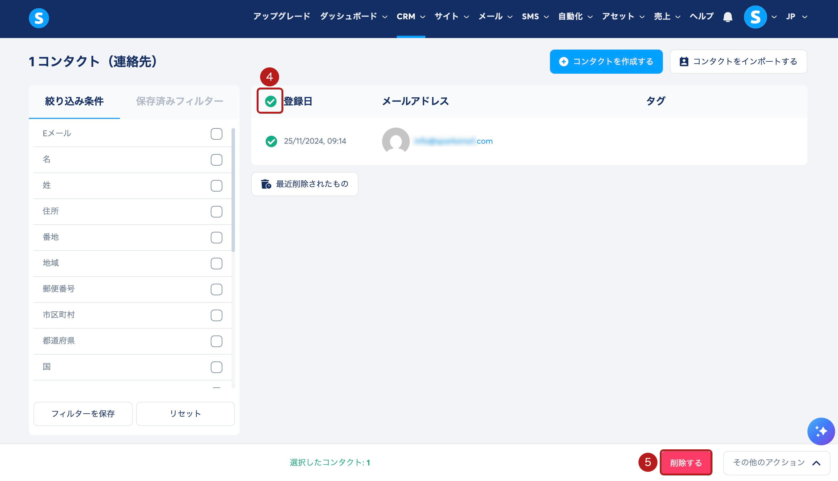 チェックボックス (4) をクリックしてすべてのバウンスしたコンタクトを選択し、削除する (5) をクリックします。