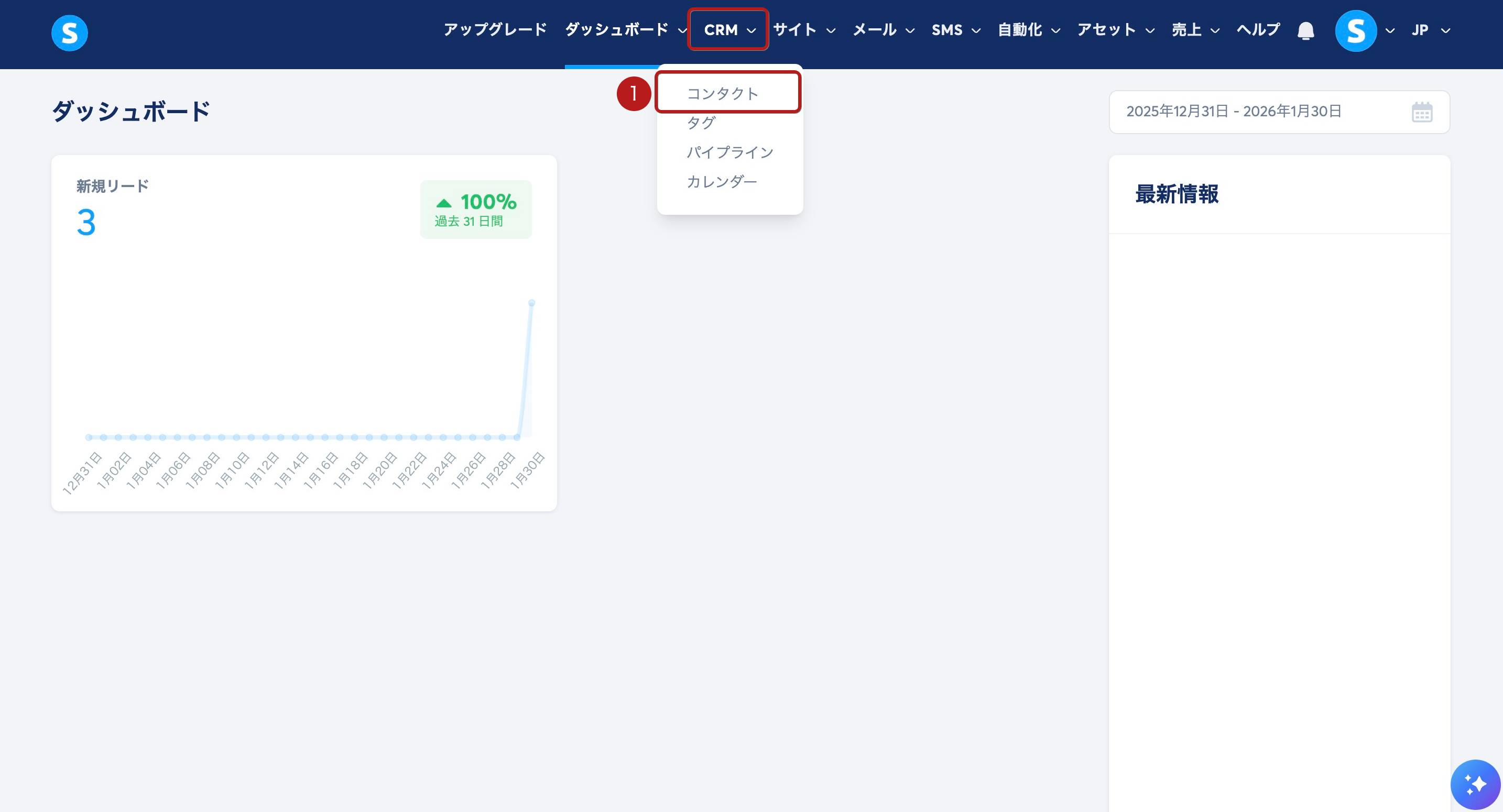CRM メニューの コンタクト (1) をクリックします。