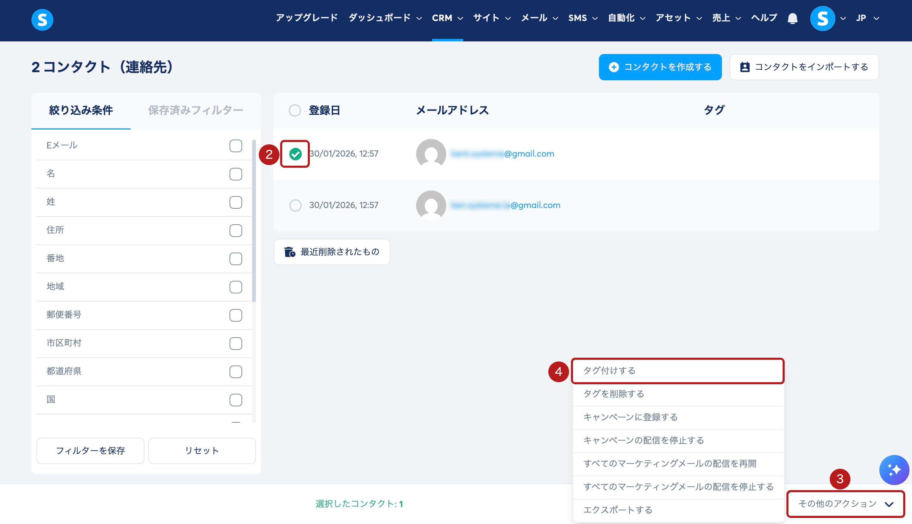タグを割り当てたいコンタクトを選択 (2)し、その他のアクション (3) をクリックして、タグを追加する (4) を選択します。