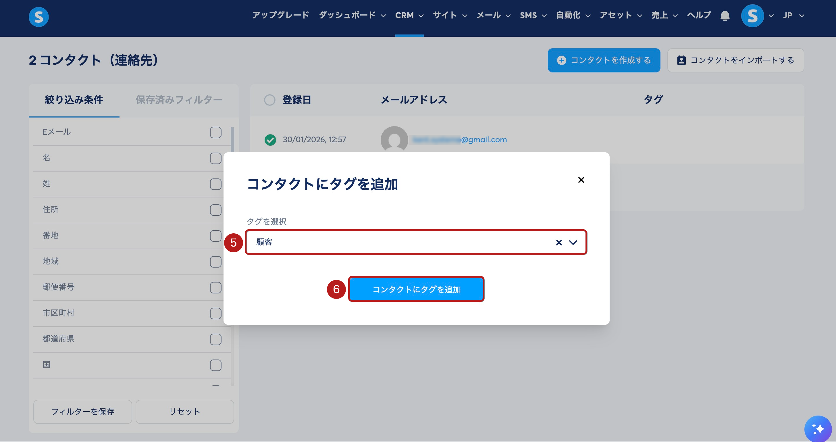 ポップアップが表示されます。コンタクトに割り当てるタグを選択 (5) し、コンタクトにタグを追加 (6) をクリックします。