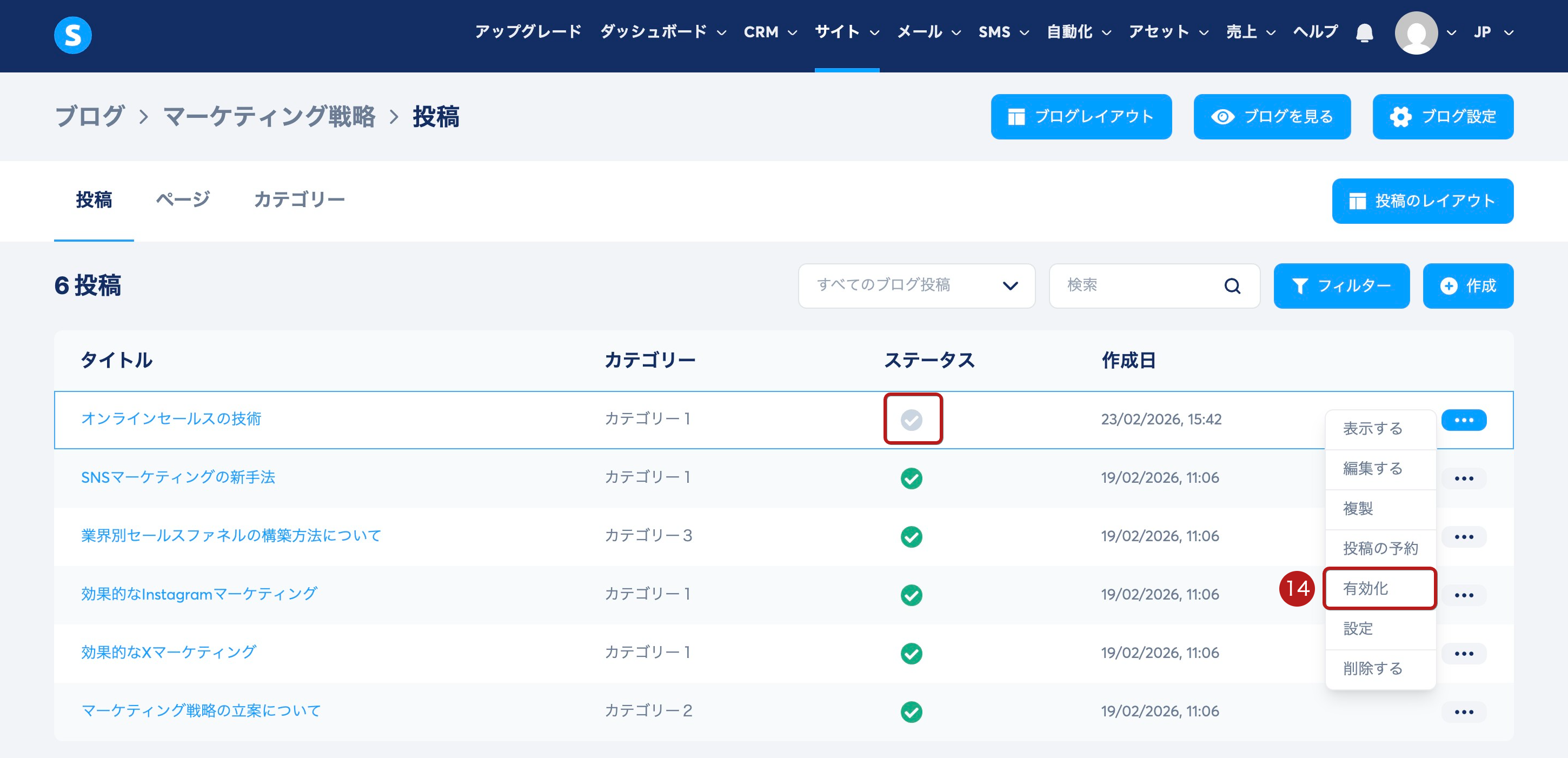 内容のカスタマイズが完了したら、再度三点メニューをクリックし、有効化(14)を選択して、ブログ上に投稿を表示します。