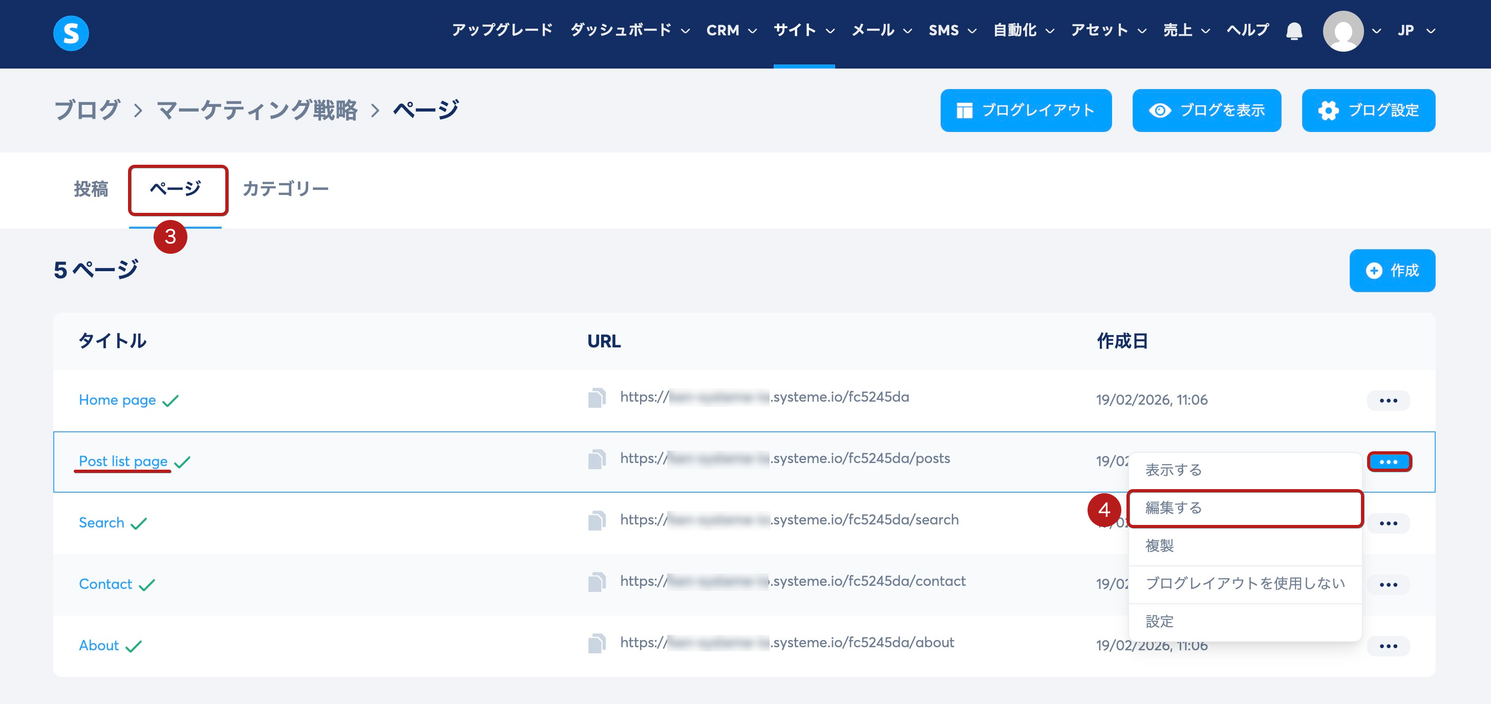 ブログのメニューからページ(3)をクリックしてブログページの一覧を表示します。投稿一覧ページ(Post list page)というタイトルのページを探し、三点メニュー(...)をクリックして編集する(4)を選択します。