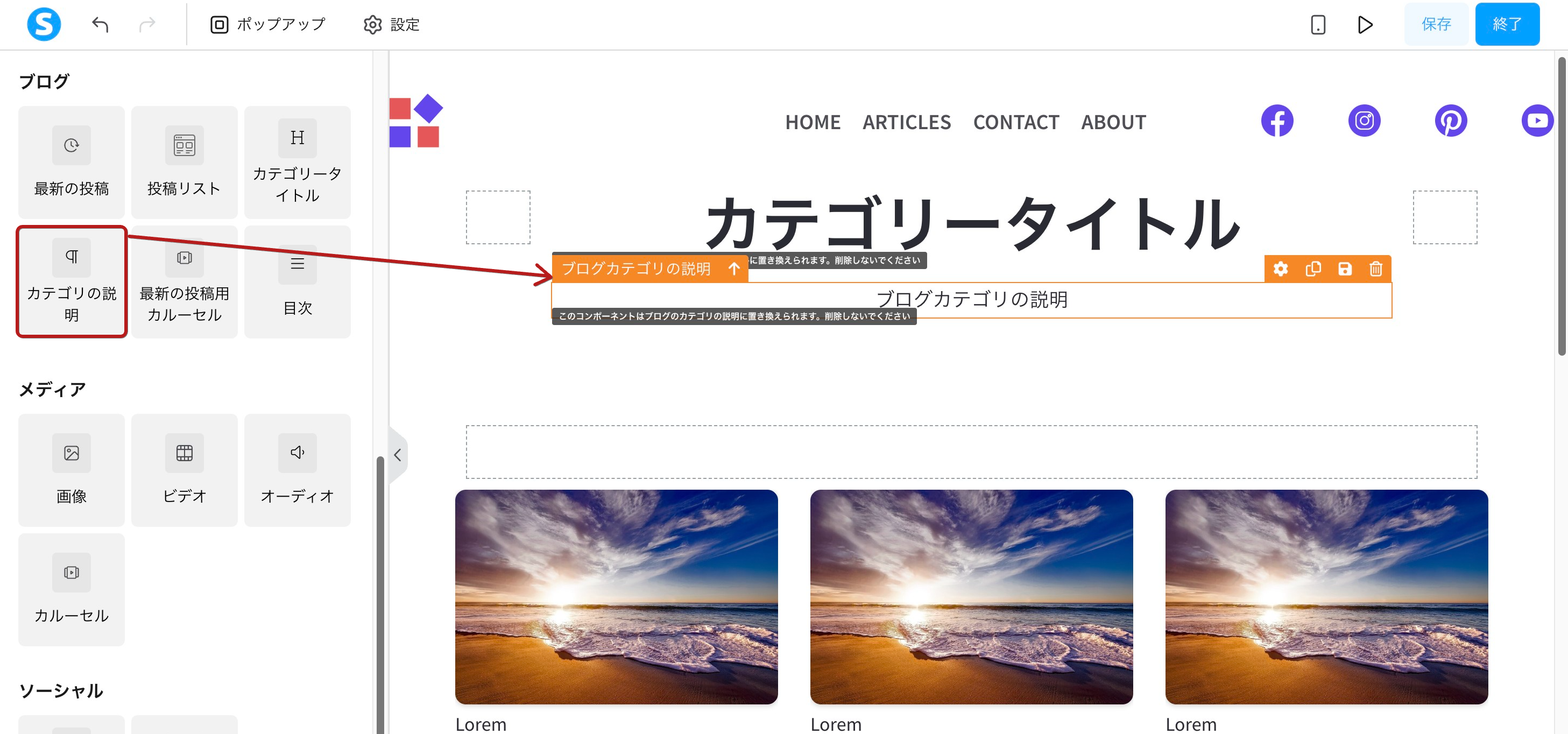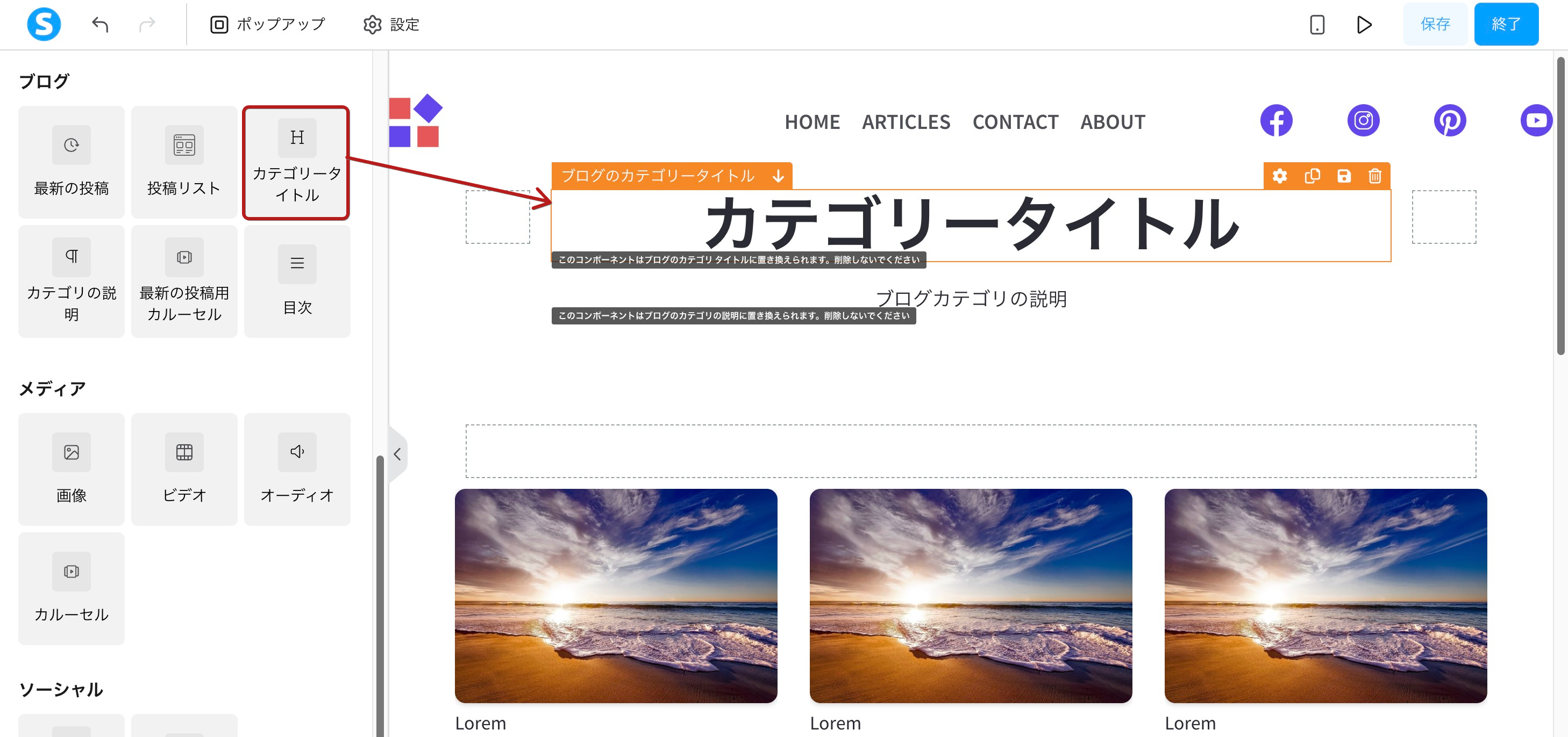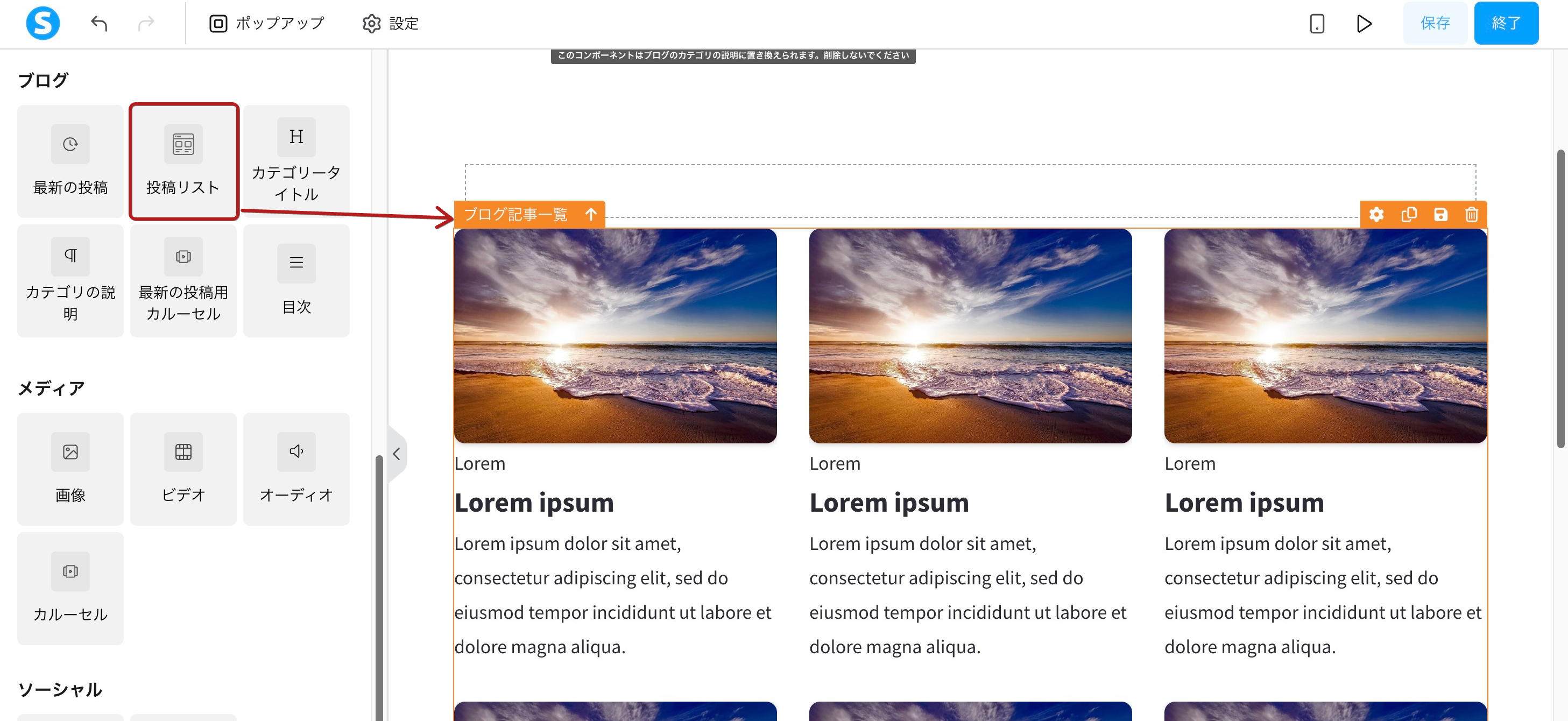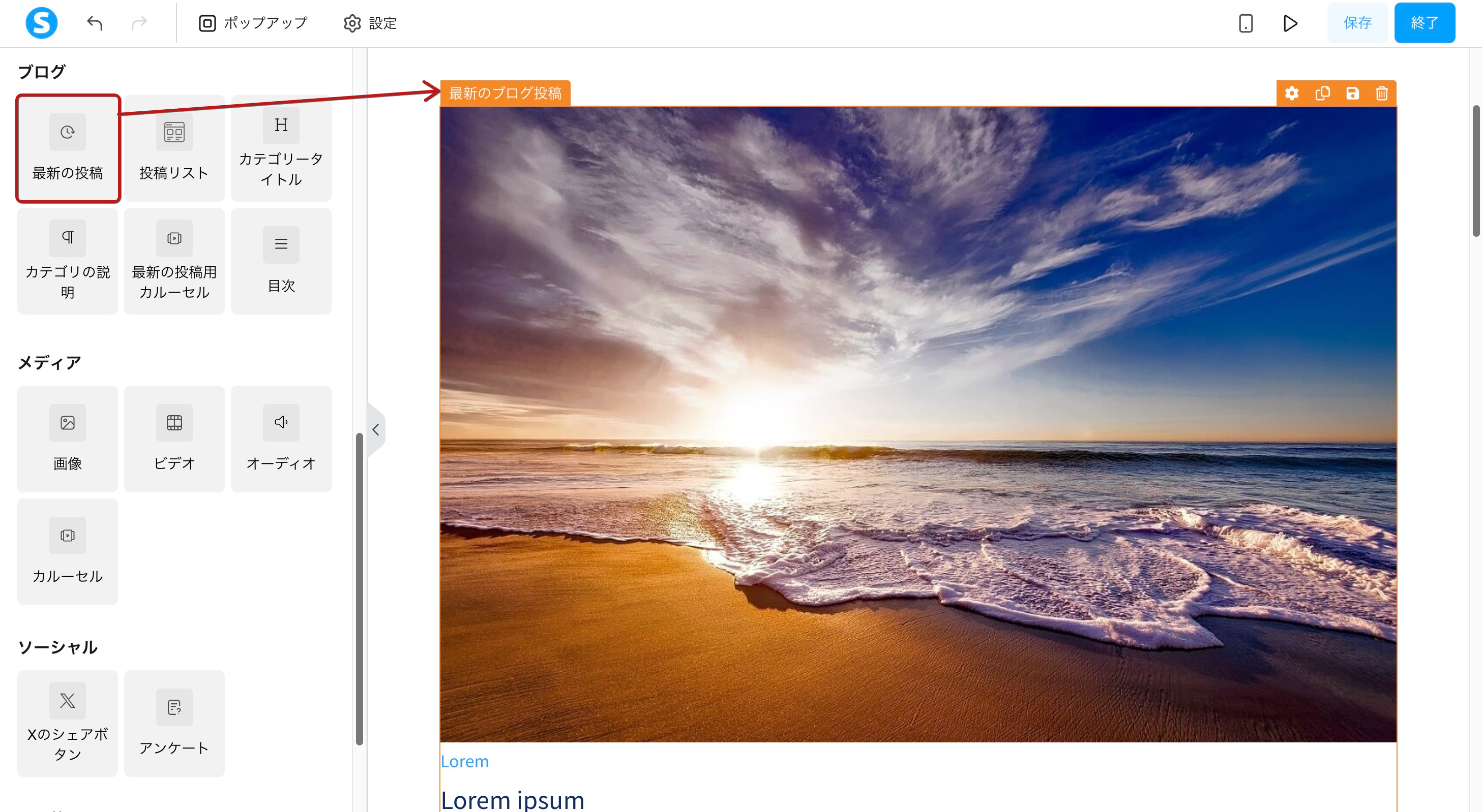 ページエディターを開くと、左側のパネル内の「ブログ」セクションに、以下のページ要素が表示されます: