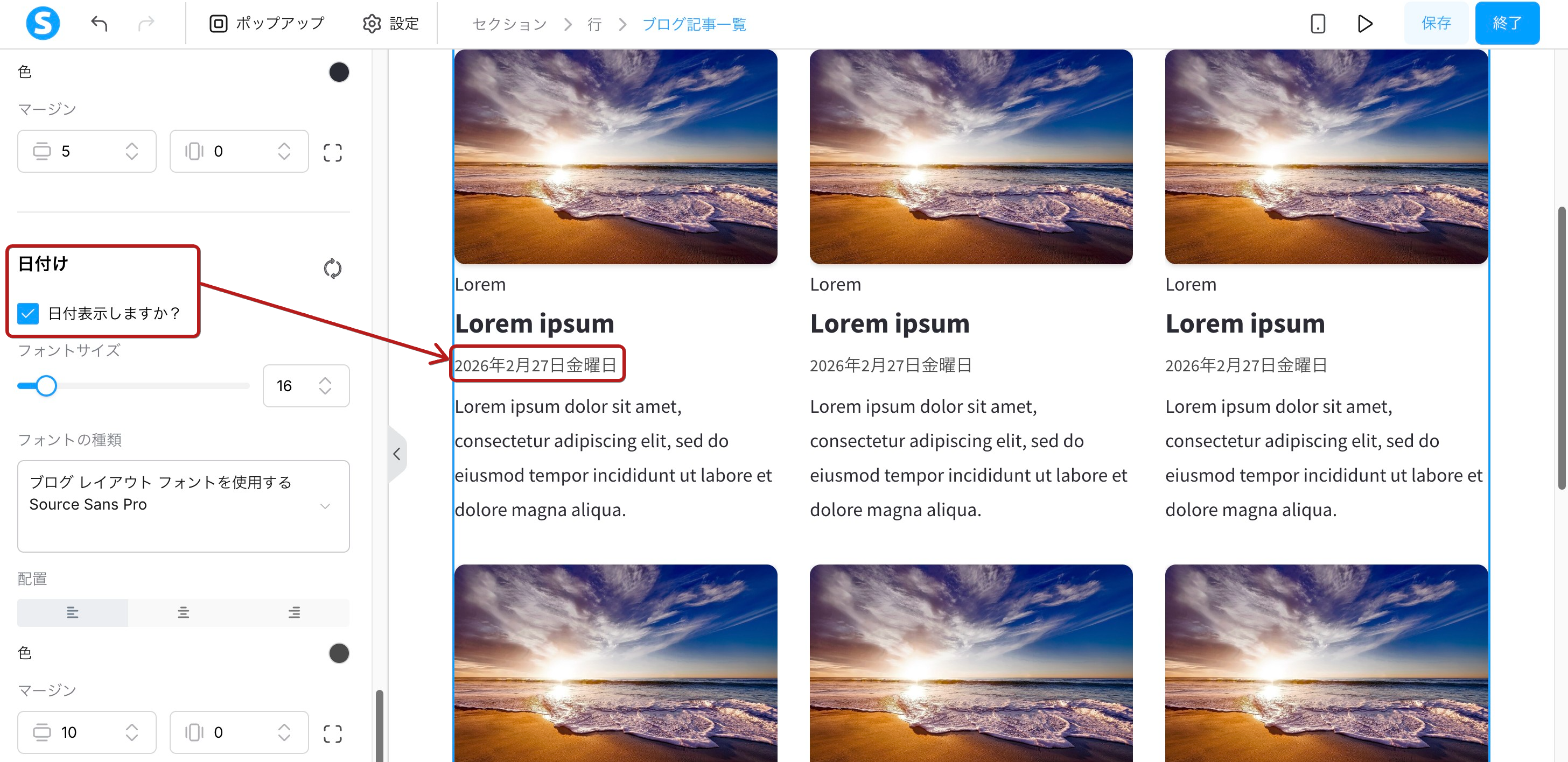 投稿日の表示・非表示を切り替えるには、日付けセクション内の「日付表示しますか?」チェックボックスをオンまたはオフにします。