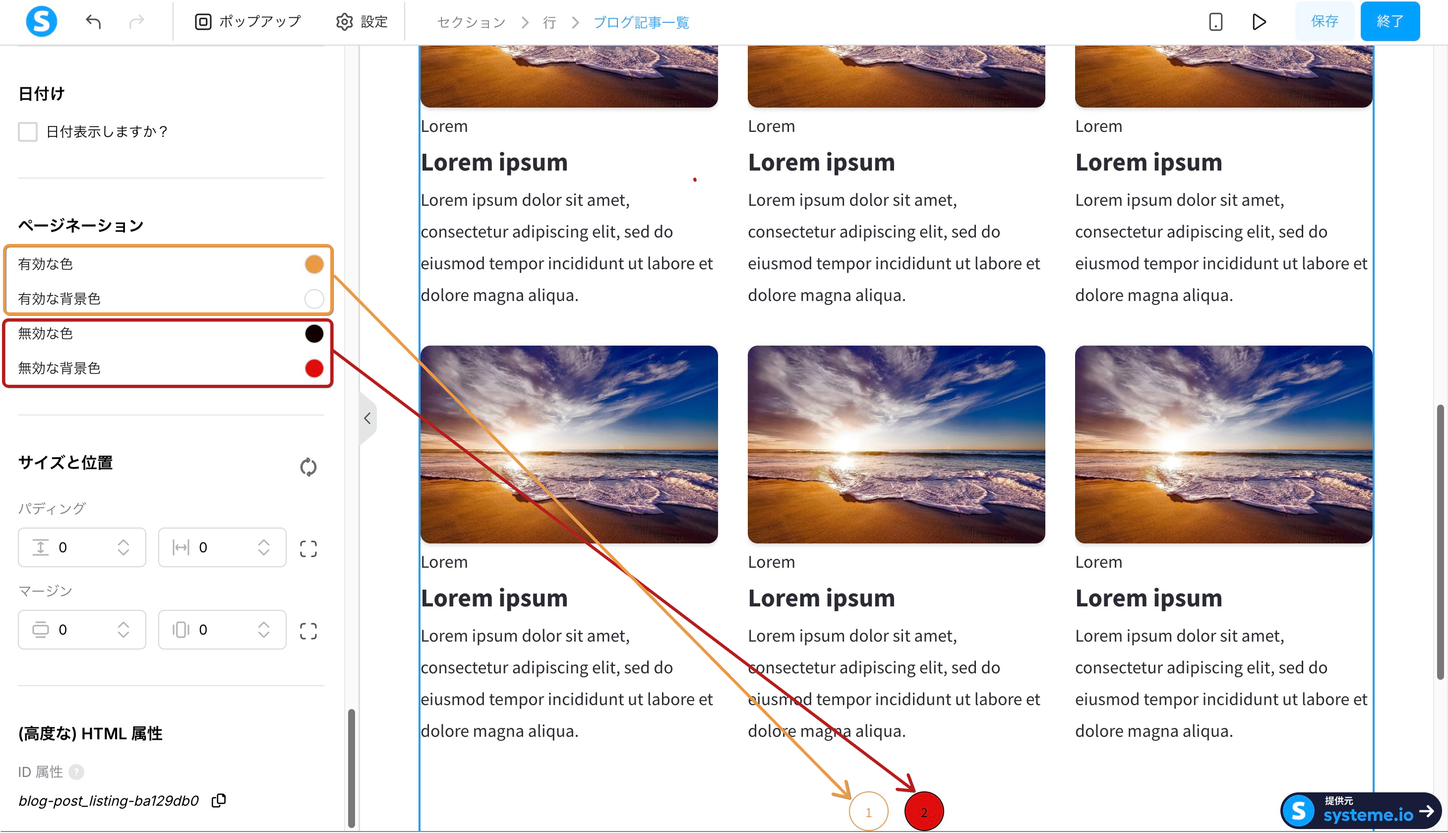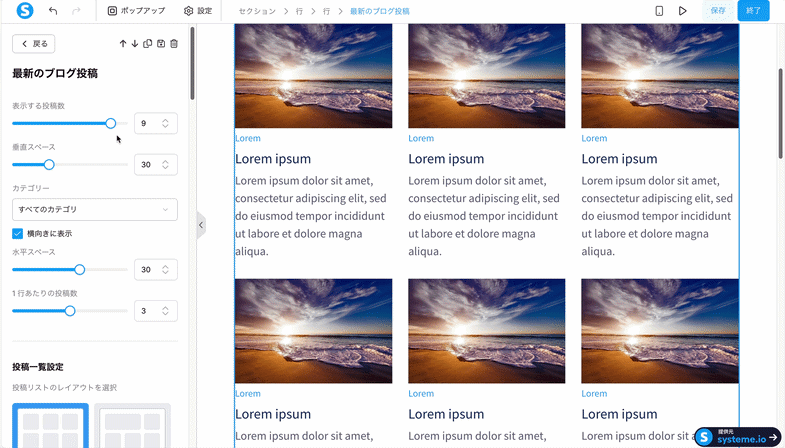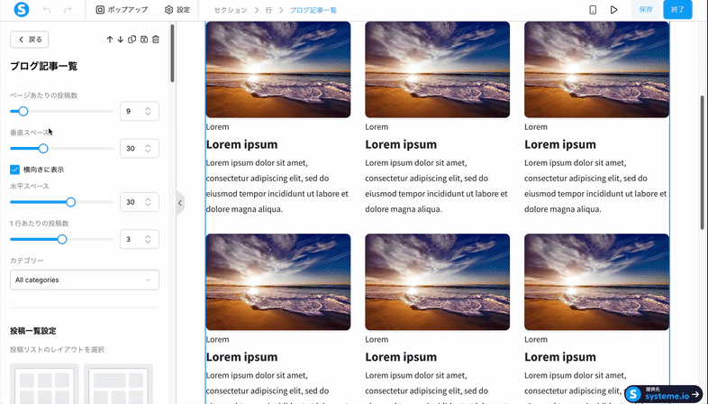 左側の設定パネル、またはブログ投稿一覧要素をクリックすることで、以下の項目を変更できます: