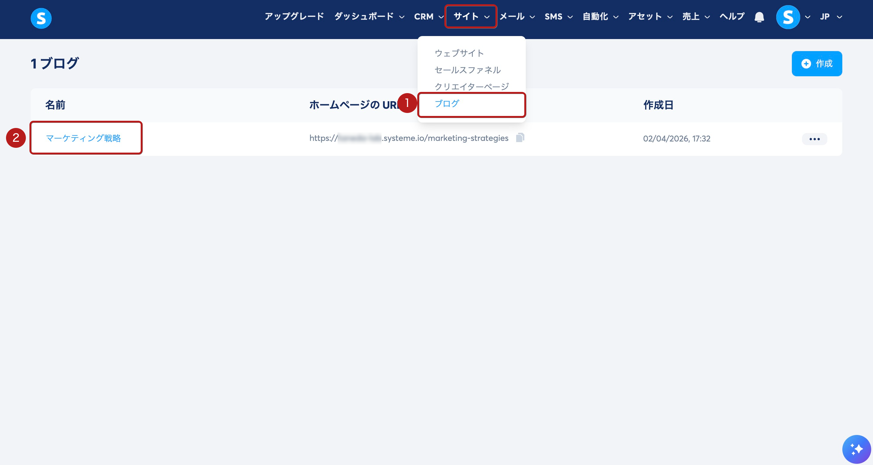 サイトタブに移動し、ブログ(1)をクリックしてから、ブログのタイトル(2)をクリックします。