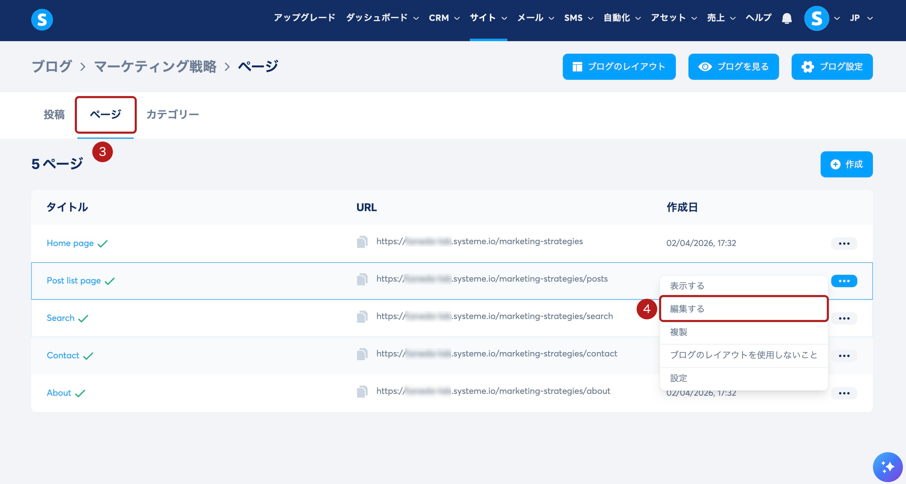ブログのダッシュボード内で、ページセクション(3)に移動し、投稿一覧ページ(Post list page)(4)の横にある編集するアイコンをクリックします。