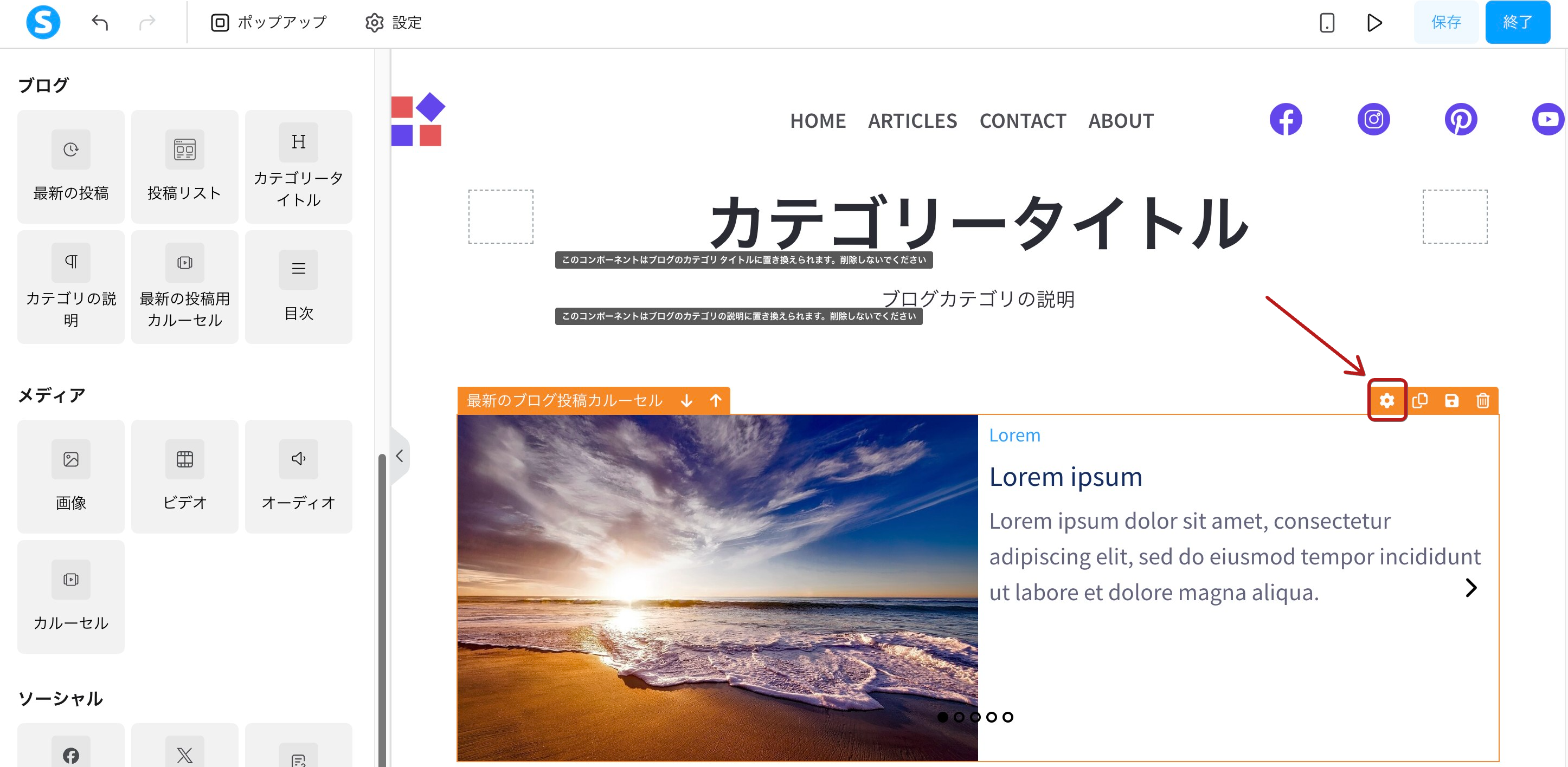 エディターで、最新の投稿用カルーセル要素をページ上にドラッグ&ドロップします。ブログ投稿は、この要素内に自動的に表示されます。