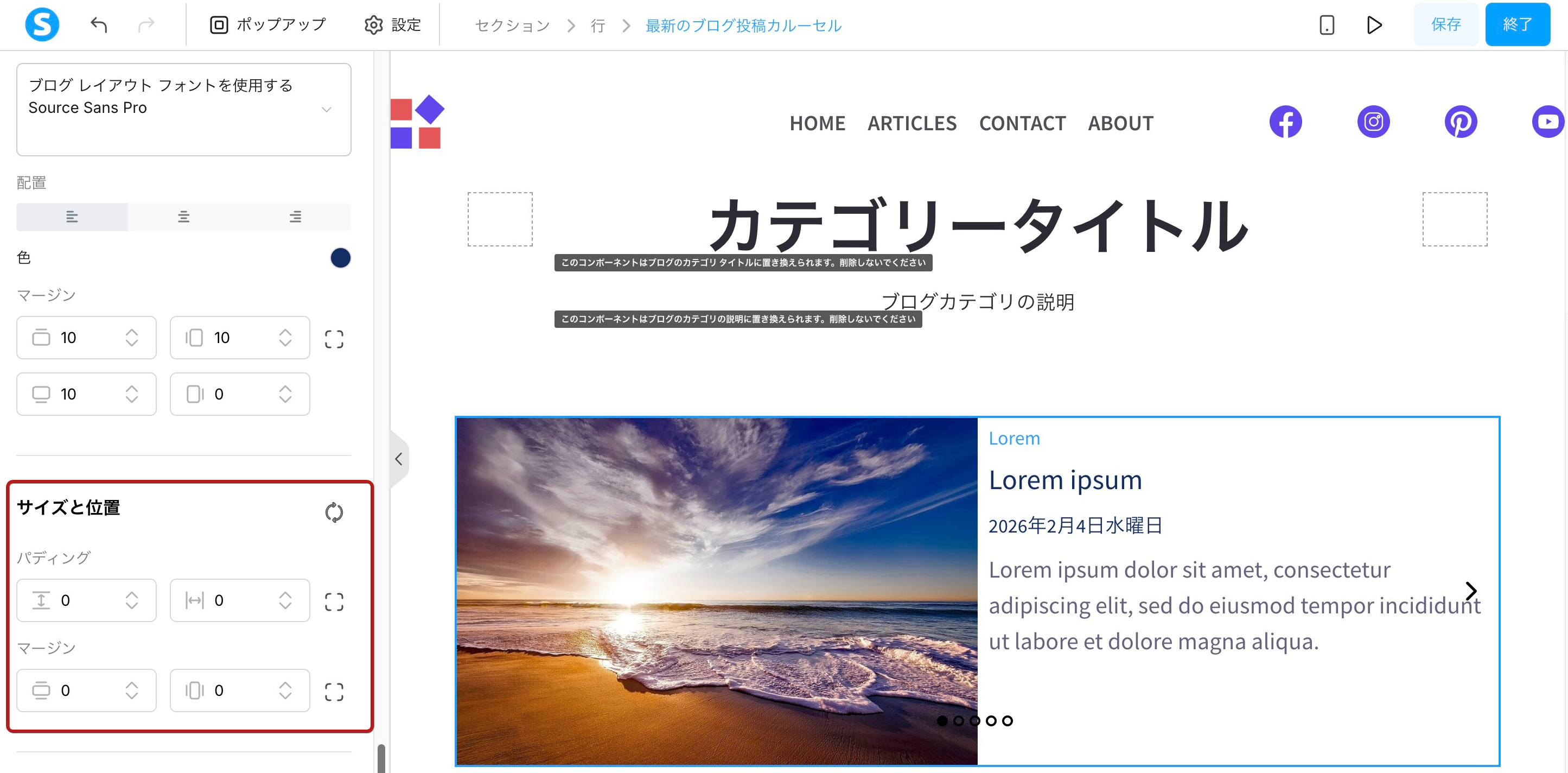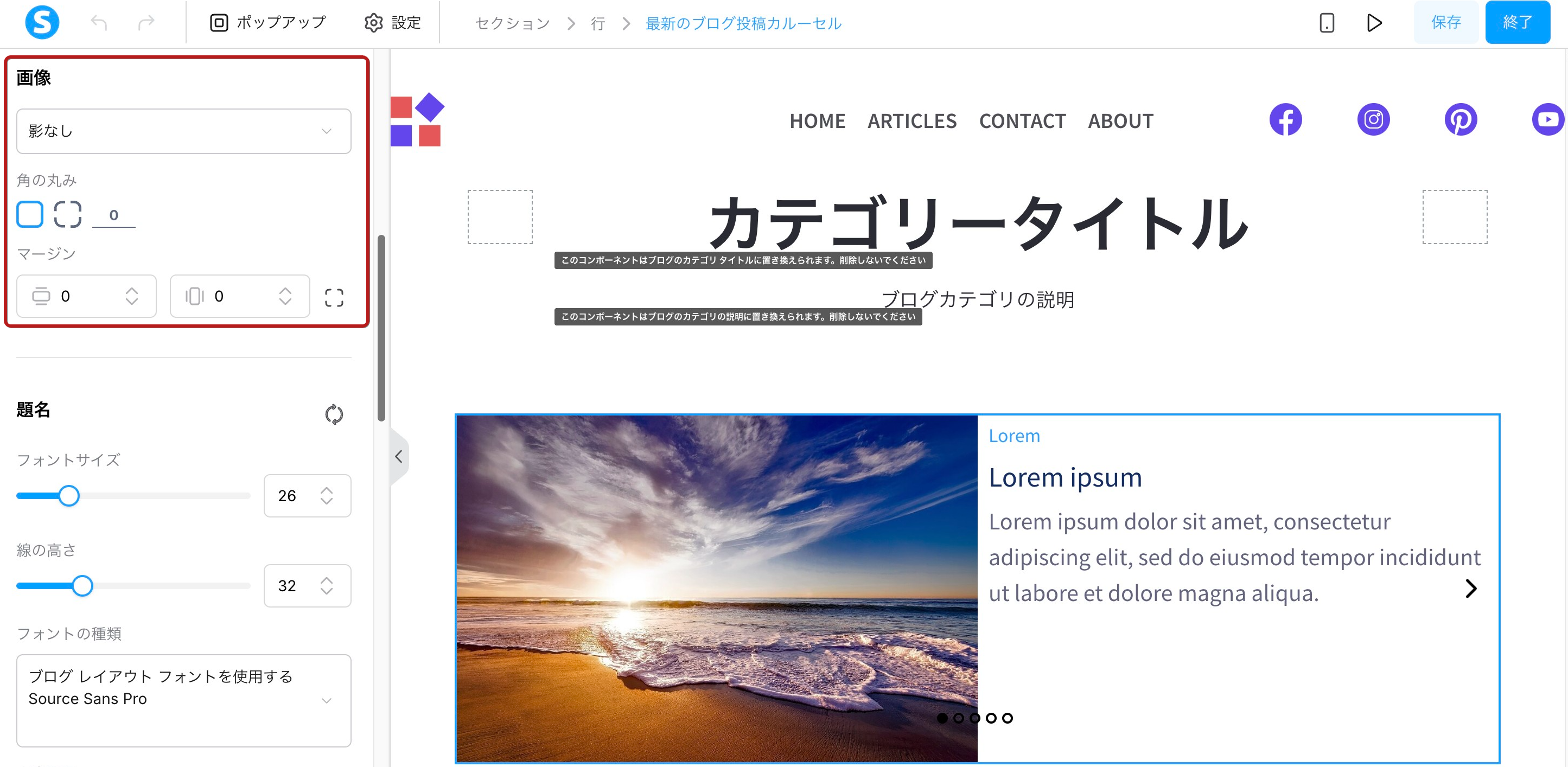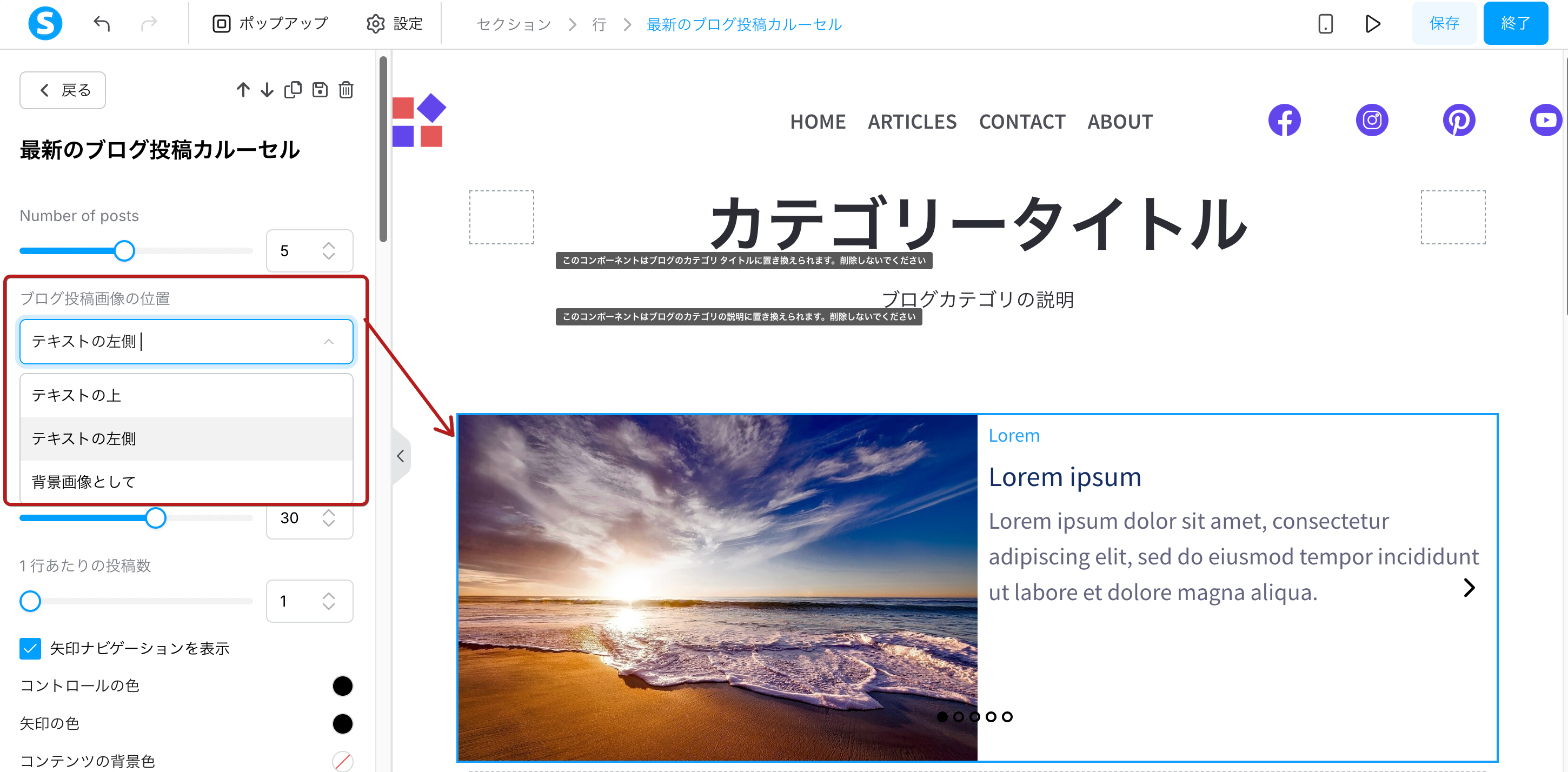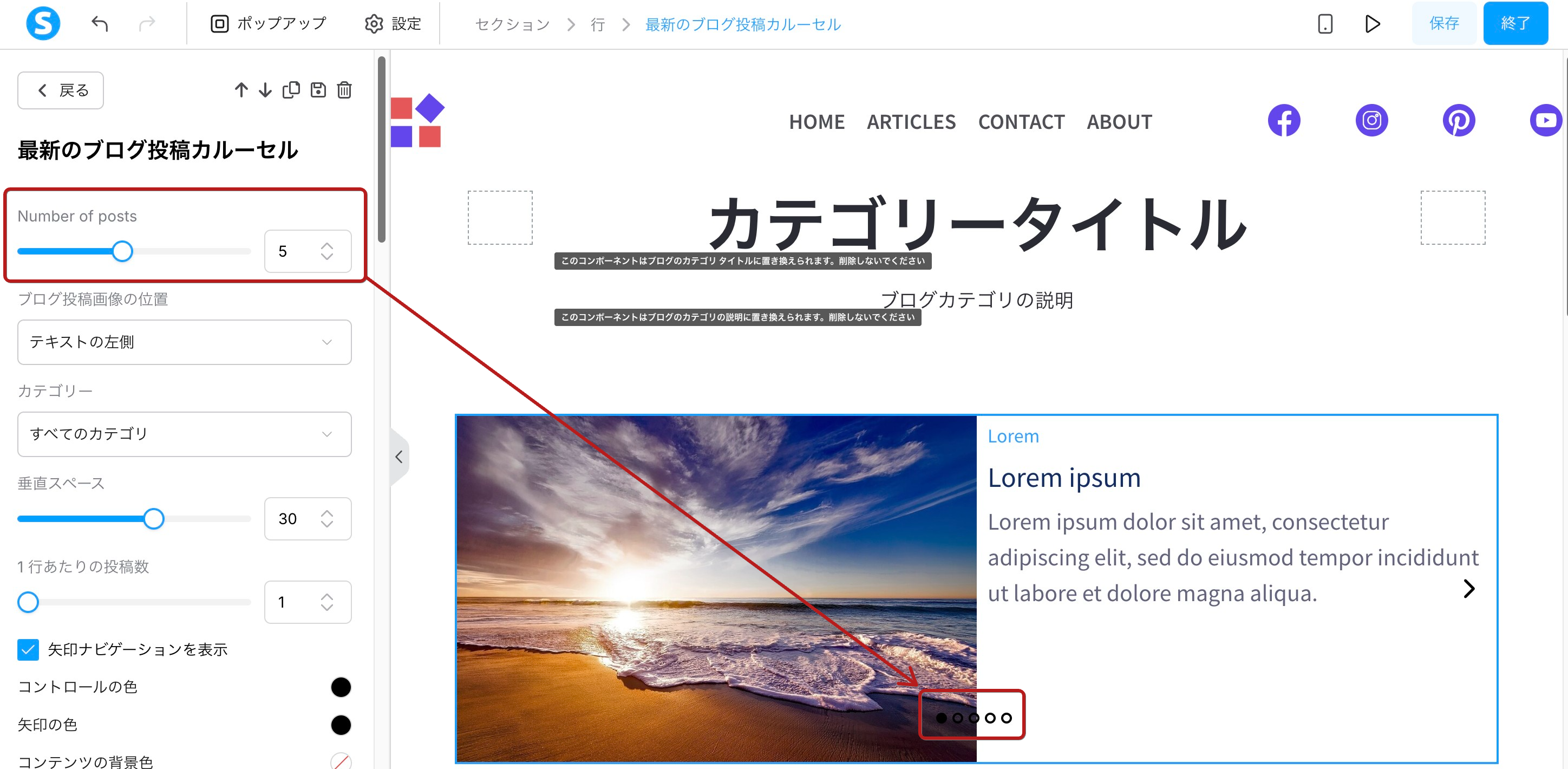 - カルーセルのスライド数: このカルーセルに表示する投稿数を指定します。