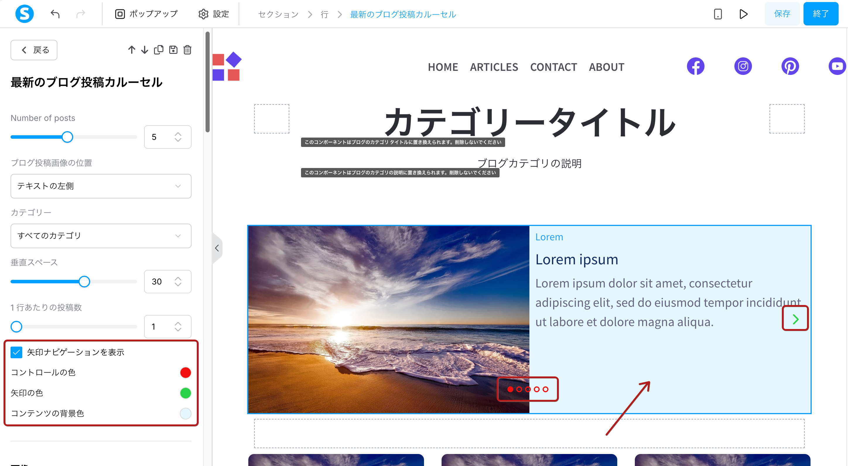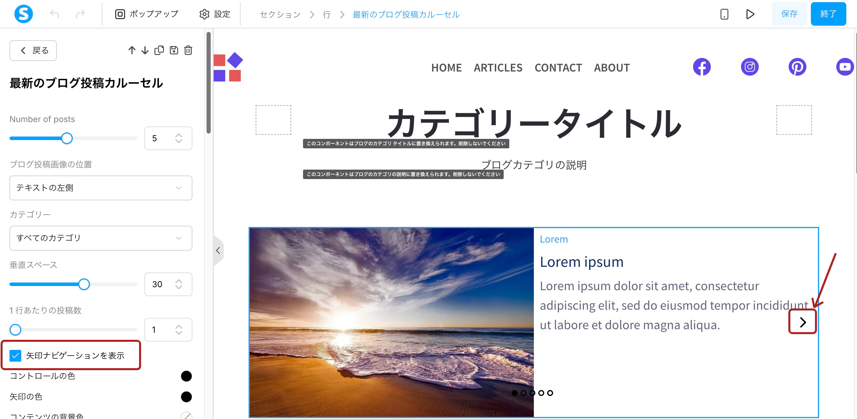 - 矢印ナビゲーションを表示するかどうか: チェックを入れると、矢印が表示されます。