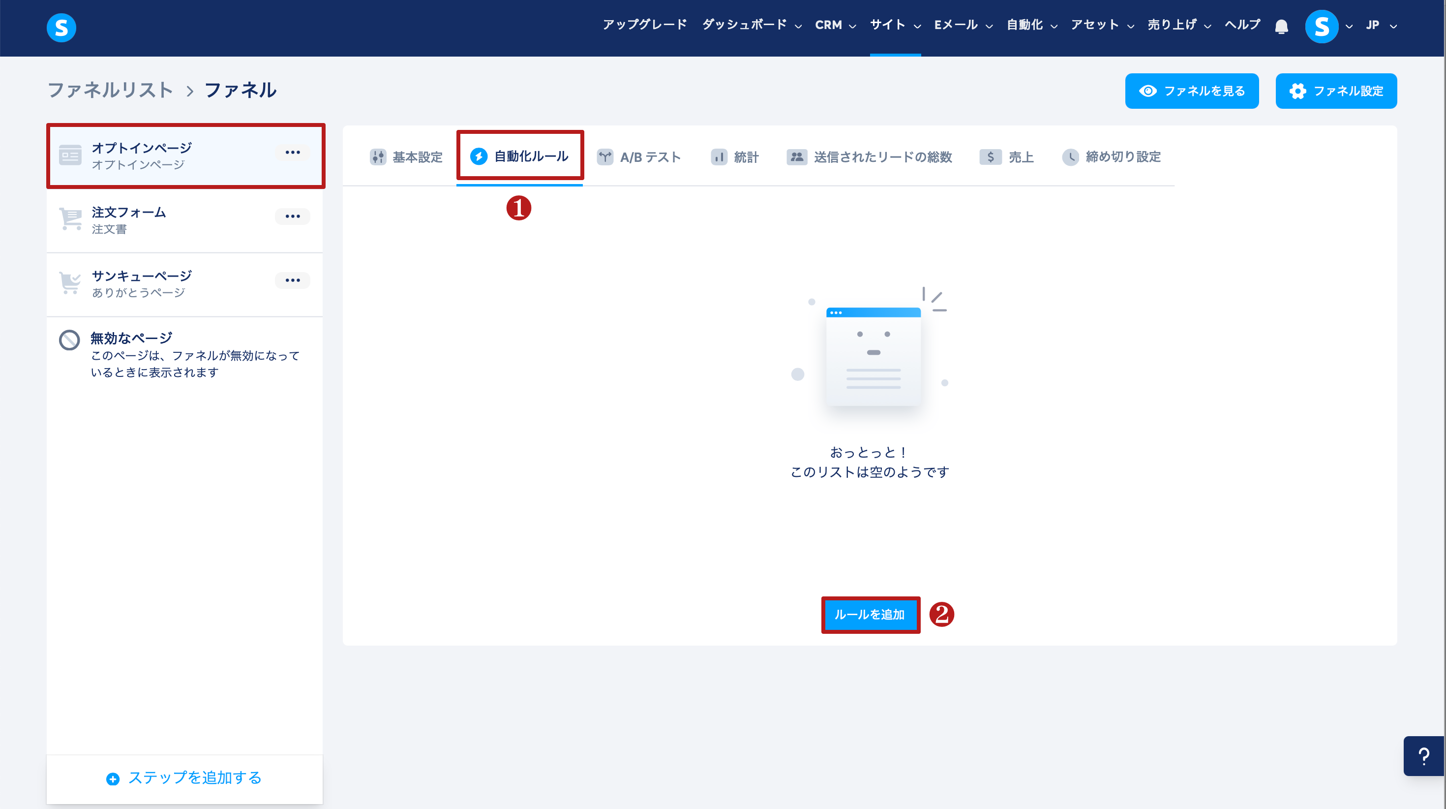 オプトインページの設定で、「自動化ルール」タブ (1) をクリックし、次に 「ルールを追加」(2)をクリックします。