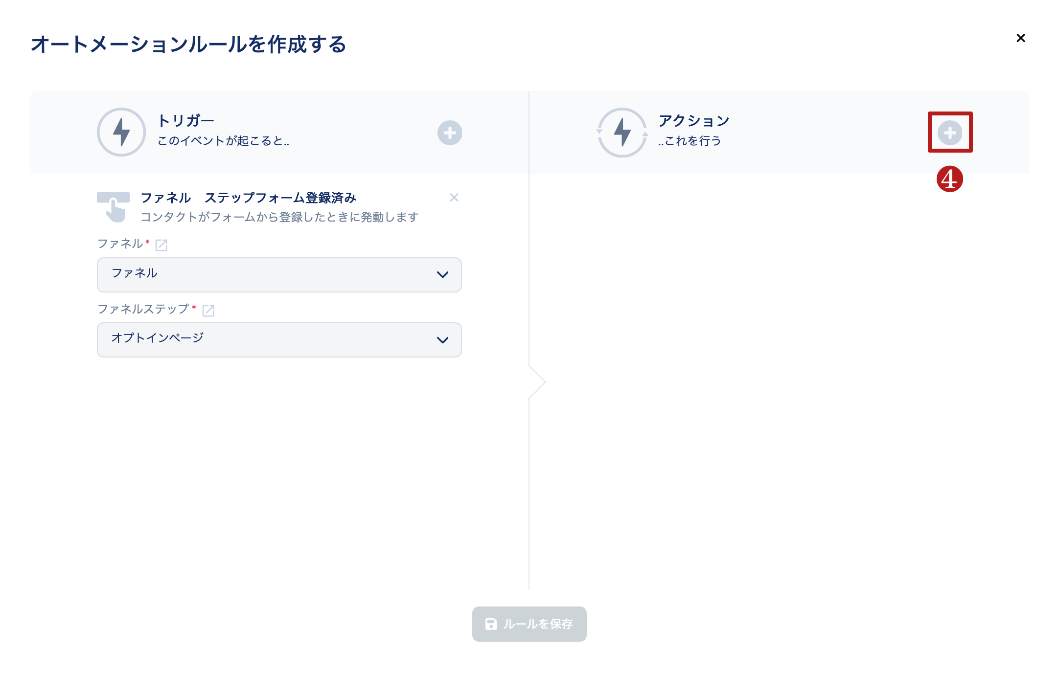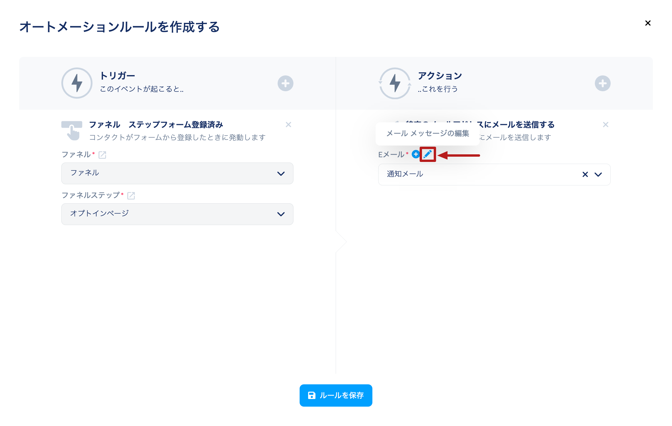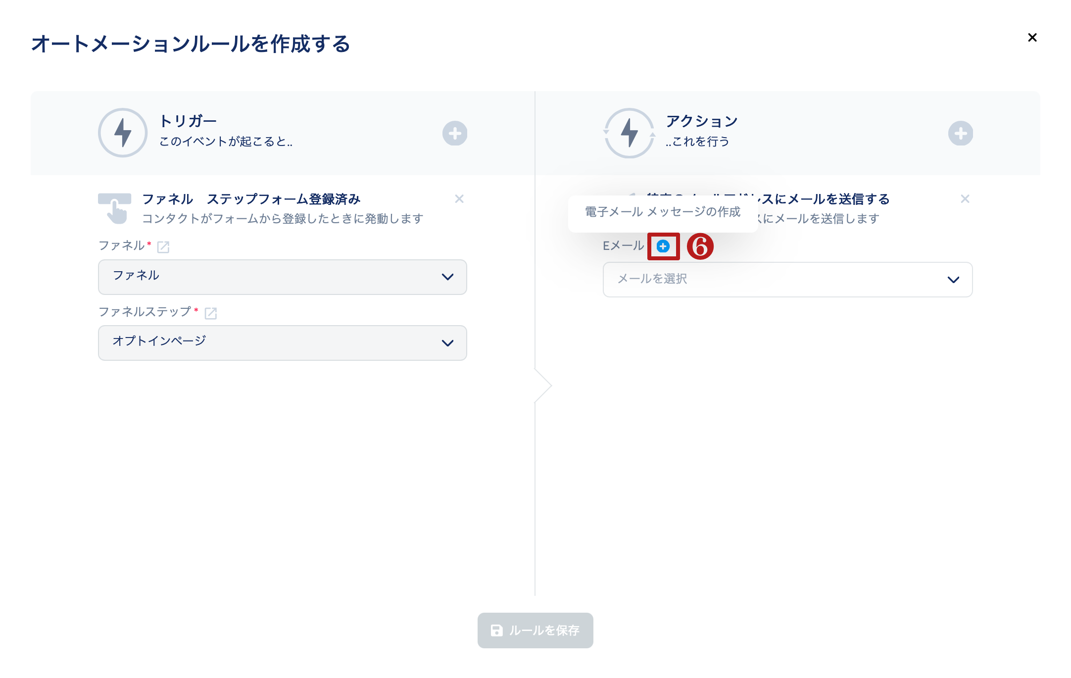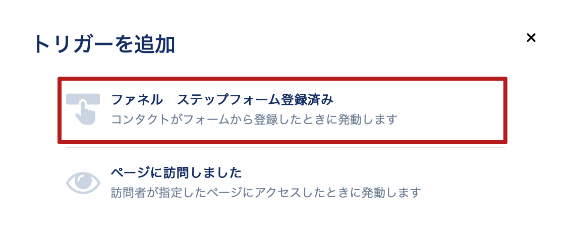 表示されるポップアップにて、見込み客が登録された後にEメールを通知する自動化ルールを設定するには、トリガーとして「ファネル ステップフォーム登録済み」を選択します。