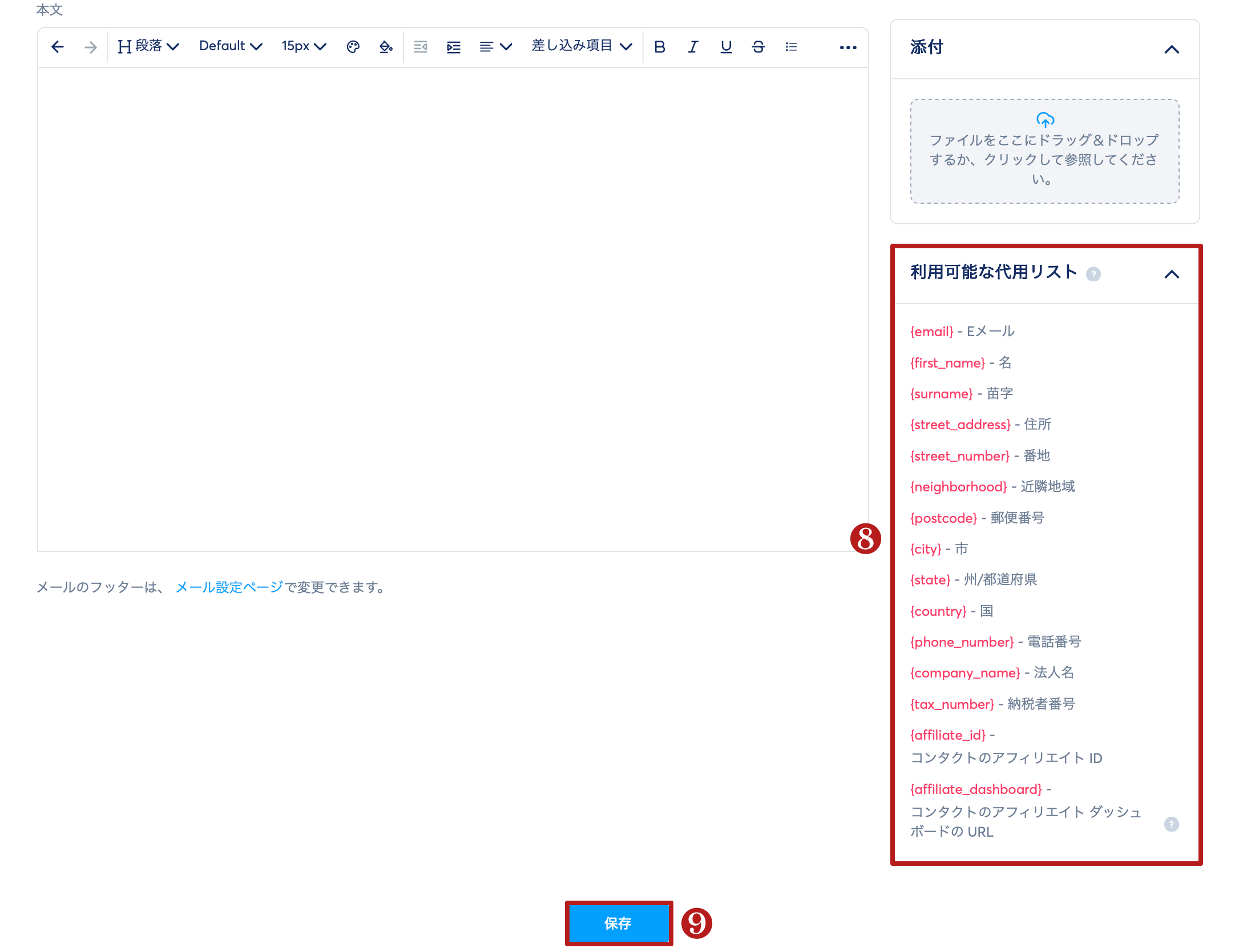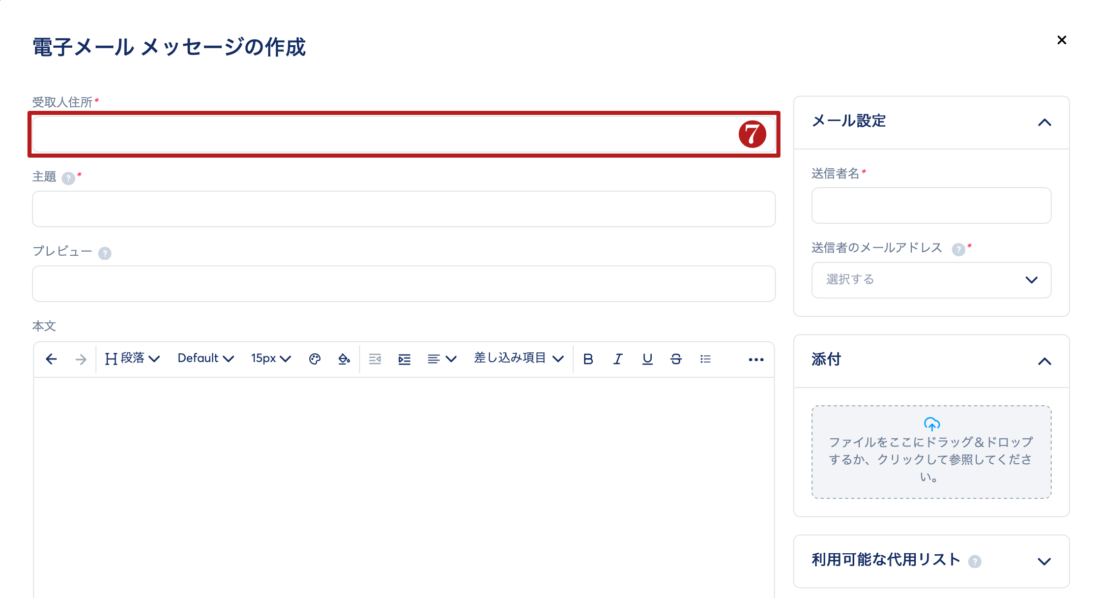 登録したコンタクト(連絡先)に関する情報をメール本文内に含めるには、メール本文内でパーソナライズ用として事前に定義された代用(置換)変数を使用できます。 (8)