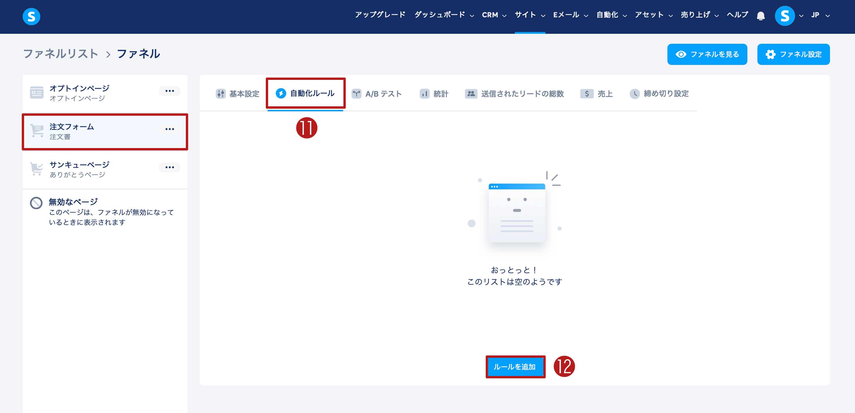 ファネルステップの注文フォームの設定にて、自動化ルールタブ (11) をクリックし、次にルールを追加(12) をクリックします。