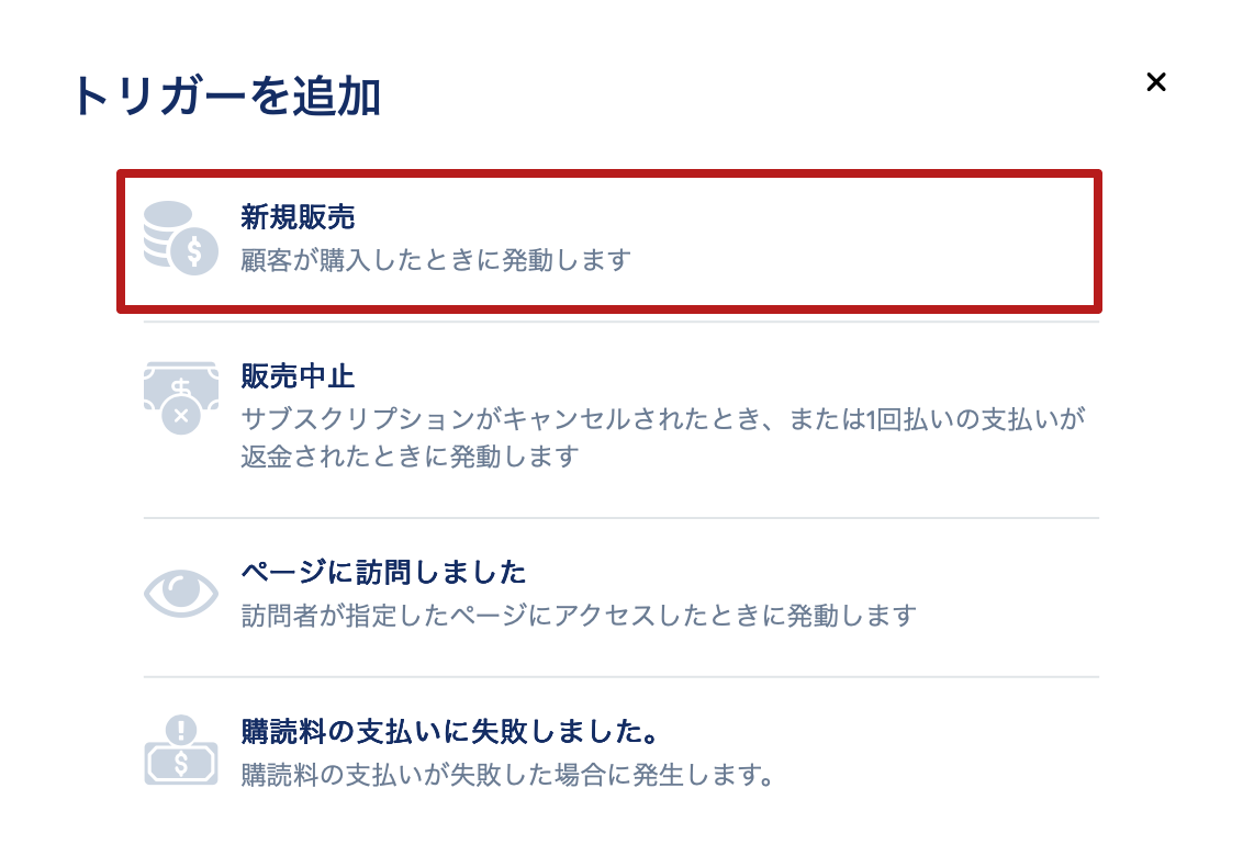 表示される「トリガーを追加」のポップアップ画面で、「新規販売」を選択し、顧客が購入した後に通知メールを送信するルールを設定します。