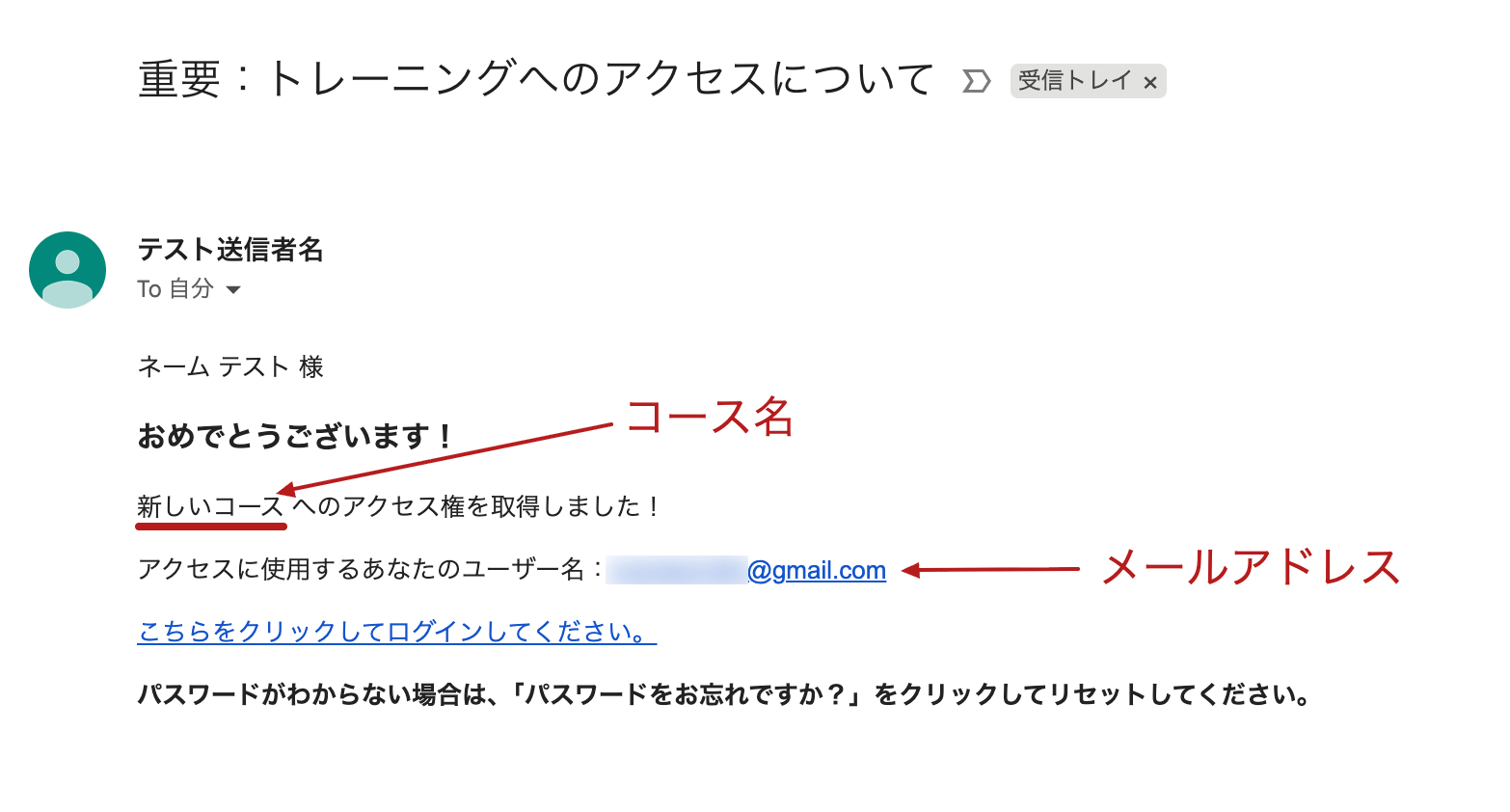 受講生が支払いページやオプトインページ、または手動でコースに参加すると、コース提供者に代わって、お祝いのメッセージとユーザー名、そしてパスワードを設定するためのリンクを含む自動メールが送信されます。