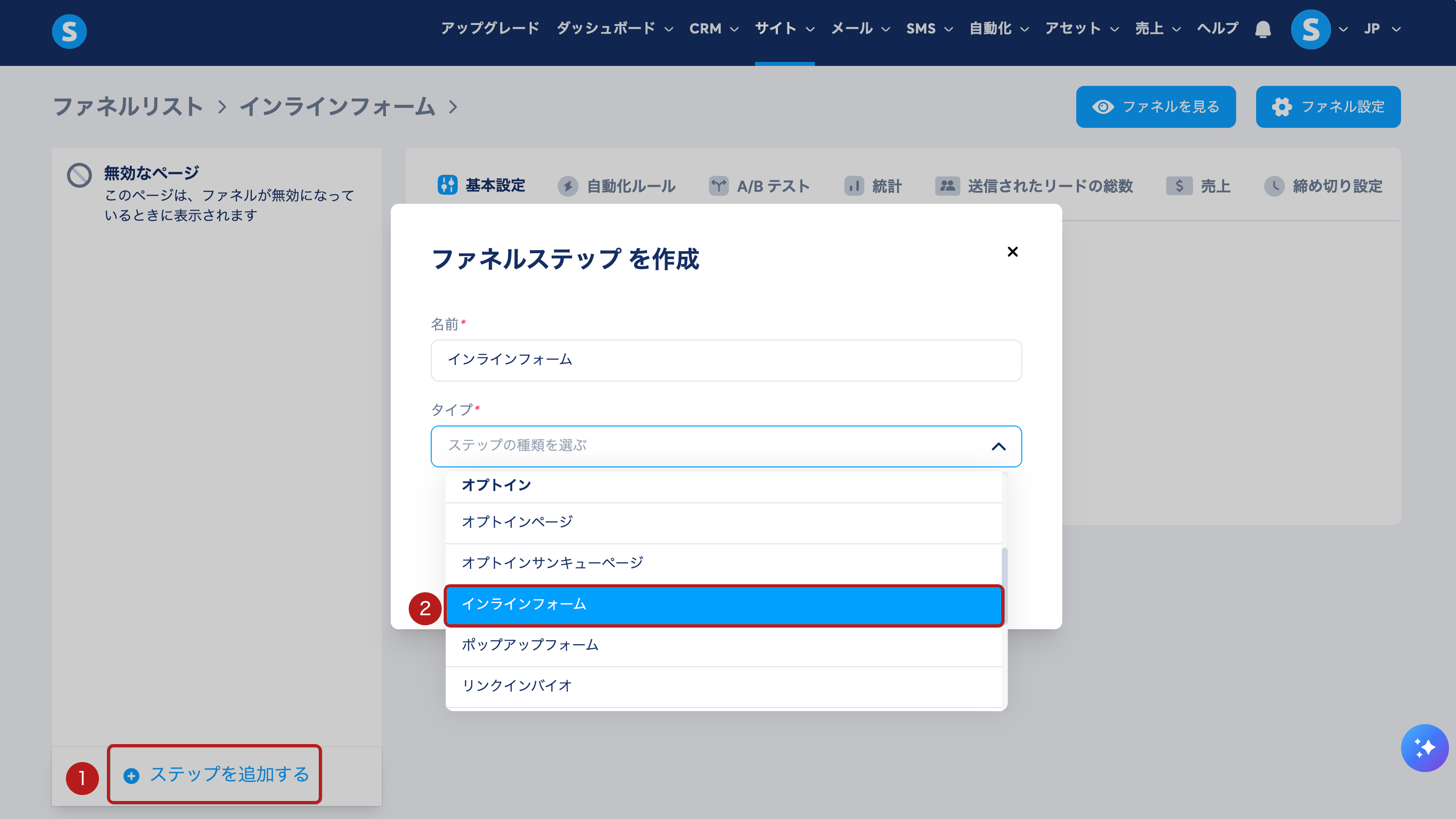これを行うには、セールスファネル に移動し、ステップを追加する(1)をクリックして新規ステップを作成し、インラインフォーム (2)を選択します。