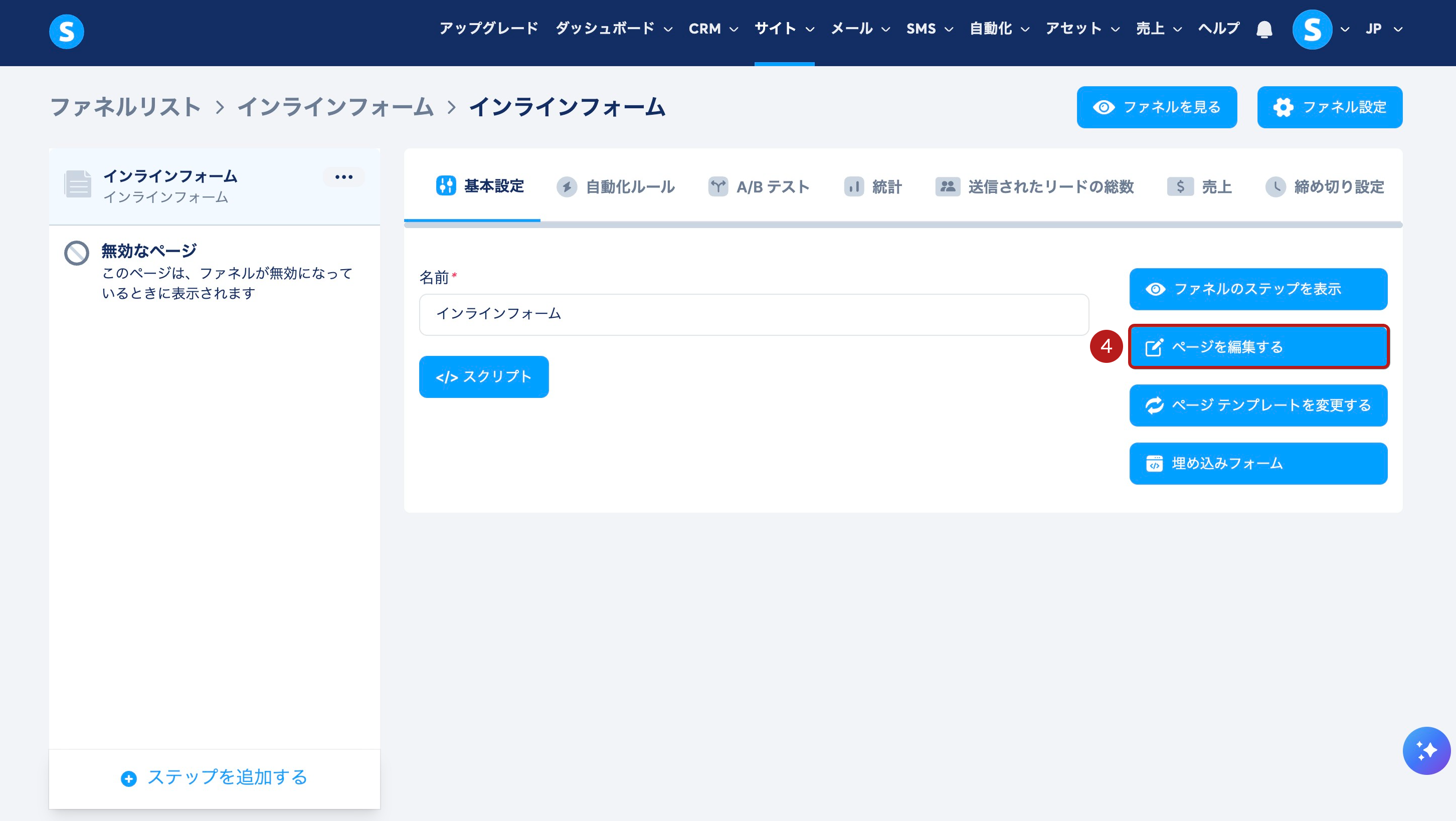 まず、インラインフォームのステップ設定に戻り、スクリプトをクリックします。