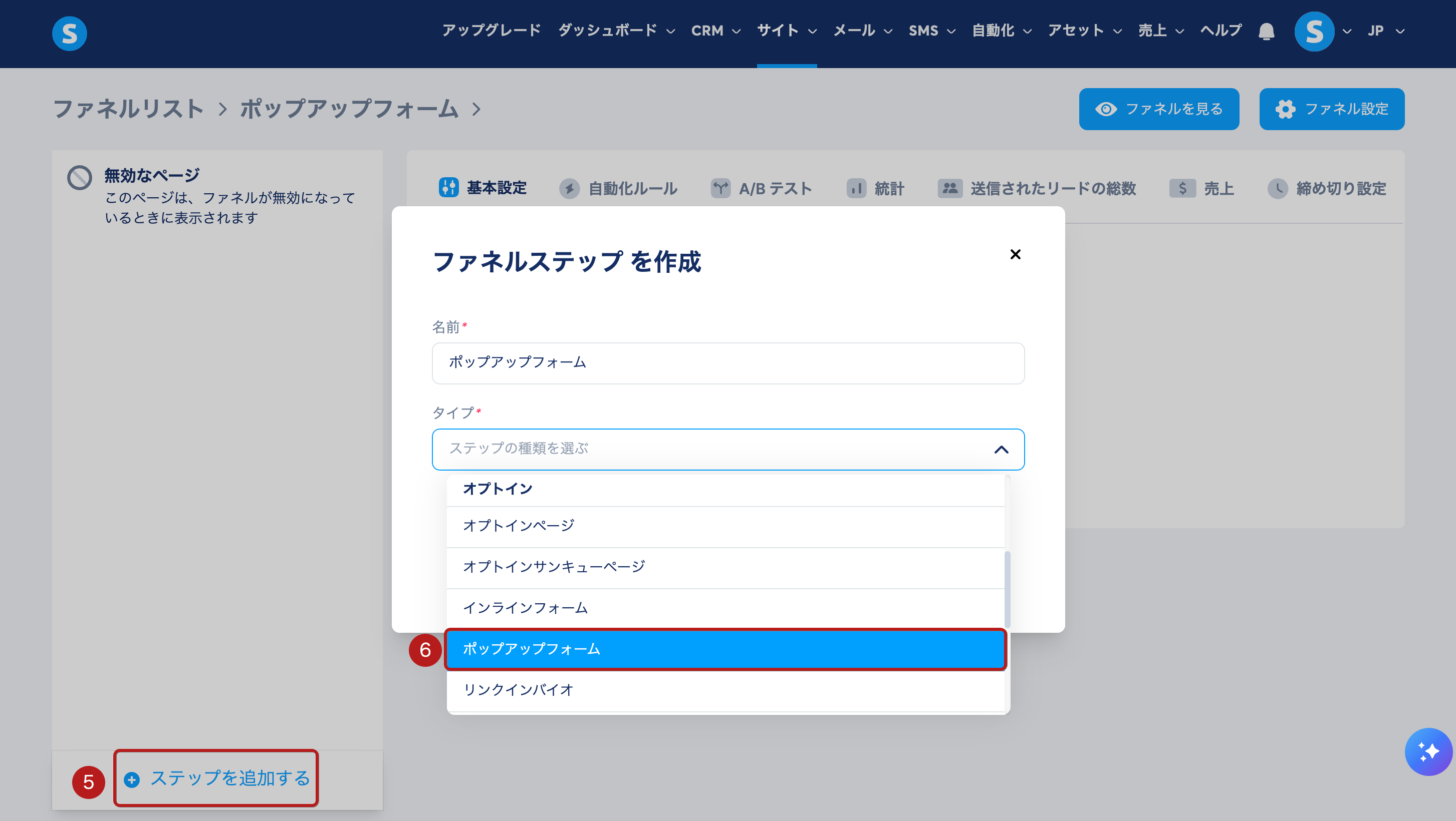 セールスファネルに移動し、ステップを追加する(5)をクリックして新しいステップを作成し、次にポップアップフォーム(6)を選択します。