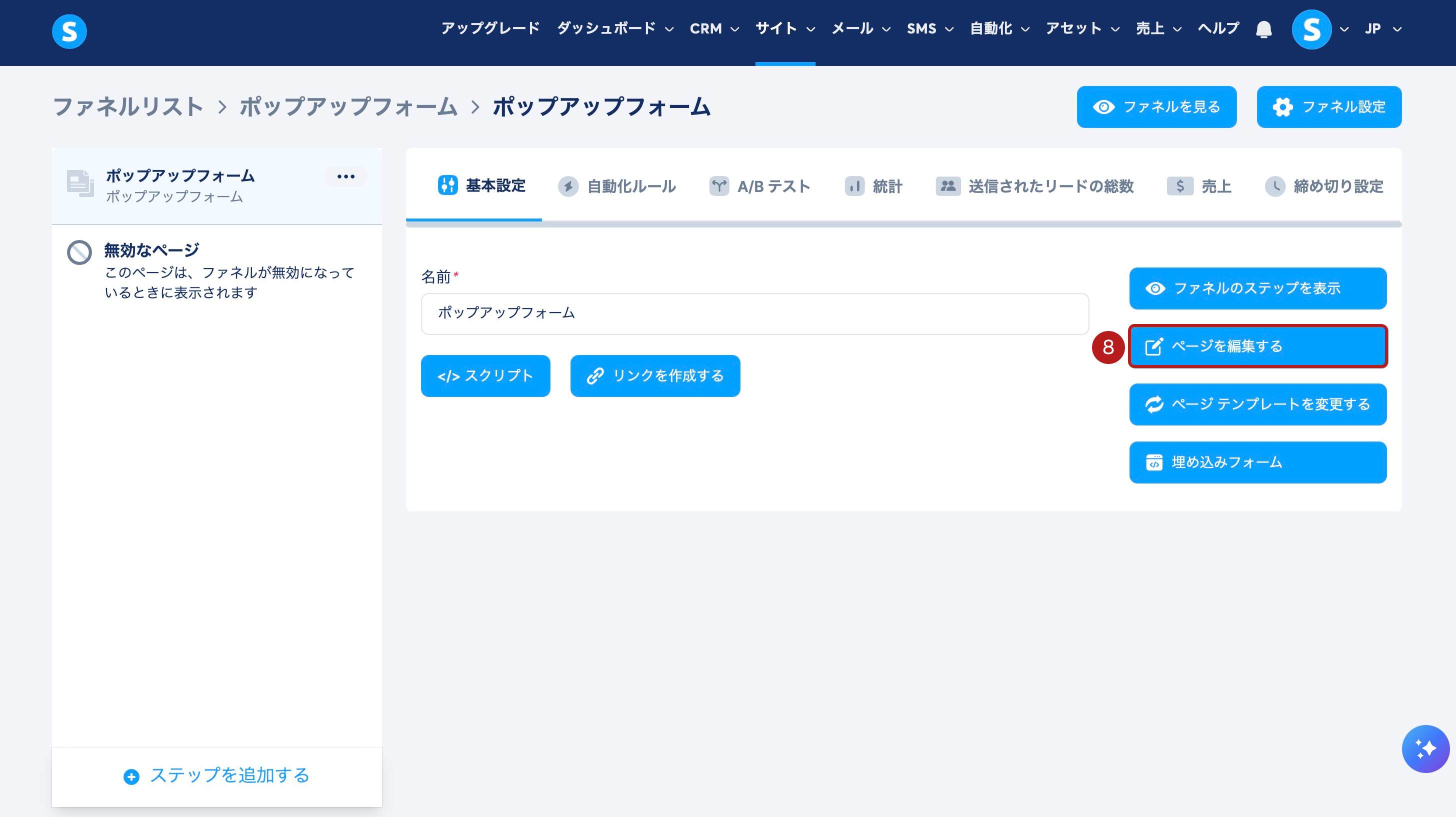 ポップアップフォームをカスタマイズするために、ページを編集する(8)をクリックしてページエディターに移動します。