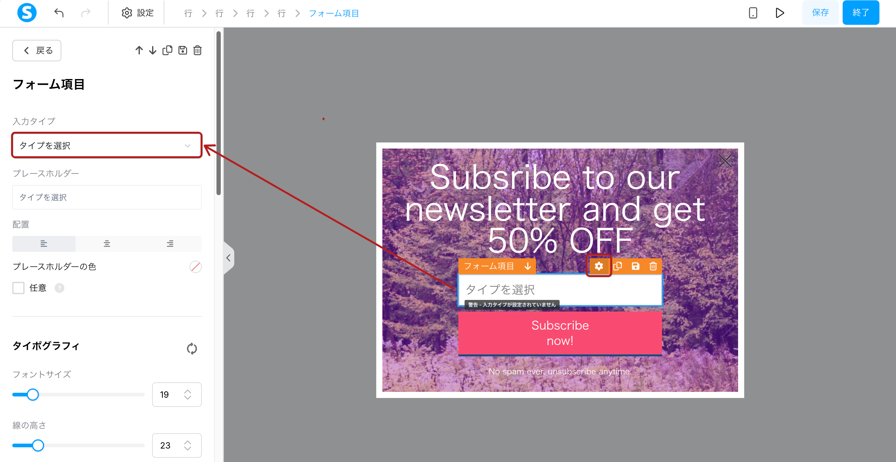 フォーム入力要素を選択し、次に設定(歯車)アイコンをクリックしてフィールド(フォーム入力項目)を設定します。ドロップダウンリストから収集したい入力タイプを選択します。