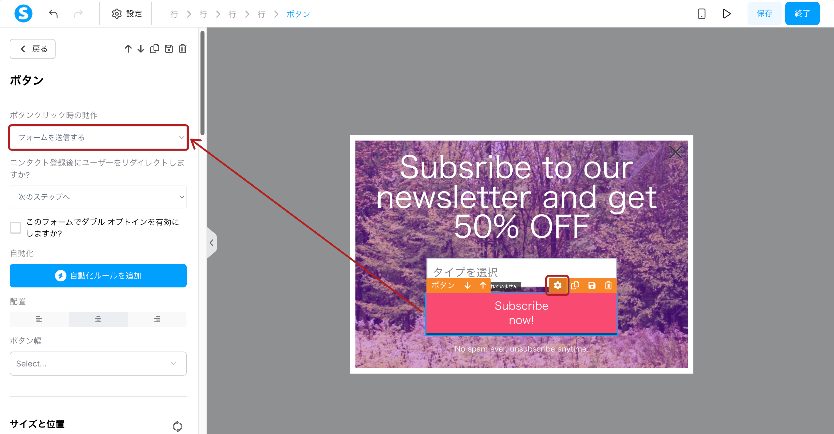 あわせて、ボタンのアクションも設定する必要があります。ボタンを選択し、ユーザーがフォームを送信した後の動作を指定します。
