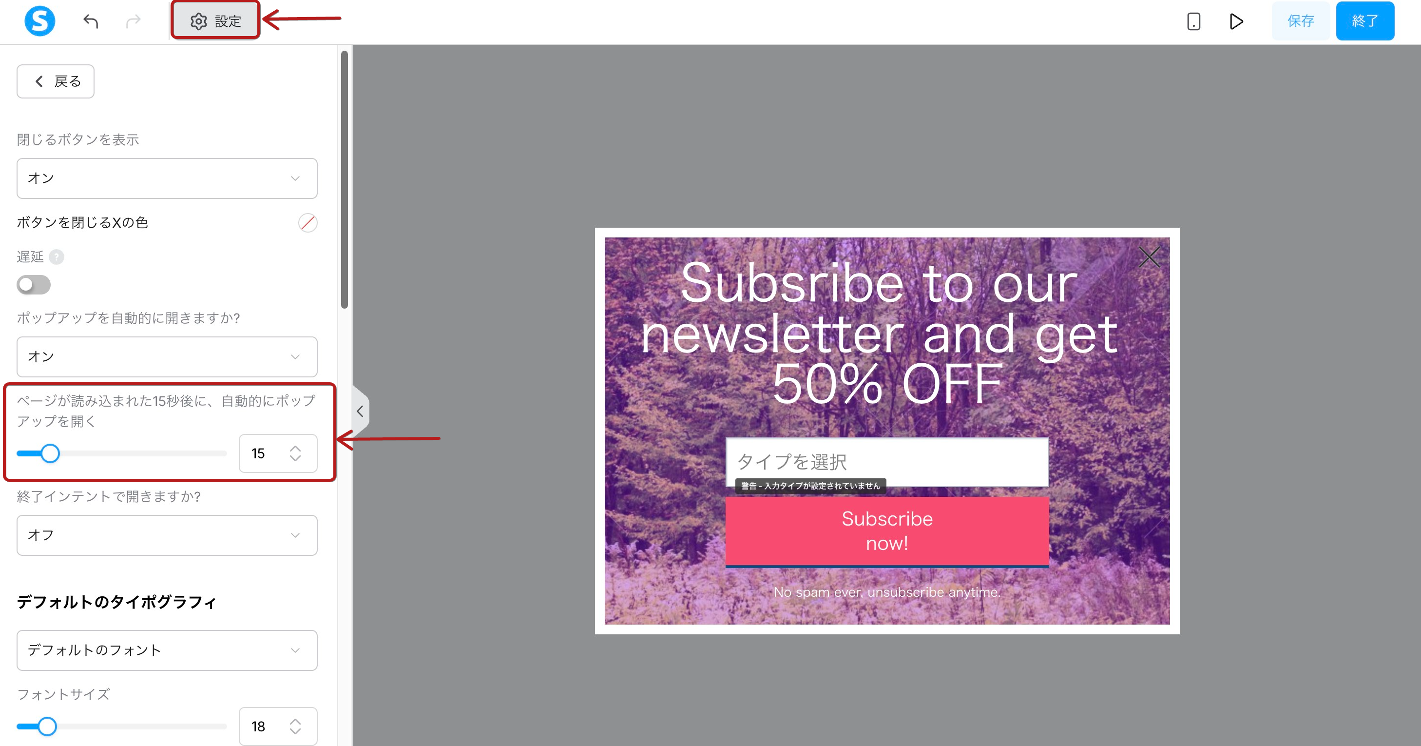 ブログページ上でコンタクトフォームを表示するタイミングも設定できます。この時間はエディター内で調整でき、指定する時間は秒単位です。