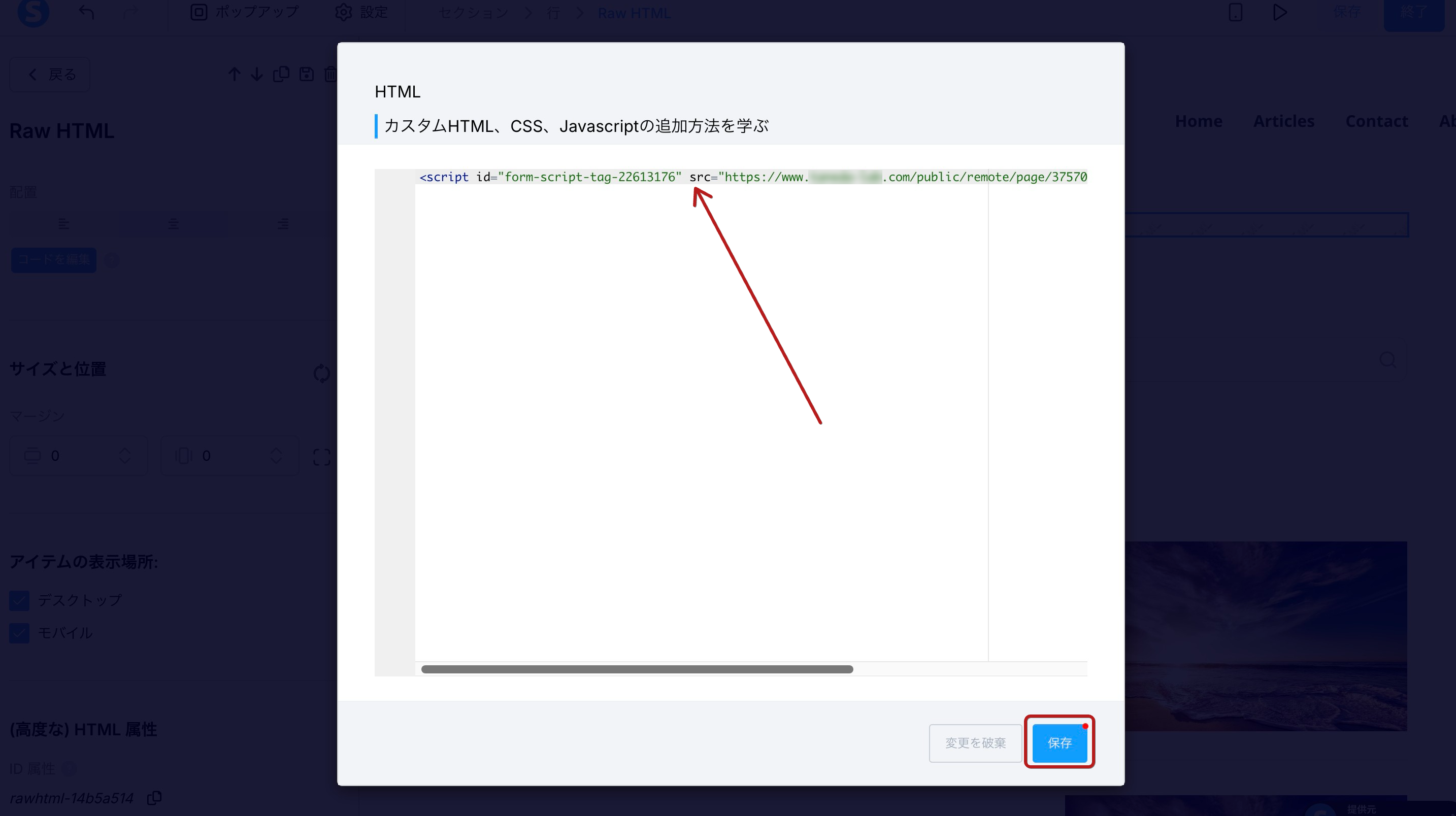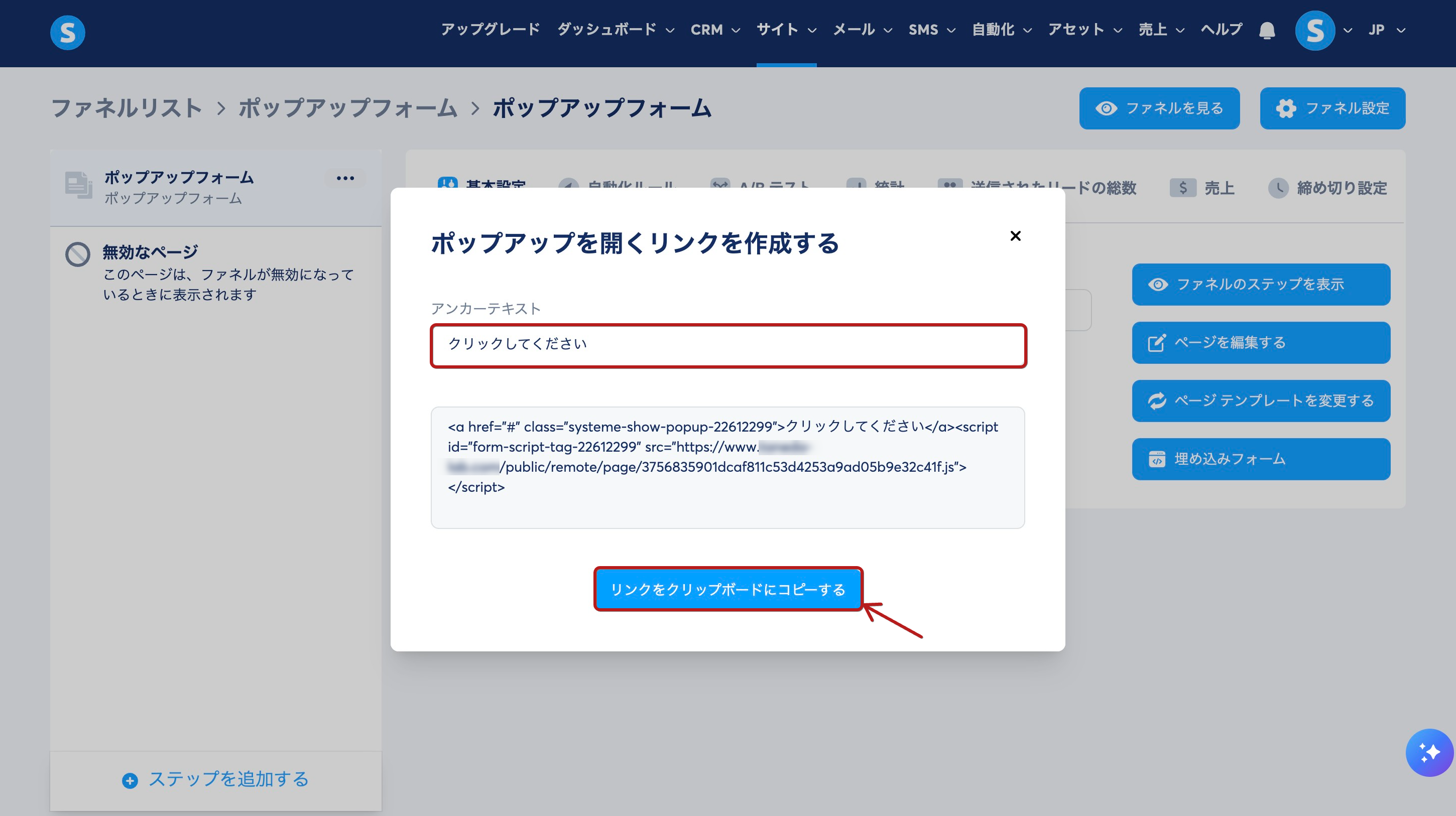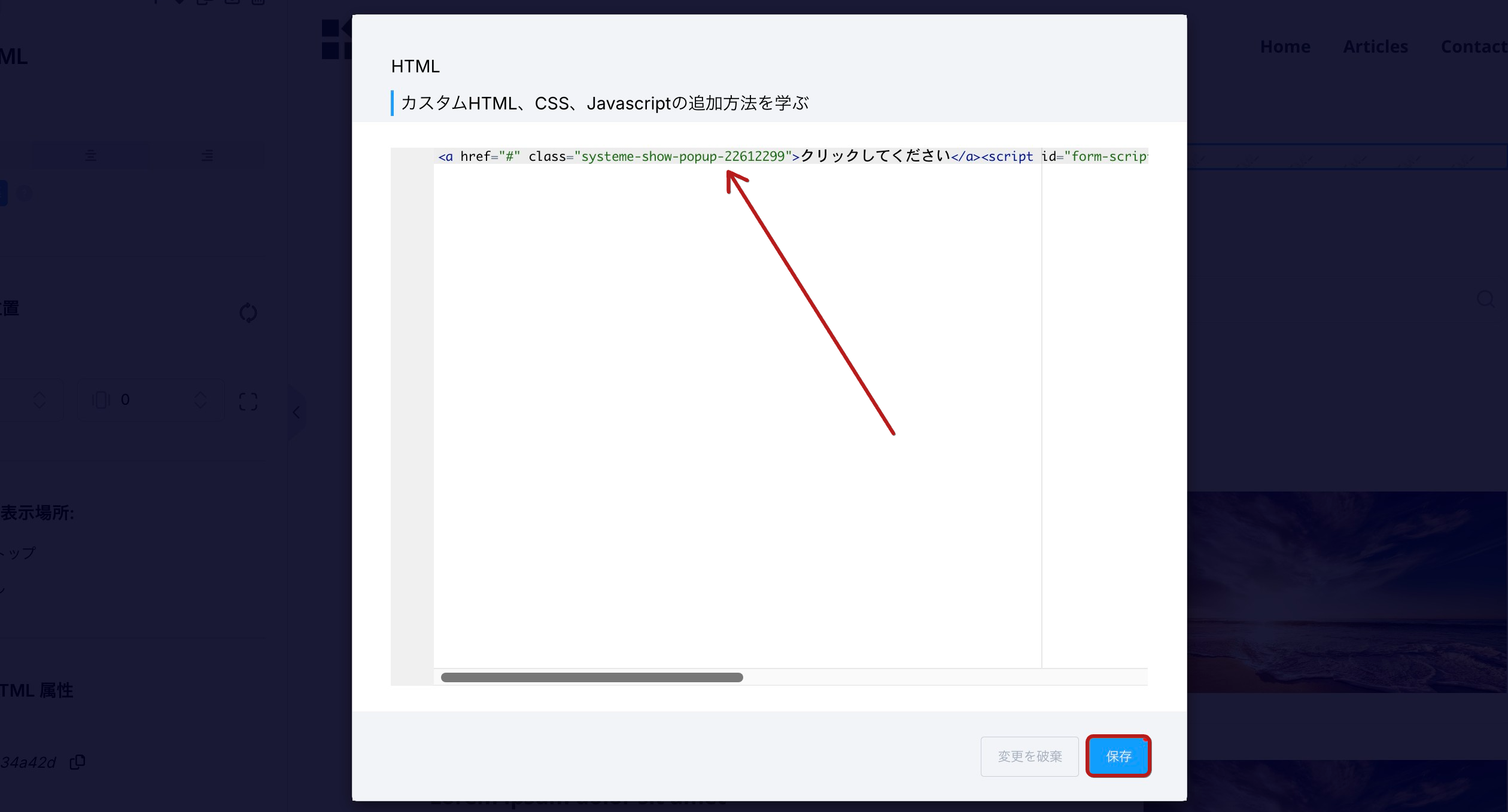 コードを編集をクリックし、ポップアップフォームを開くリンクのスクリプトを貼り付けてから保存をクリックします。