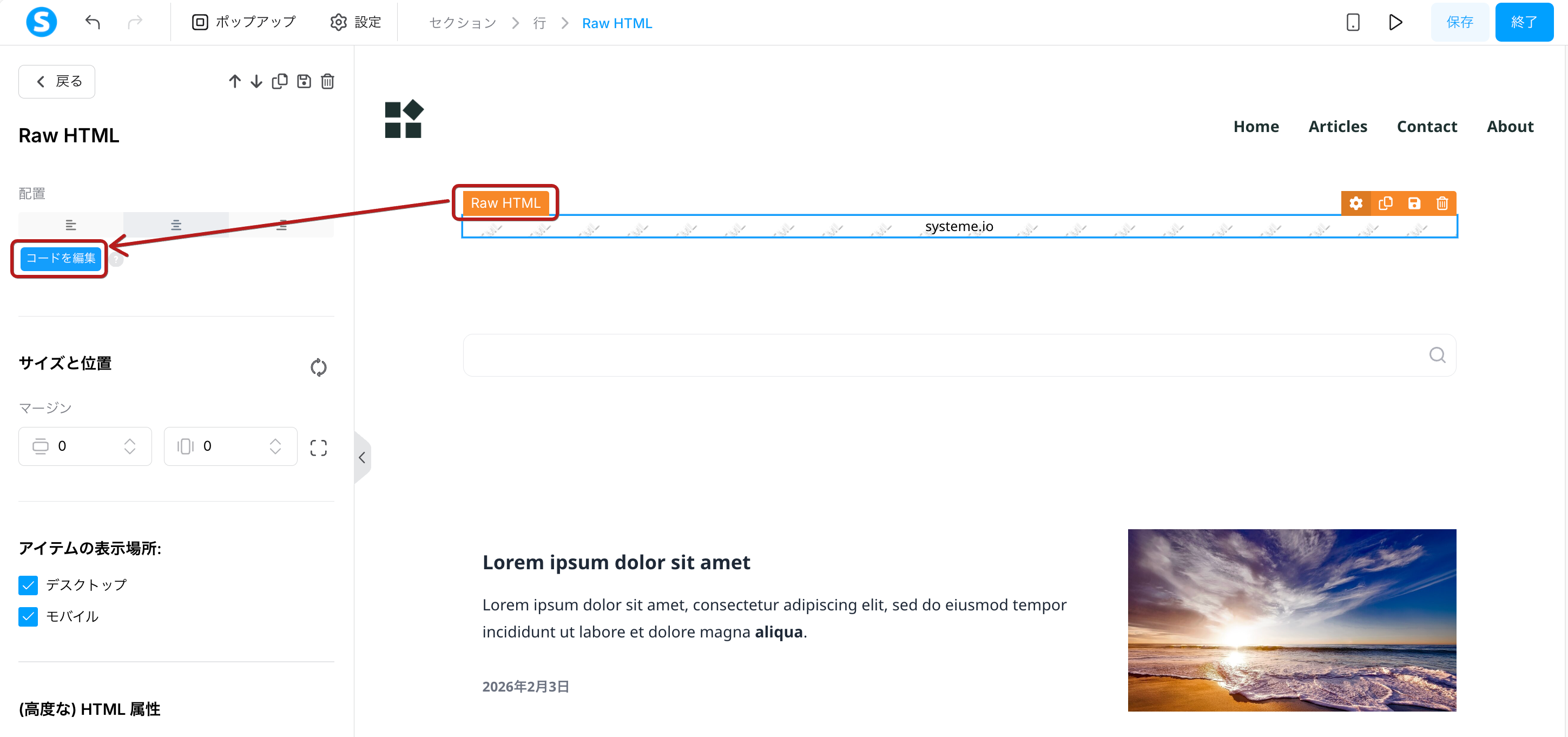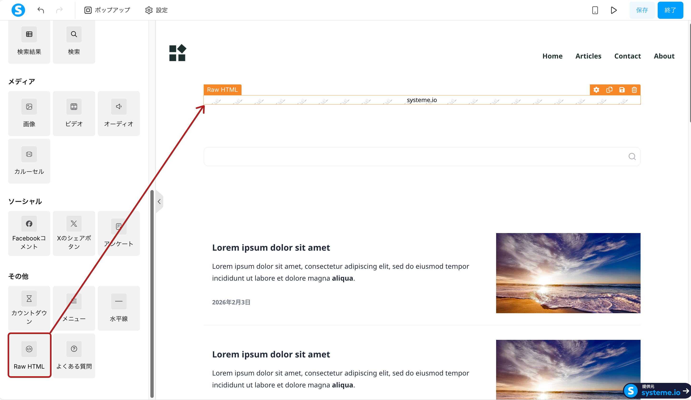 次に、ブログページ上にRaw HTML要素をドラッグ&ドロップします。
