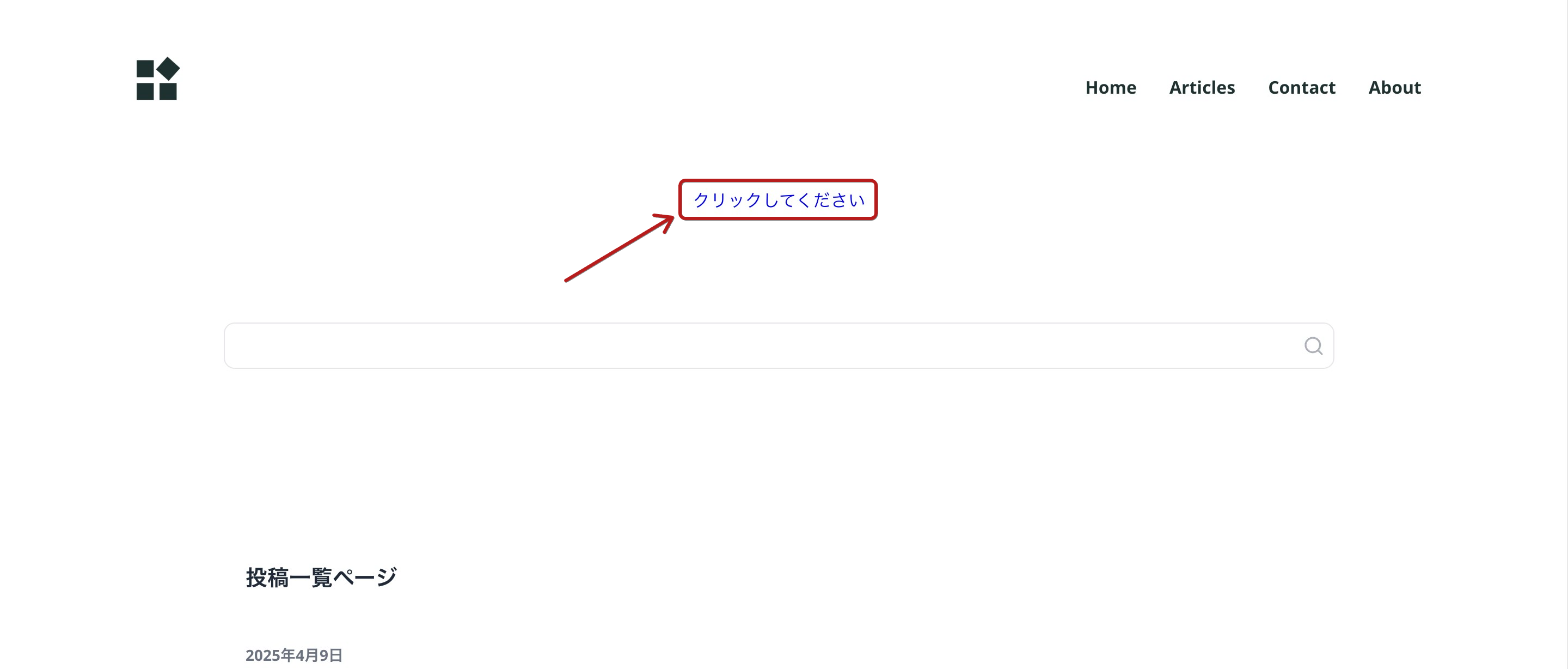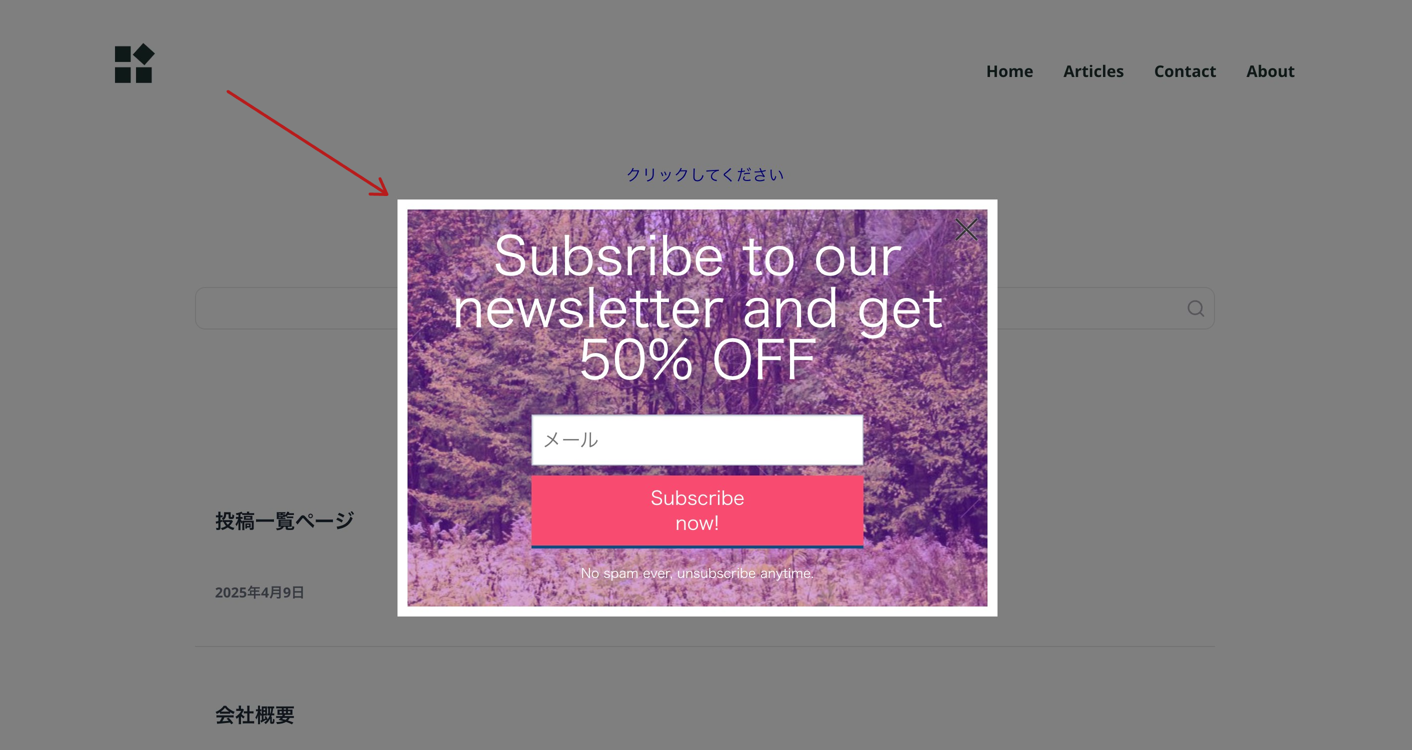 その後ブログページをプレビューすると、以下のようにクリックしてくださいというテキストが表示され、それをクリックすると、ポップアップフォームが表示されることを確認できます: