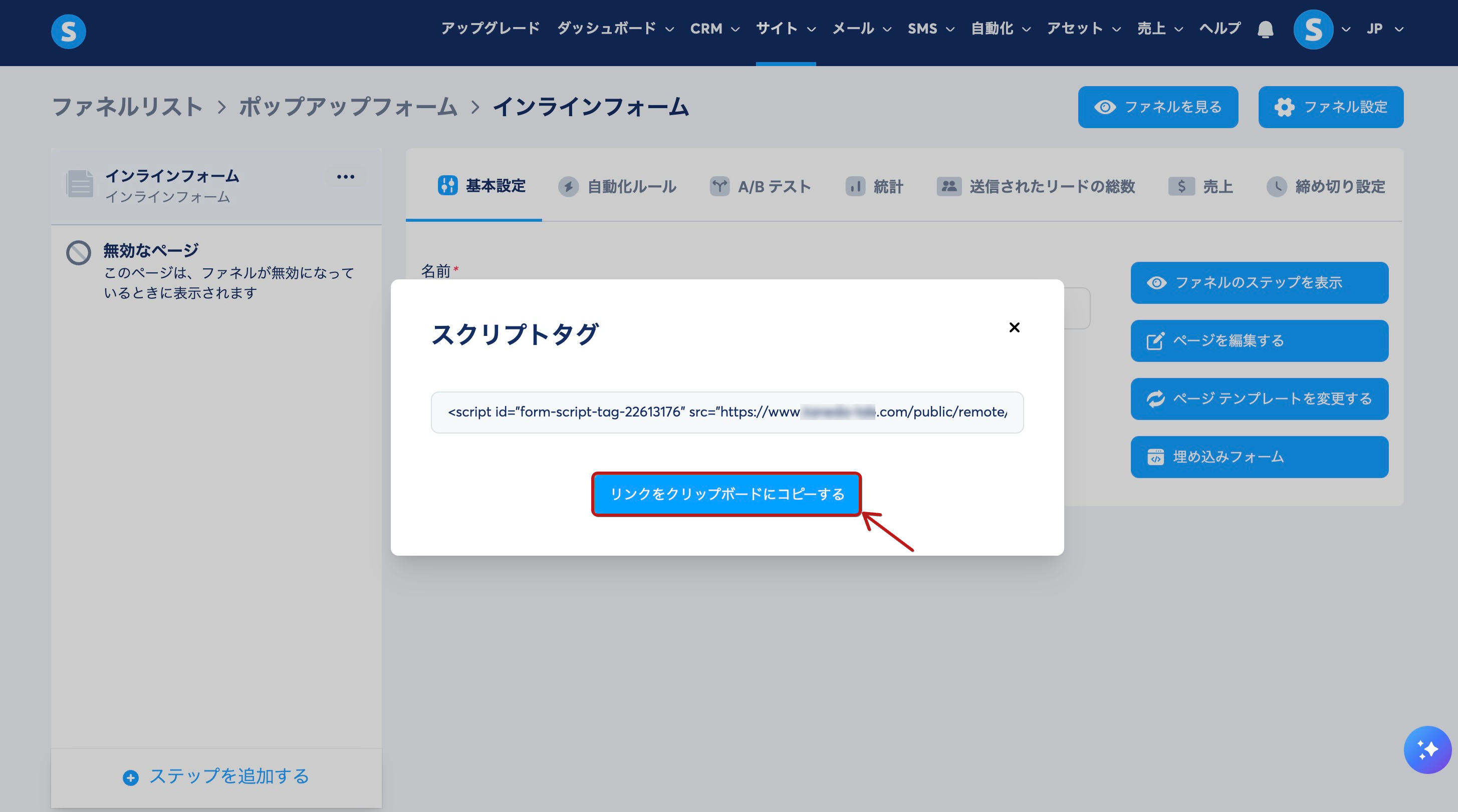 インラインフォームページへのリンクが表示されたポップアップが開きます。リンクをクリップボードにコピーするをクリックします。