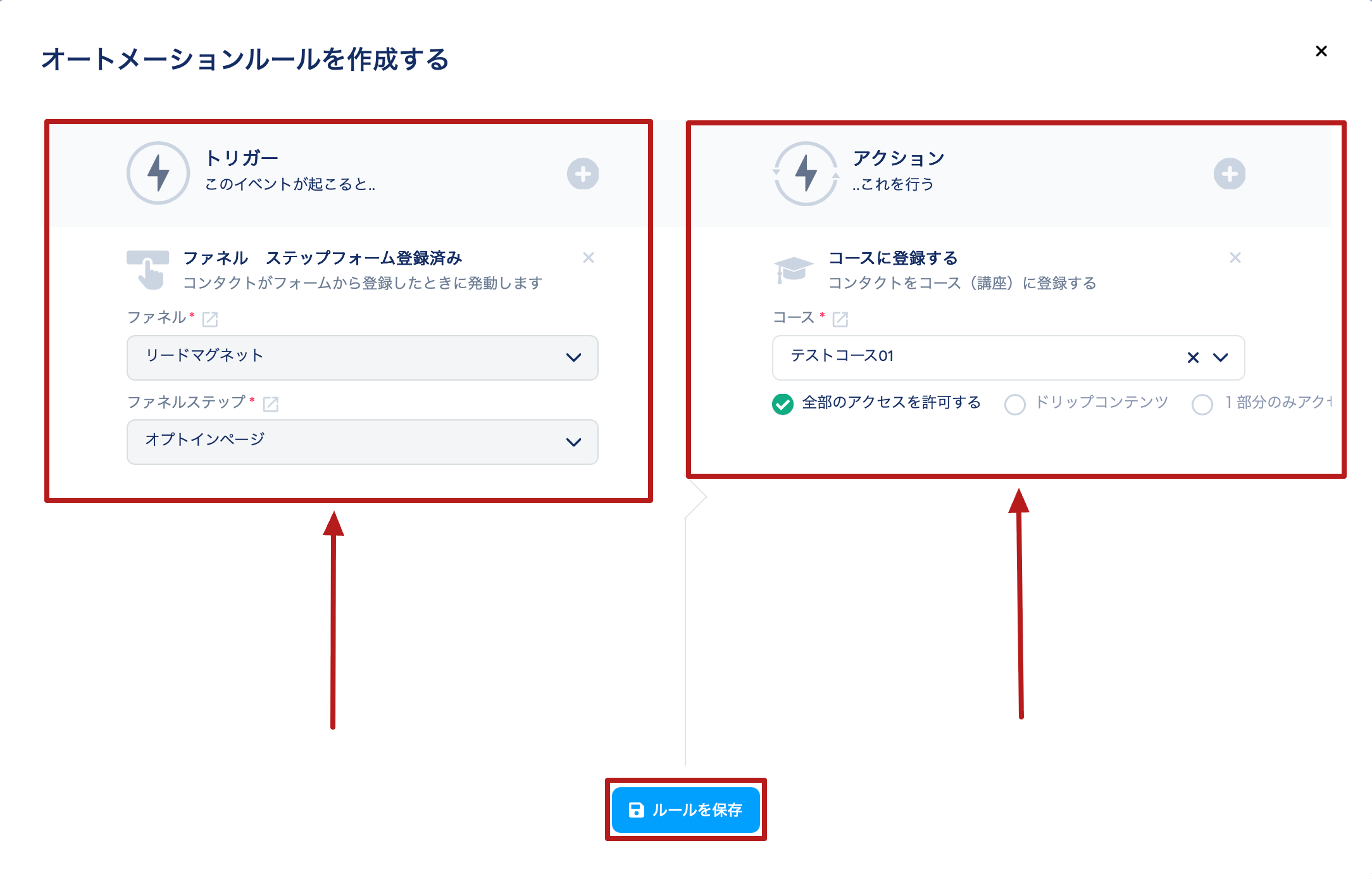 これで、オプトインページでオプトインした受講生がフォームを送信ボタンをクリックすると、自動化ルールがトリガー(発動)され、受講生は自動的にコースに登録されます。