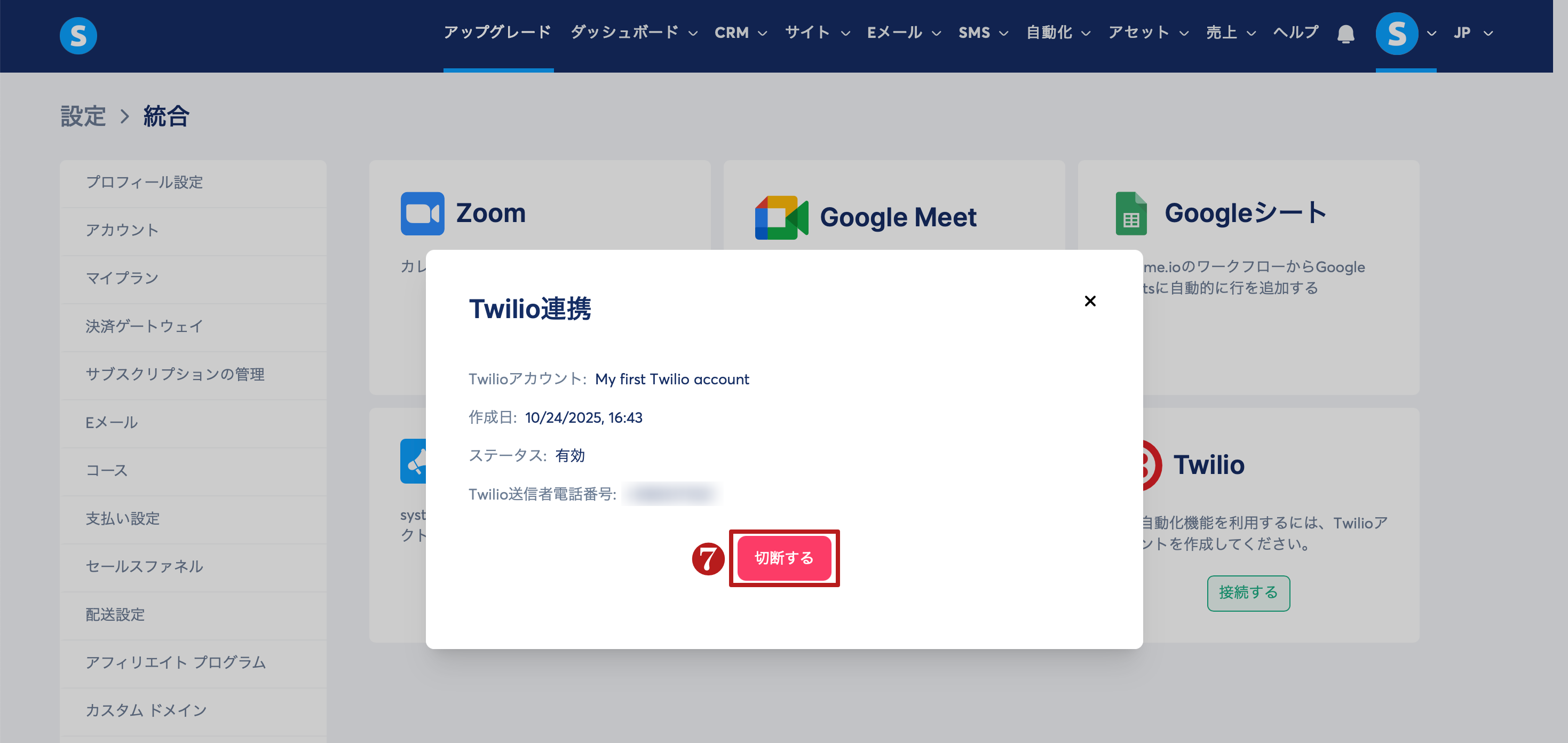 接続後、Twilioをクリックすると、上記で述べたアカウント情報を確認できます。また、必要に応じて切断する (7) をクリックすることで Twilioアカウントの接続を解除することもできます。