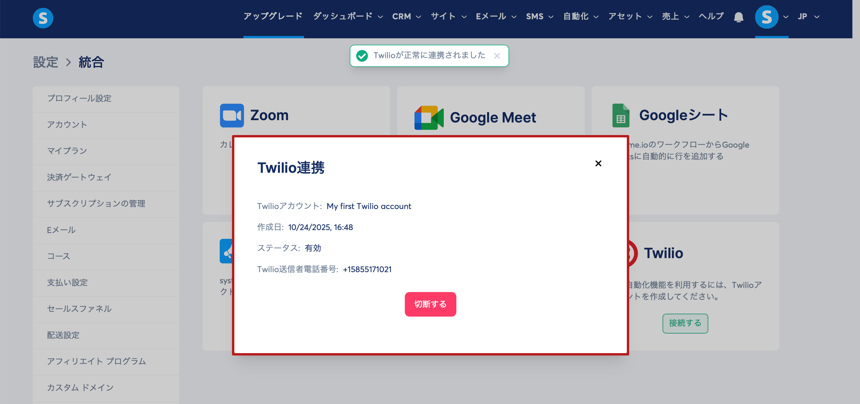 「保存」をクリックすると、ポップアップが表示され、連携(統合)の作成日時、ステータス、およびTwilio送信者電話番号などの情報が表示されます。