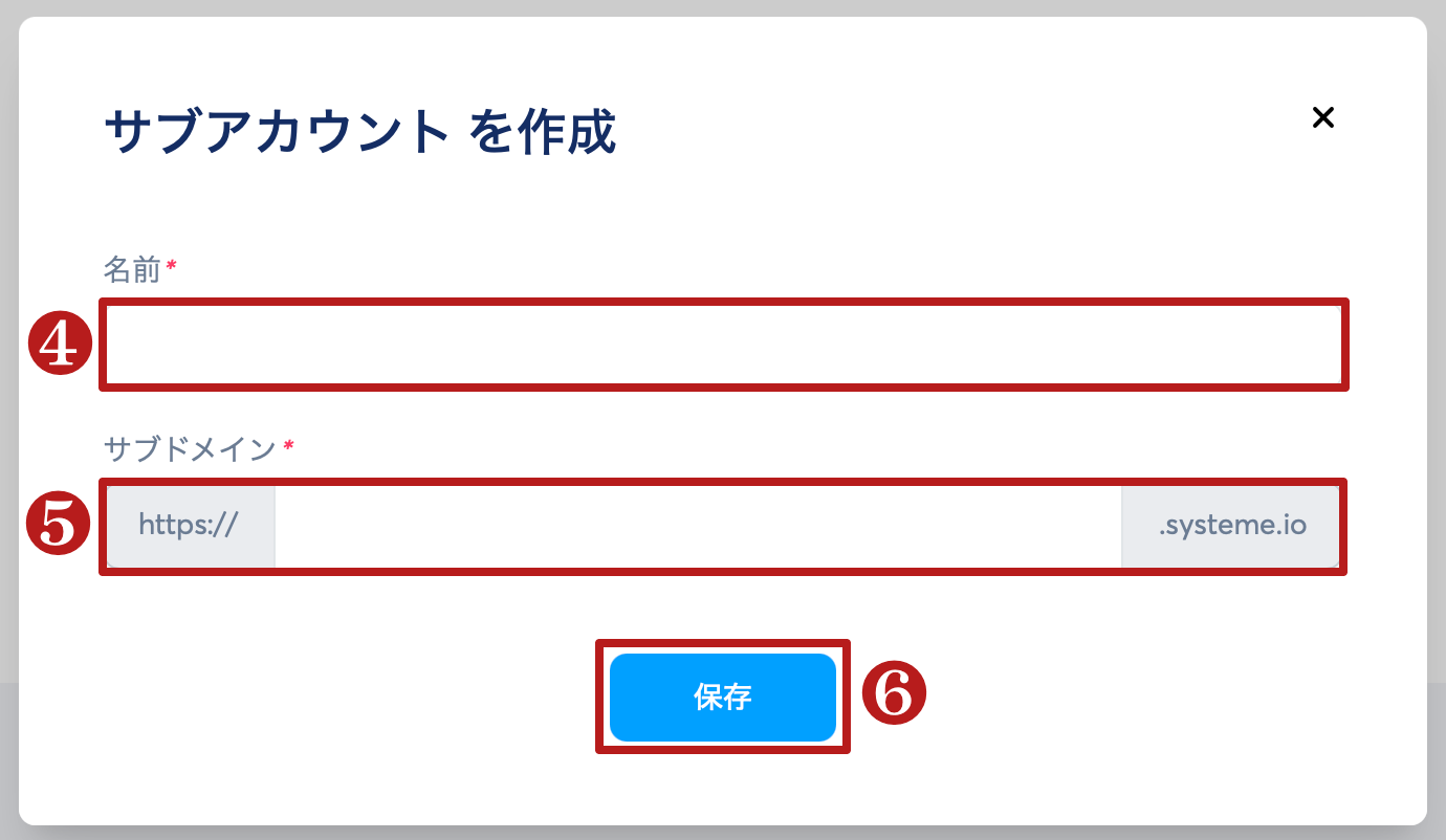 - 名前 : サブアカウントに名前を割り当てます(必須)。(4)