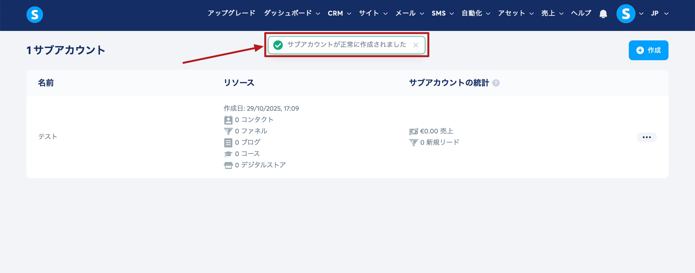 - サブアカウントの作成を保存すると、画面上部に「サブアカウントが正常に作成されました」というメッセージが表示され、サブアカウントの作成が確認されます。