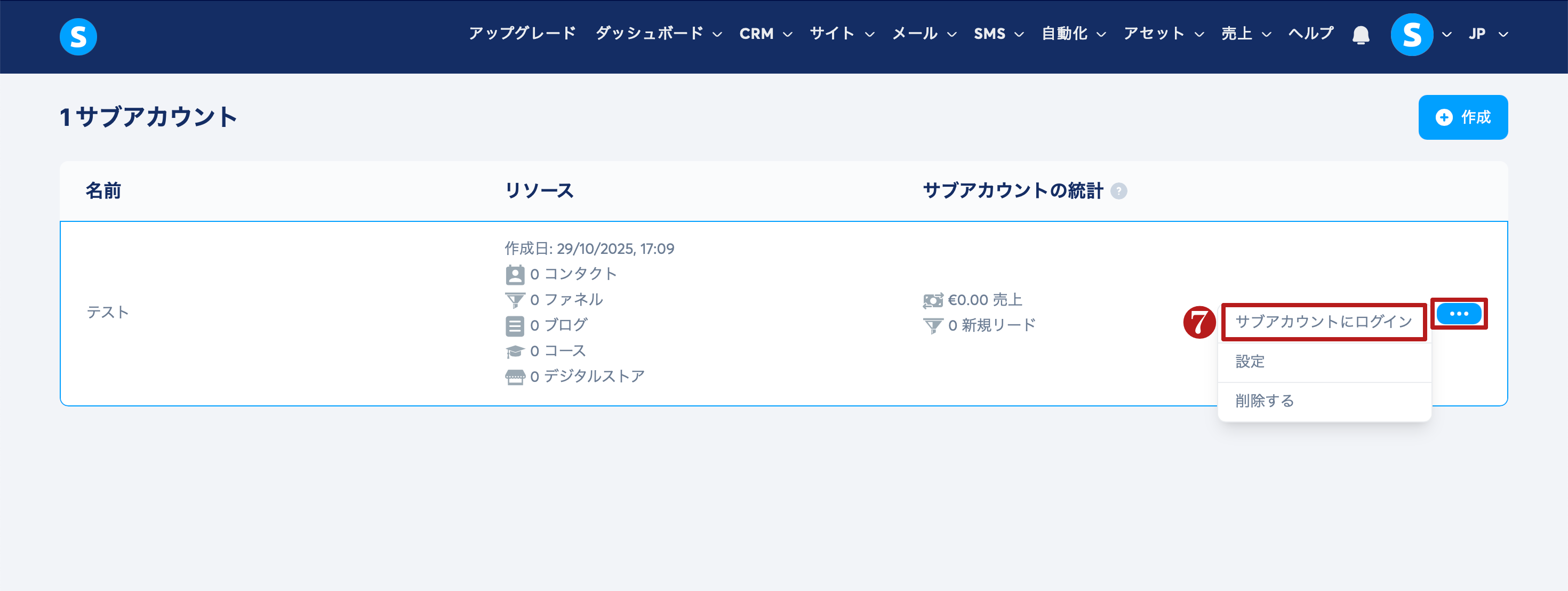 - 作成したサブアカウントの行で、右側の3つの点をクリックし、サブアカウントにログインを選択して使用を開始します。(7)