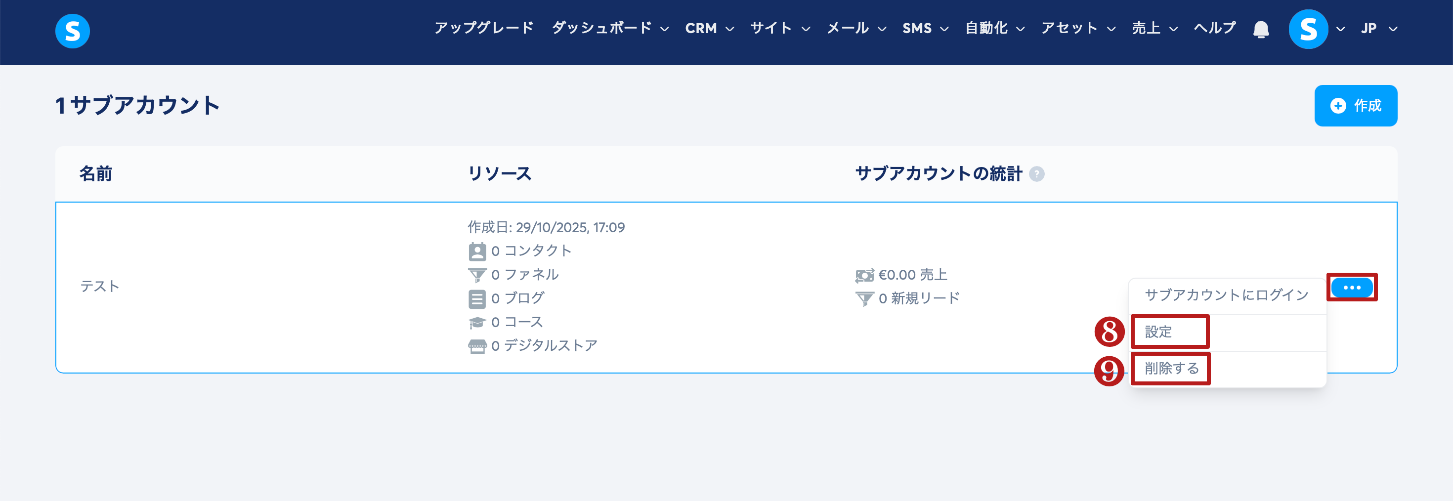 - サブアカウントの名前を変更するには、設定セクション(8)をクリックします。また、削除するをクリックしてサブアカウントを削除できます(9)。