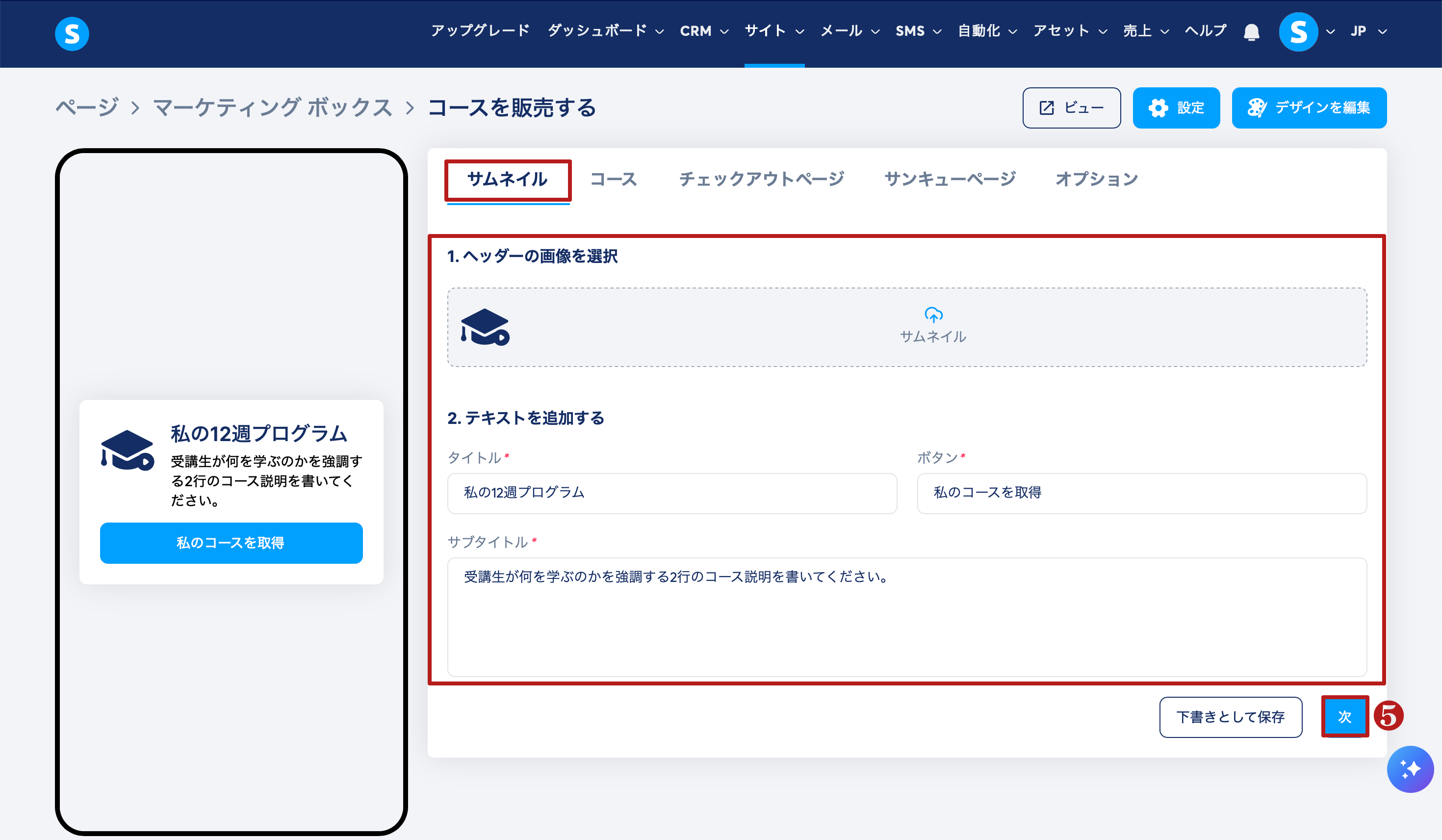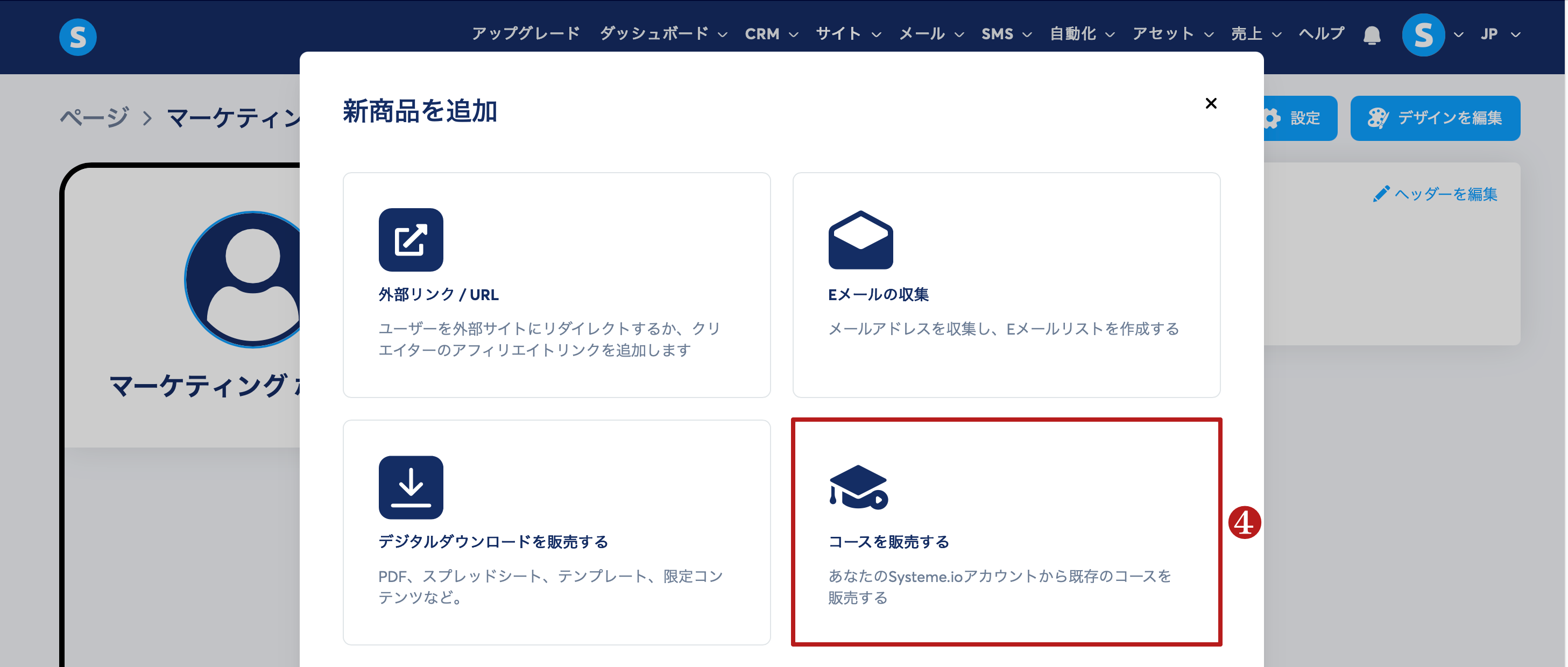コースを販売する(4)を選択します。