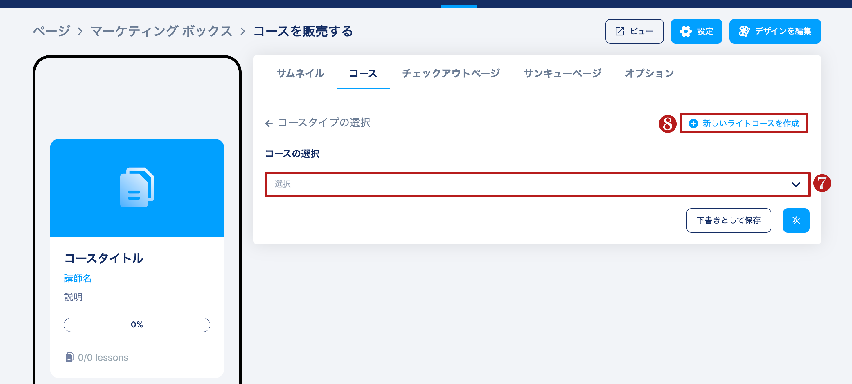 既存のコース(7)を選択するか、新しいライトコースを作成(8)をクリックします。