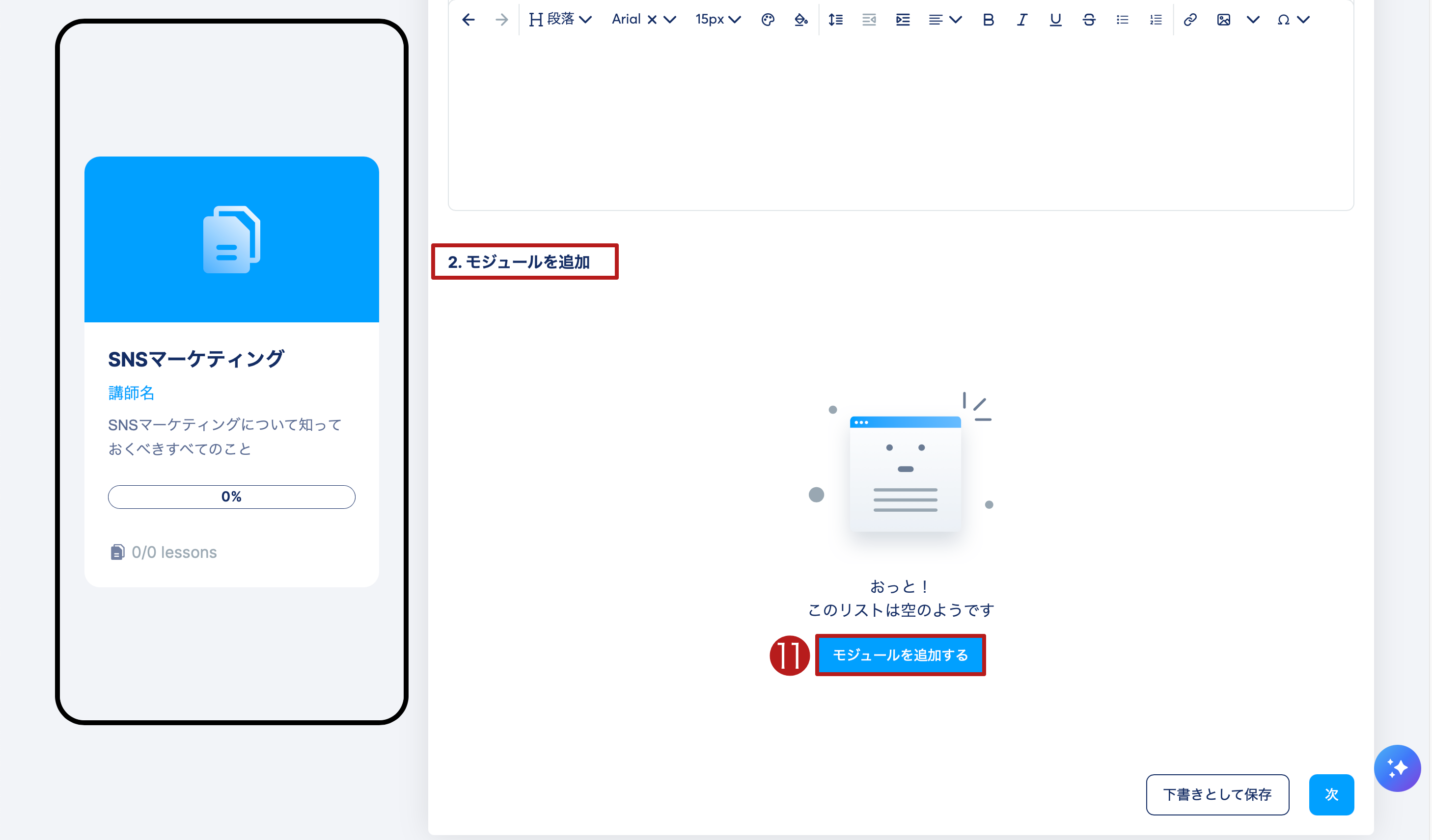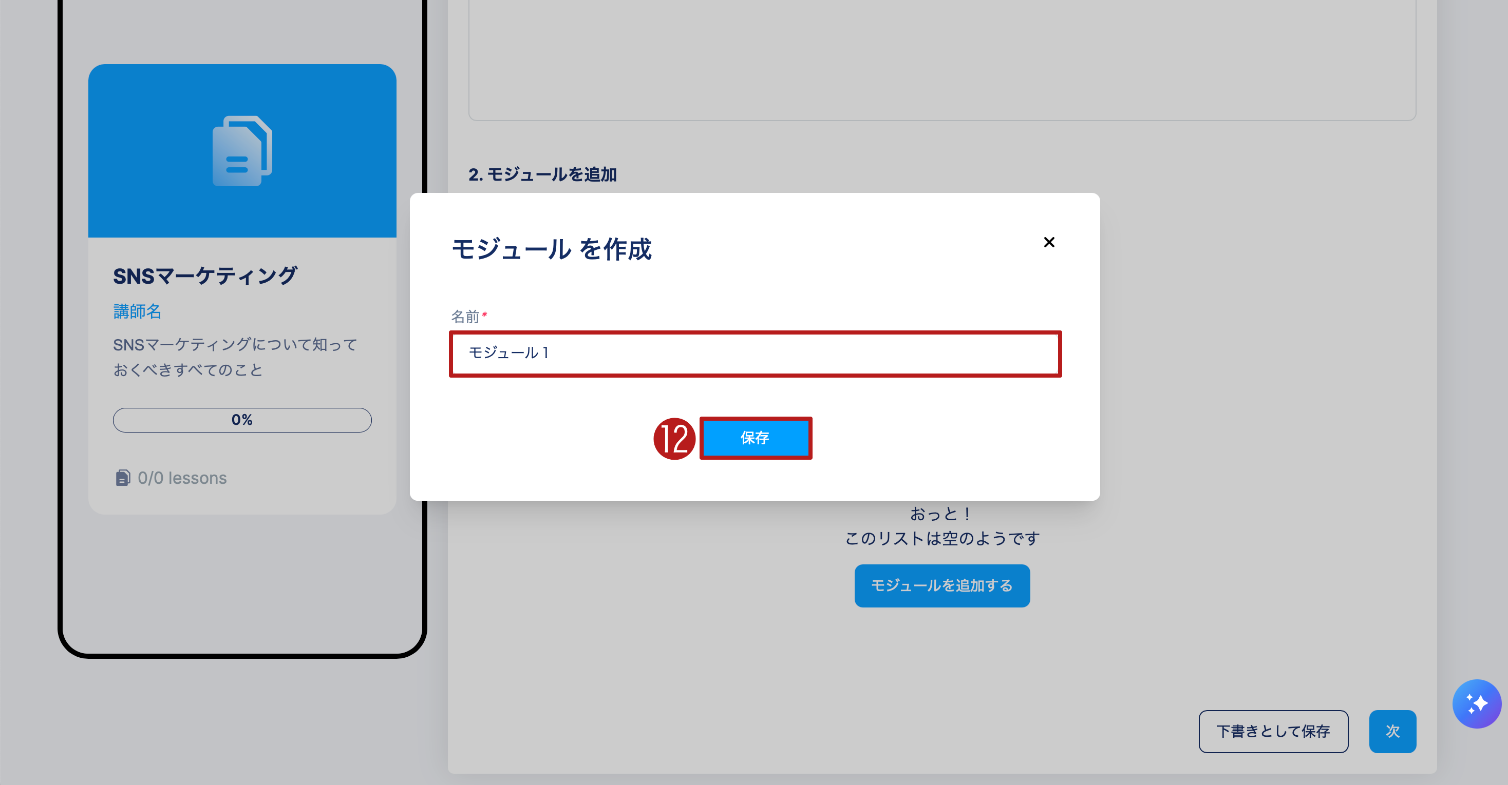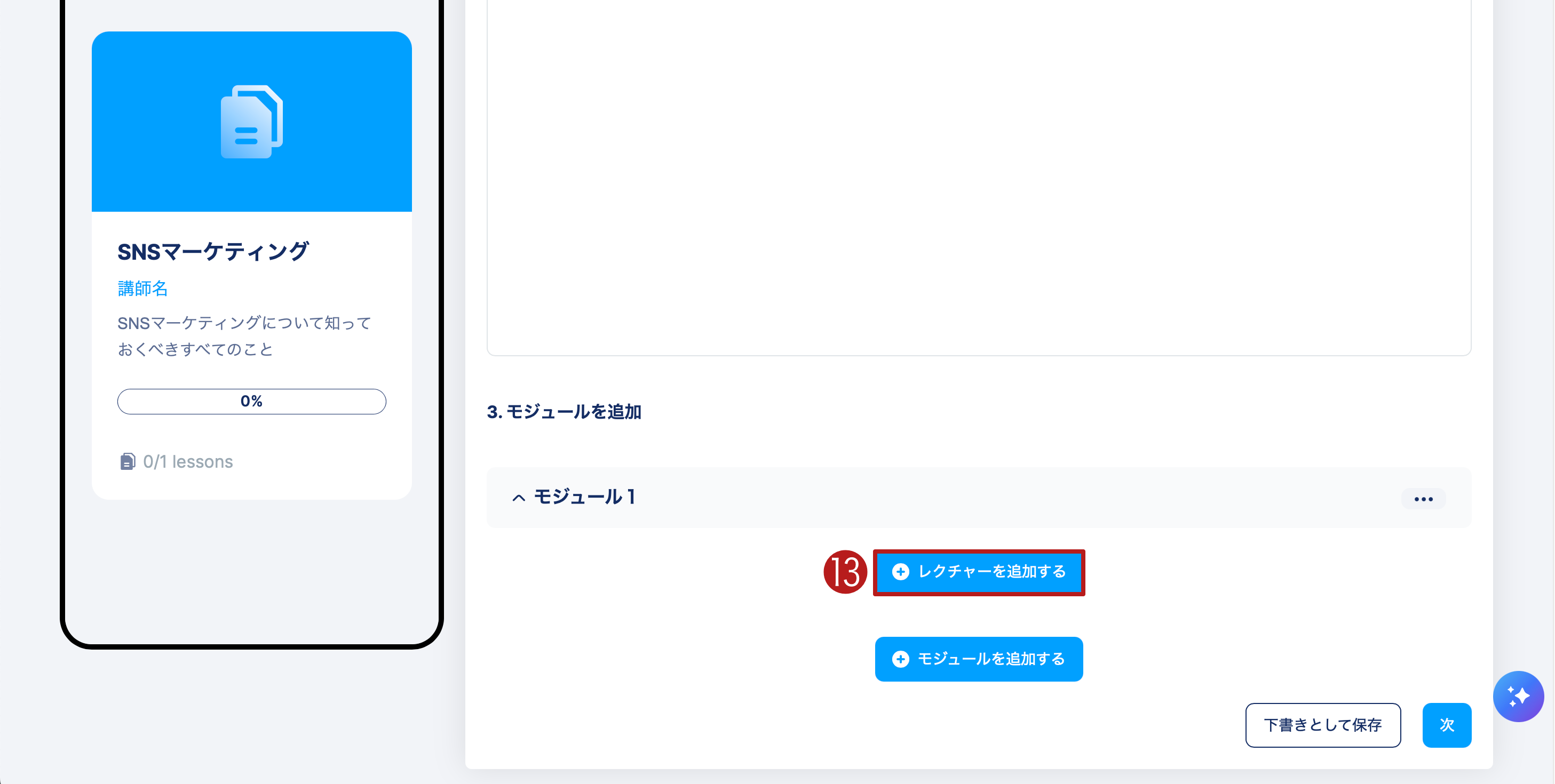 レクチャーを追加する(13)をクリックして、モジュールにコンテンツを追加します。