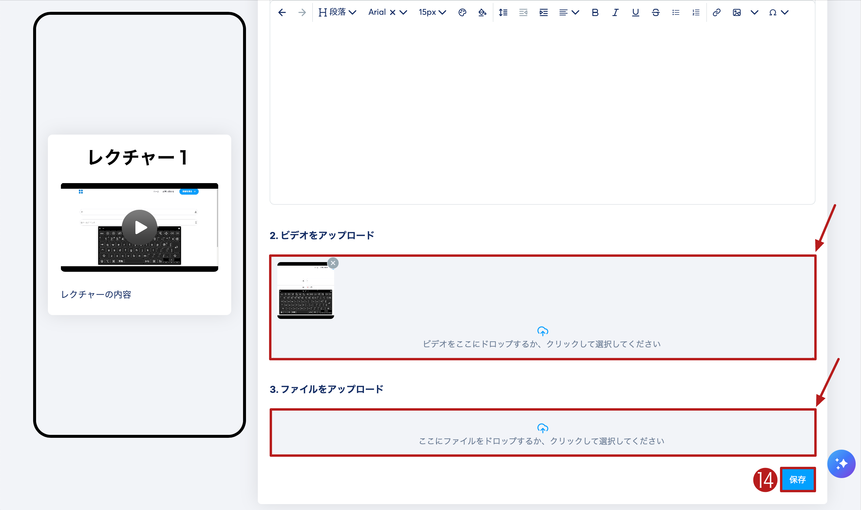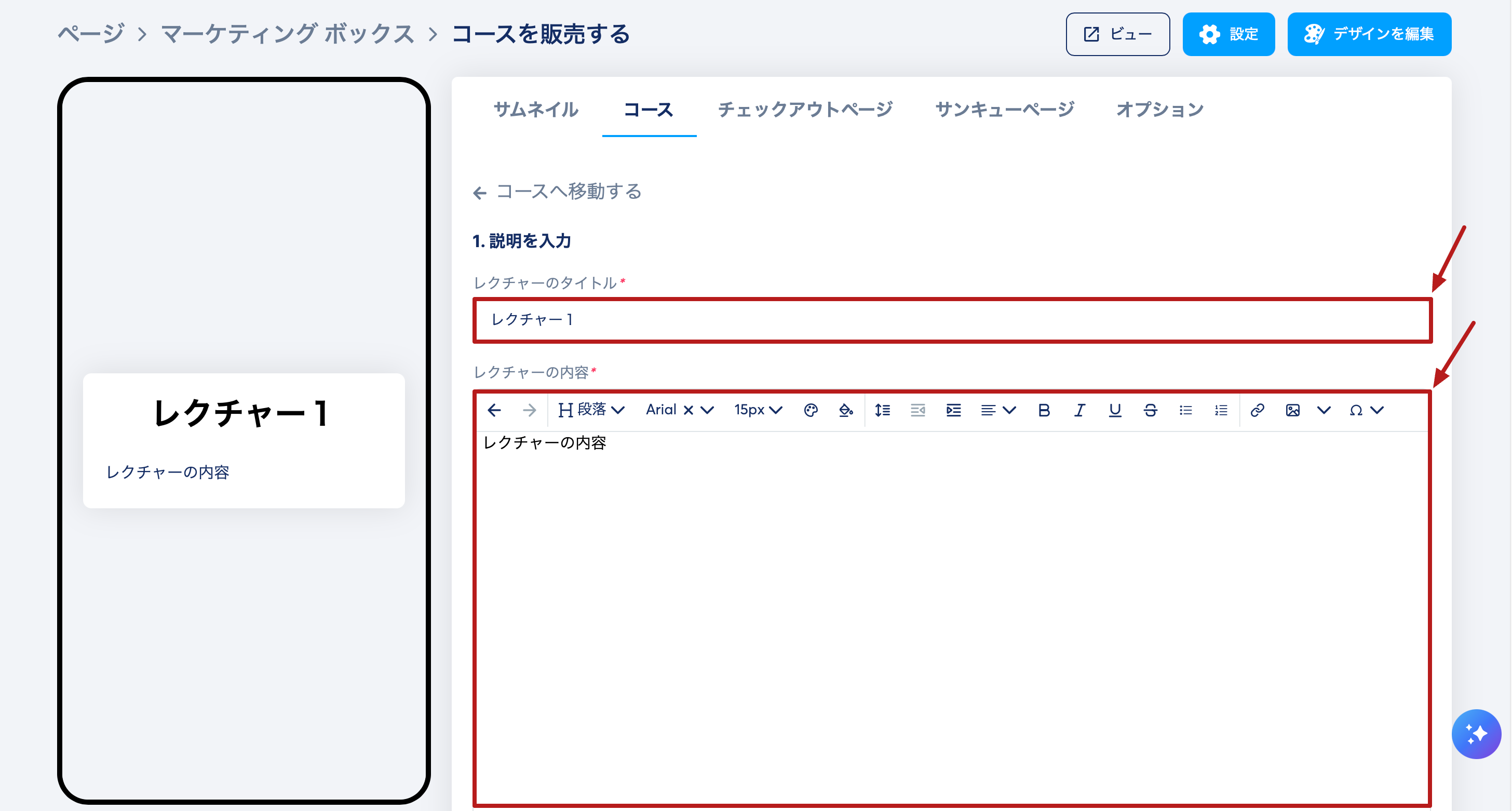 レクチャーのタイトルと本文テキスト(レクチャーの内容)を追加します。